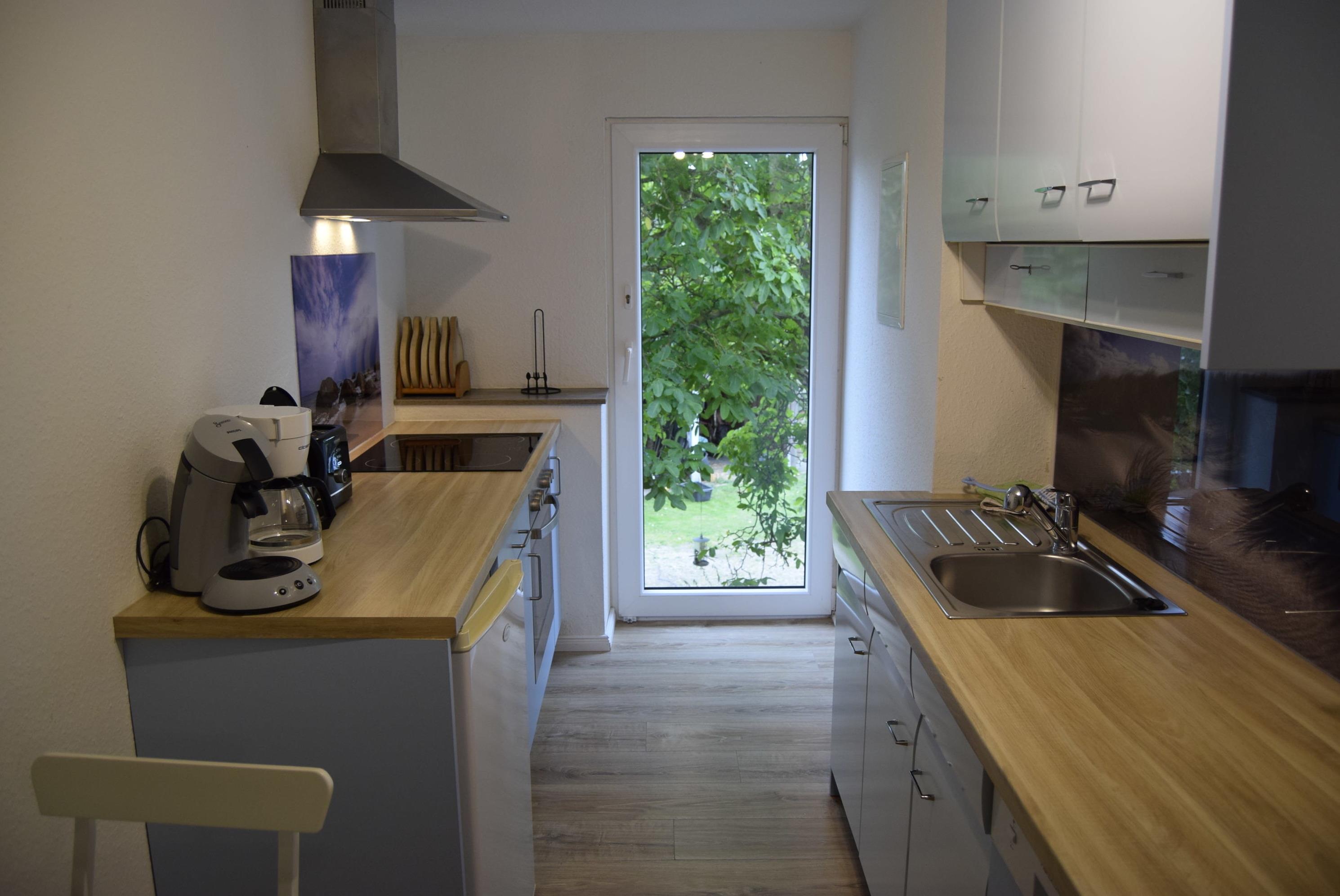 In der separaten Küche finden sich über den Toaster, Wasserkocher und der Kaffeemaschine natürlich auch ein Backofen sowie ein Geschirrspüler. Ausreichend Geschirr und Besteck sind selbstverständlich. Für das kleine Frühstück zu zweit steht hier auch noch ein Tisch bereit.