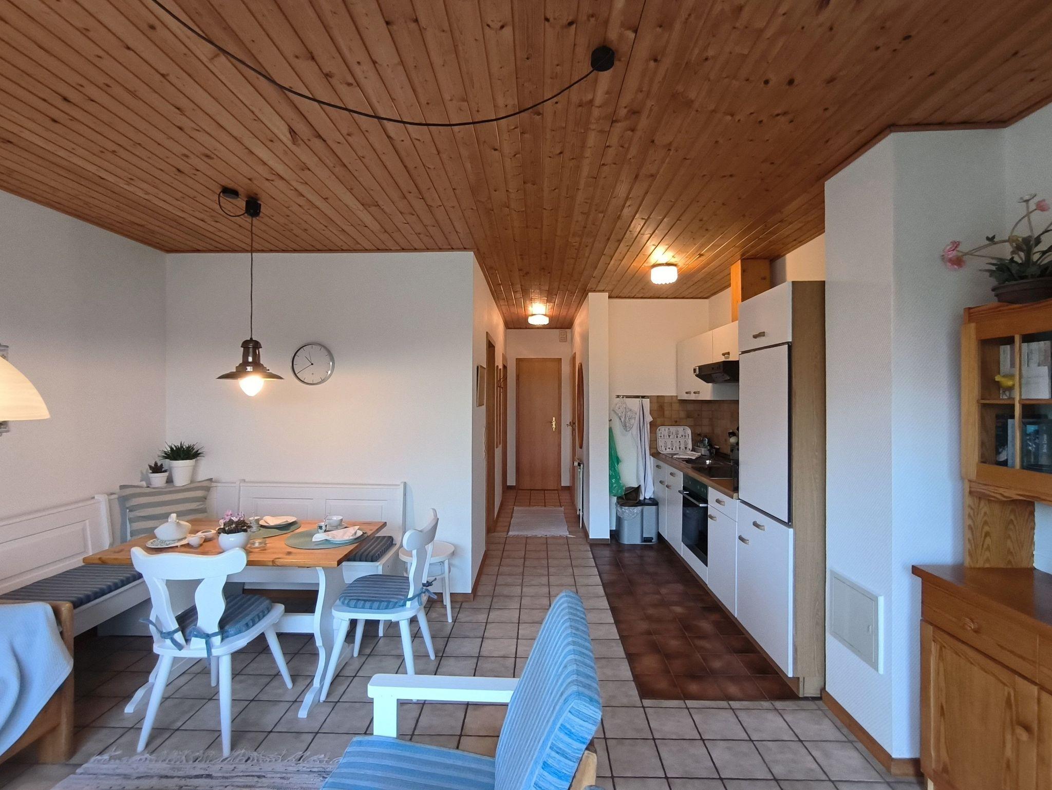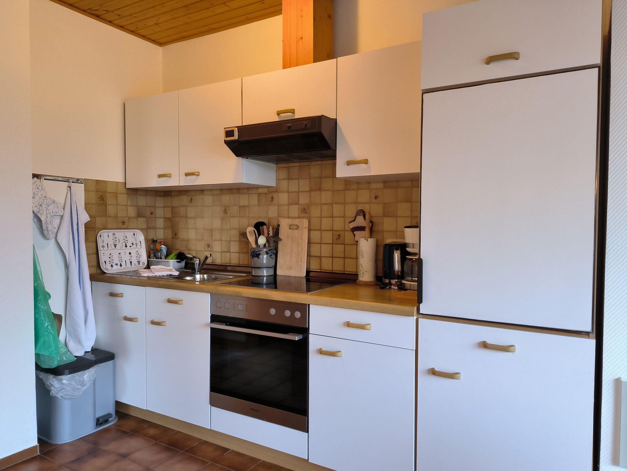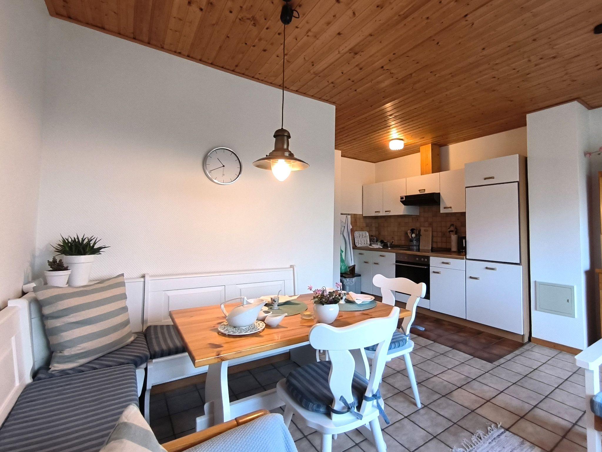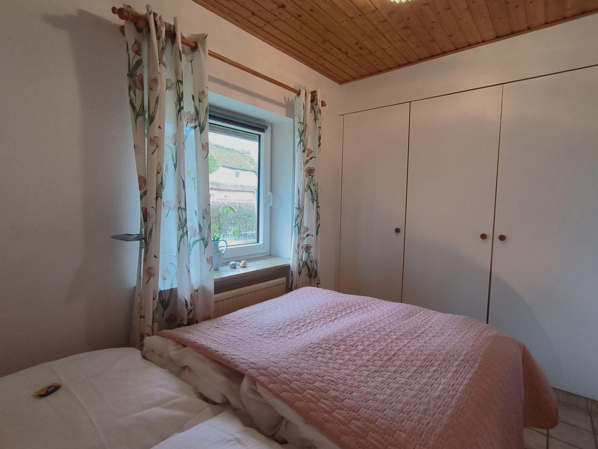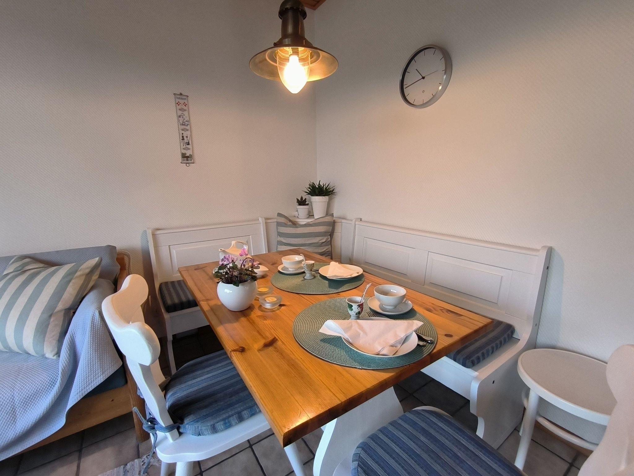 Die Ferienwohnung im Erdgeschoss besteht aus einem großzügigen Wohnzimmer mit offener Küche, einem kleinen Schlafzimmer, einem Duschbad, einem kleinen Hauswirtschaftsraum mit Staumöglichkeiten, dem Flur und der möblierten Terrasse. Das Schlafzimmer verfügt über ein französiches Doppelbett (1,40x2,00m), einen großen, eingebauten Kleiderschrank und ist verdunkelbar und sehr ruhig gelegen. Im Wohnzimmer gibt es eine Sitzecke mit TV, einen Esstisch mit Eckbank und eine Küchenzeile mit Kühlschrank, Herd, Backofen, Spüle und ausreichend Küchenutensilien zum Zubereiten von leckeren Urlaubsmahlzeiten. Eine Spülmaschine ist nicht vorhanden. Das Bad mit Fenster hat eine Dusche, eine Toilette und einen Waschtisch - ein Föhn ist auch vorhanden. Eine Waschmaschine im Erdgeschoss kann von allen Gästen gegen eine kleine Gebühr genutzt werden, auch Fahrräder zum Leihen und der Grill im Garten stehen allen Feriengästen zur Verfügung. Die Betten sind bei Ankunft bereits bezogen und Handtücher sind ebenso vorhanden.