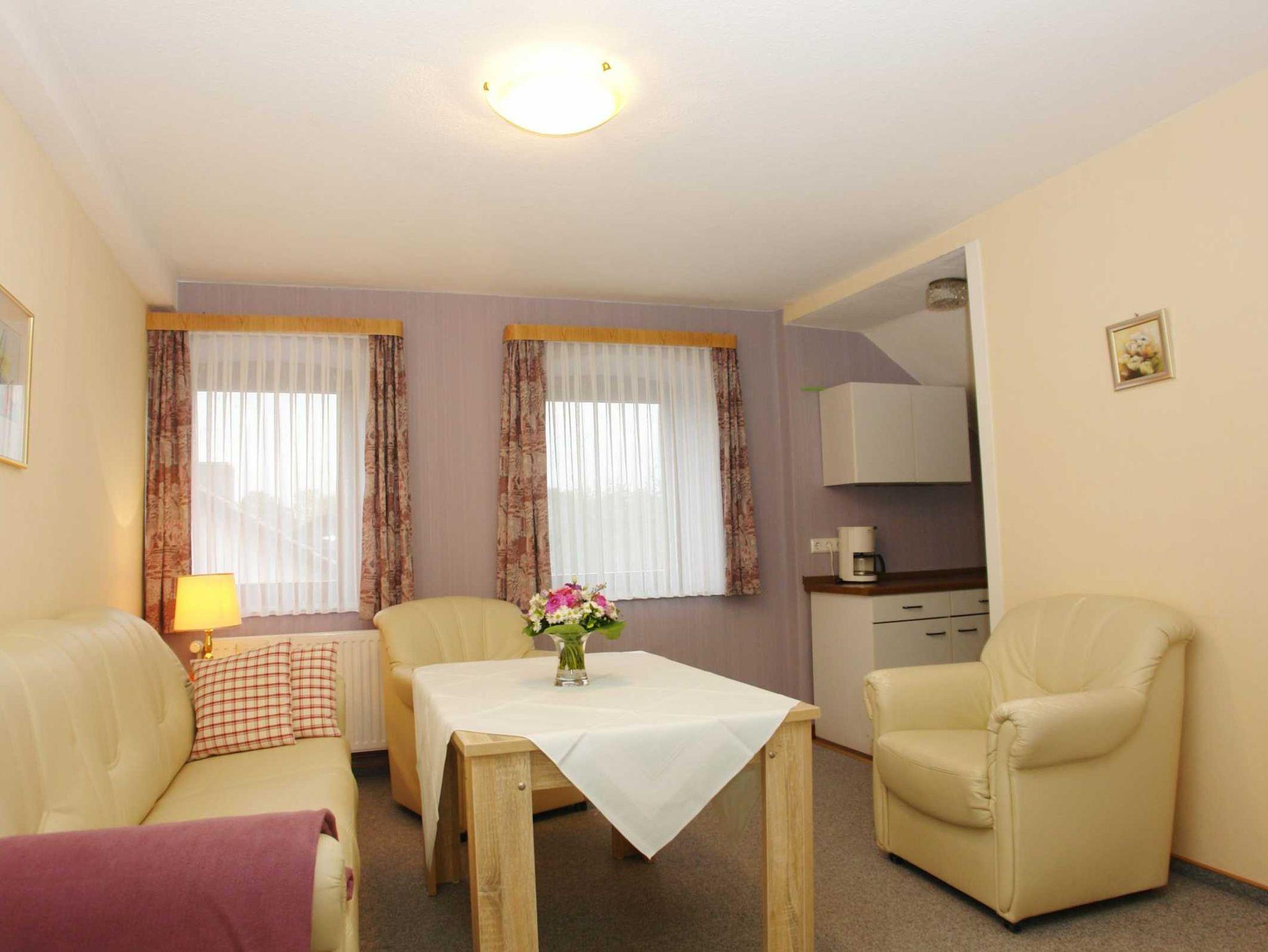 Gemütlich eingerichtet erwartet im Obergeschoss die Ferienwohnung 4 bis zu 4 Gäste. Fußböden überwiegend mit Teppich sorgen für ein wohliges Ambiente.