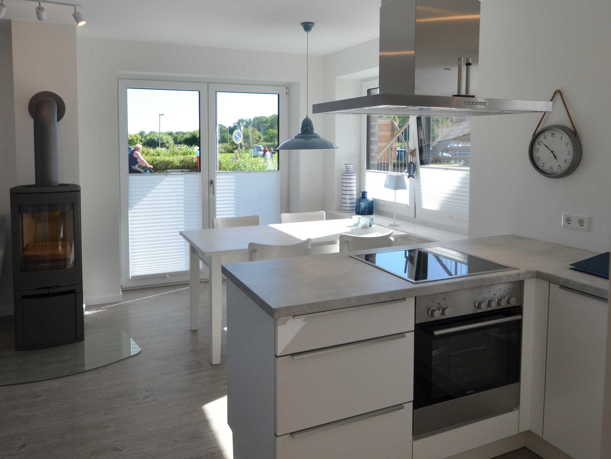 Der Wohnraum mit weißem Massivholz-Esstisch und Kaminofen sowie seinen großen, bodentiefen Fenstern lässt viel Licht herein und erlaubt zudem einen wunderschönen Blick in den Garten. Die offen gestaltete Einbauküche bietet ideale Voraussetzungen, um bereits während des Kochens das Beisammensein zu genießen.