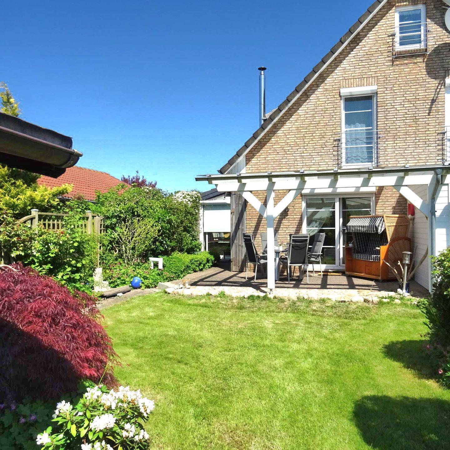Eine sonnige Terrasse mit Gartenmöbeln, Strandkorb, Markise, Grill und Sonnenliegen garantieren Ihnen schöne Urlaubsstunden.