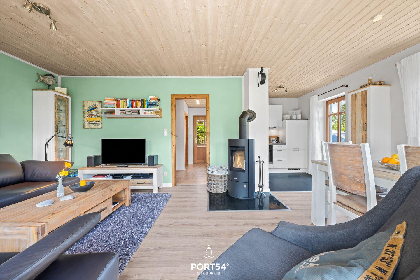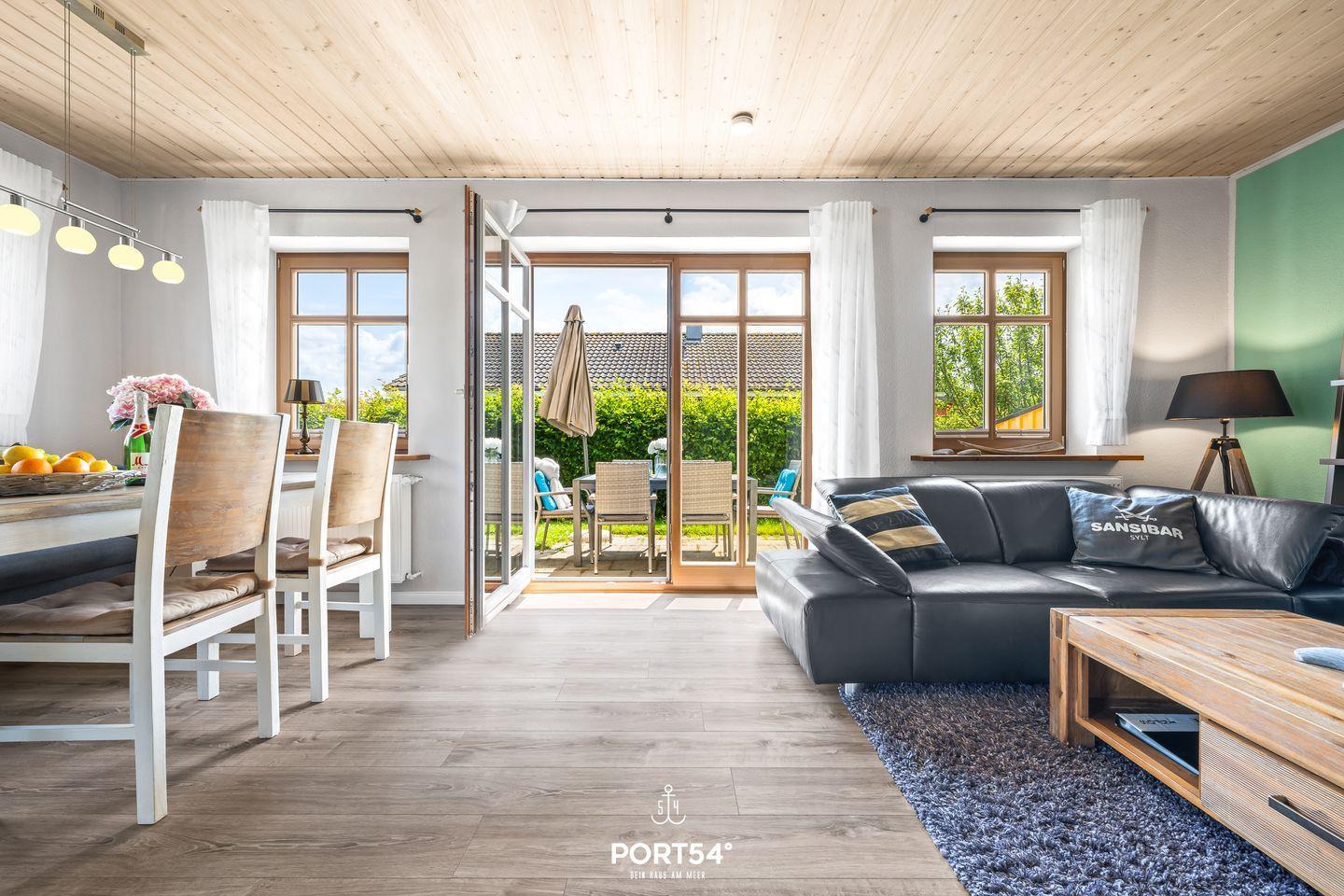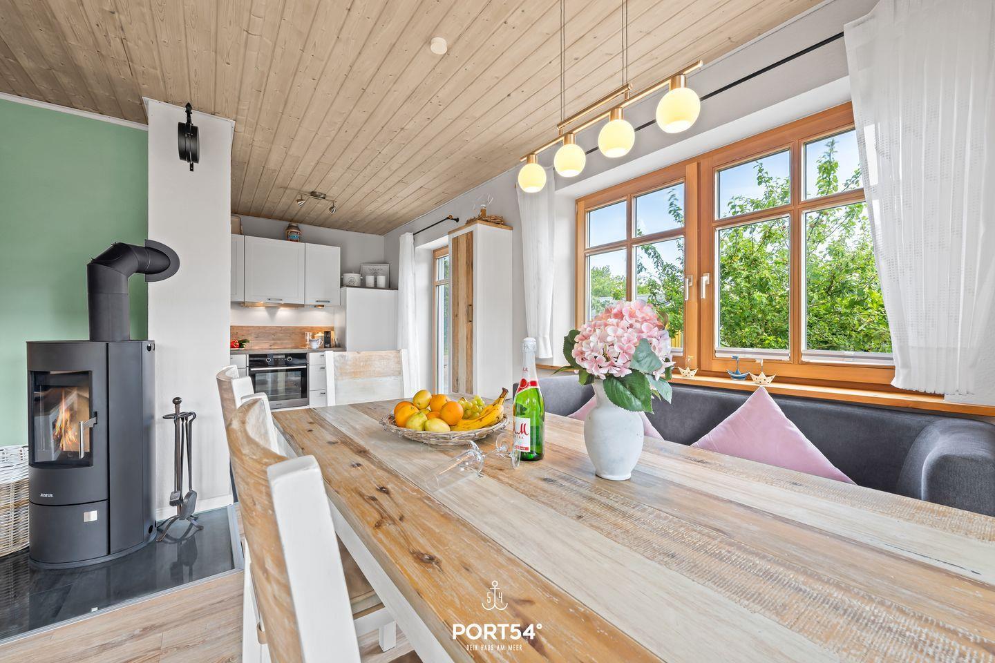 Unser Ferienhaus "Pfefferminza" ist das perfekte Urlaubsdomizil für Familien und Freunde, die gemeinsam unvergessliche Momente erleben möchten. Auf zwei Etagen erwartet Sie eine maritime Einrichtung, die sofort Urlaubsstimmung aufkommen lässt. Mit großzügigem Platz für bis zu fünf Personen und vielen Extras für die Kleinen ist das Haus besonders familienfreundlich. Das offene Wohnzimmer lädt mit seiner gemütlichen Sofagarnitur und einem bequemen Sessel zum Entspannen ein. Für Unterhaltung ist bestens gesorgt: Neben einer Auswahl an Büchern stehen Ihnen ein Flachbild-TV mit Blu-ray-Player und eine Musikanlage zur Verfügung. In den kälteren Monaten sorgt der Kaminofen für wohlige Wärme. Angrenzend befindet sich die moderne Küche, die dank Espressomaschine, Milchaufschäumer und vielen weiteren Geräten hervorragend ausgestattet ist. Hier können Sie nicht nur kulinarische Köstlichkeiten zaubern, sondern dabei auch den herrlichen Blick in den Garten genießen. Der Essbereich ist perfekt für gemeinsame Familienmahlzeiten oder gesellige Spieleabende mit den hauseigenen Spielen geeignet. An sonnigen Tagen lockt die Terrasse mit gemütlichen Sitzgelegenheiten, und der Holzkohlegrill sorgt abends für gesellige Barbecue-Momente. Im Obergeschoss befindet sich das Tageslicht-Duschbad, das mit einem kleinen Kosmetikspiegel, einem Handtuchheizkörper und einem Föhn ausgestattet ist. Ein echtes Highlight ist die hauseigene Finnische Sauna – ideal für entspannte Wellnessmomente nach einem erlebnisreichen Tag. Die Schlafräume befinden sich ebenfalls Obergeschoss und bieten erholsamen Schlaf für die ganze Familie. Das Hauptschlafzimmer verwöhnt Sie mit einem komfortablen Boxspringbett in King-Size-Größe (200x200cm), einem geräumigen Kleiderschrank und Verdunkelungsmöglichkeiten. Das zweite Schlafzimmer ist ein Paradies für Kinder: Ein gemütliches Etagenbett (je 90x200cm), Kinderspielzeug, ein kleiner Tisch und ein Kindersessel machen diesen Raum zum Lieblingsort der Kleinen. Für die jüngsten Gäste stehen ein Kinderreisebett, ein Hochstuhl, ein Kindertritthocker und ein Töpfchen bereit. Ein drittes Schlafzimmer unter den Dachschrägen bietet mit einem Einzelbett einen weiteren Schlafplatz. Ein besonderes Plus: Unsere Ferienhäuser "Pfefferminza" und "Pippilotta" liegen direkt nebeneinander und können zusammen gebucht werden – ideal für Großfamilien oder Urlaub mit Freunden. Ihr Auto parken Sie bequem auf dem Grundstück, und auch mitgebrachte Fahrräder finden sicher Platz im Fahrradständer vor dem Haus. Genießen Sie einen entspannten Familienurlaub im Ferienhaus "Pfefferminza"!