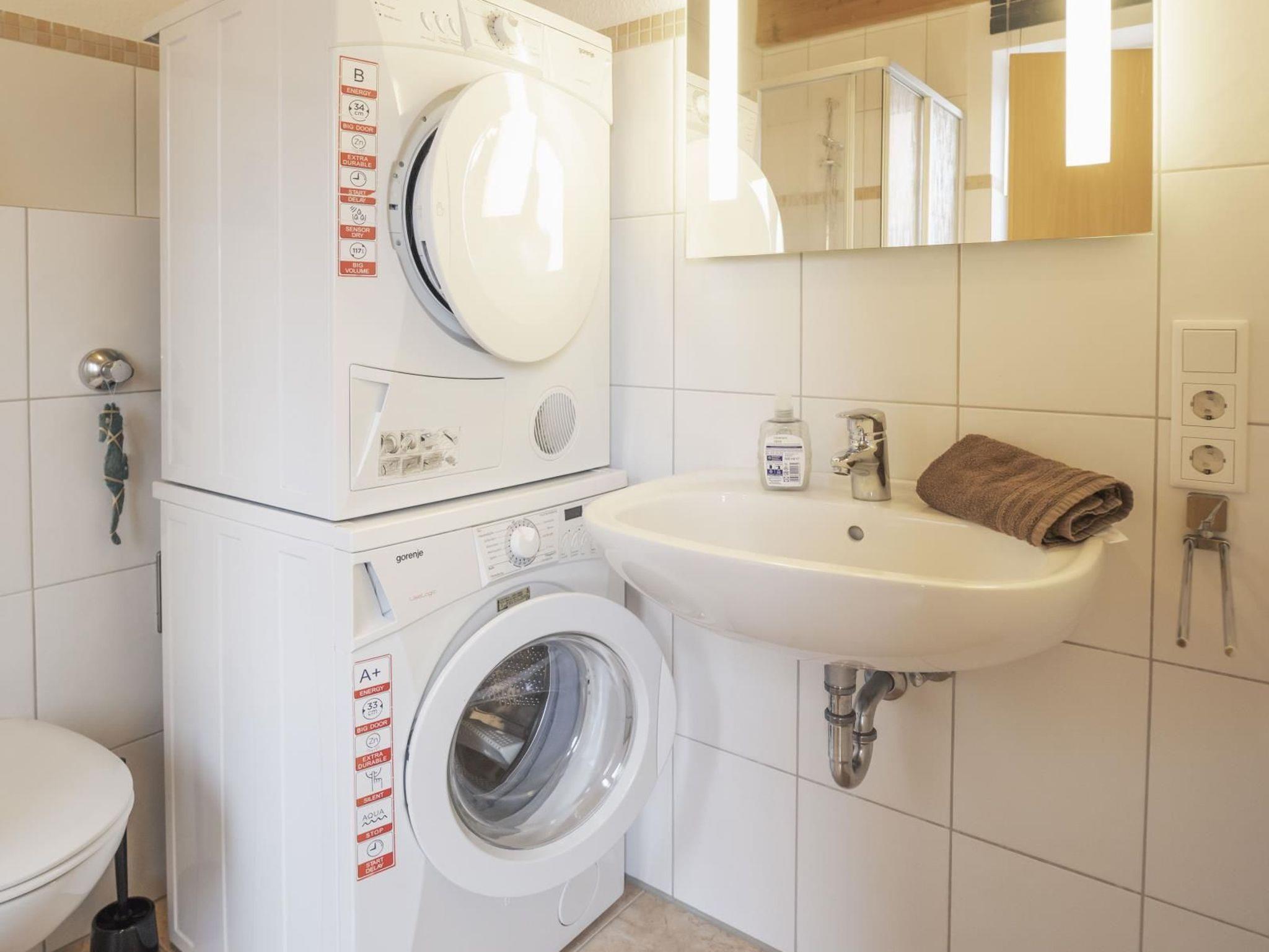 Bad mit Fenster im EG mit Dusche, Waschmaschine und Wäschetrockner.