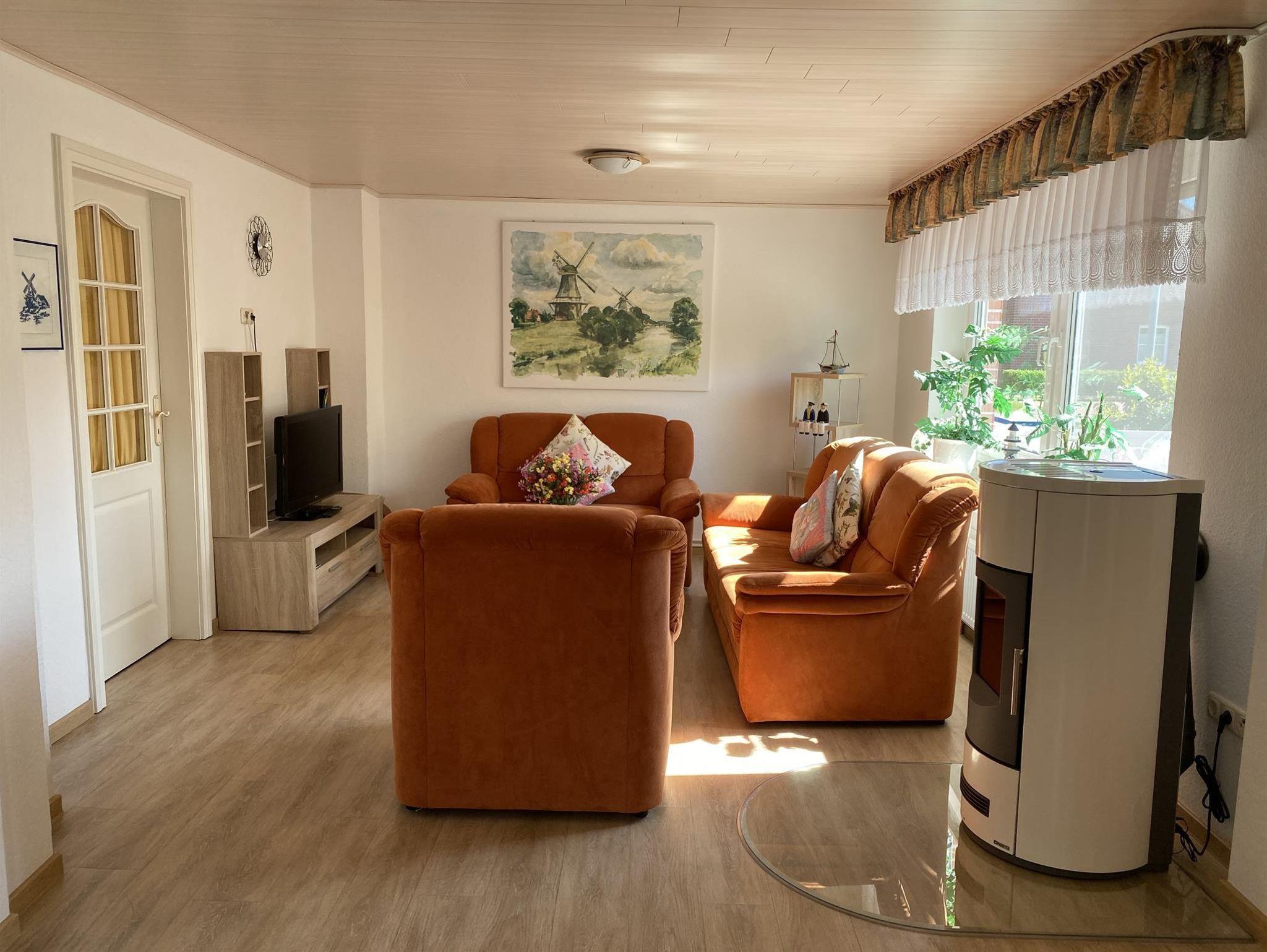 Diese Ferienwohnung im Erdgeschoss, in der Nähe der Zwillingsmühlen gelegen, wurde im Frühjahr 2013 aufwendig renoviert und ist mit ca.70 m² und 2 Schlafzimmern für 4 Personen geeignet. Durch den eigenen Eingang betreten Sie das geräumige gemütliche Wohnzimmer mit Kaminofen. Direkt angrenzend befindet sich die große Küche in den ostfr. Farben blau-weiß mit Geschirrspüler und Mikrowellenherd. Die 2 Schlafzimmer mit Fernseher sind jeweils mit einem Doppelbett ausgestattet. Das Badezimmer verfügt über eine Dusche und WC. Zur Ausstattung gehören SAT-TV, CD-Player, Telefon und Internetzugang. Eine große Westterrasse am Eingang und eine überdachte Südterrasse mit Garten runden diese Wohnung ab.