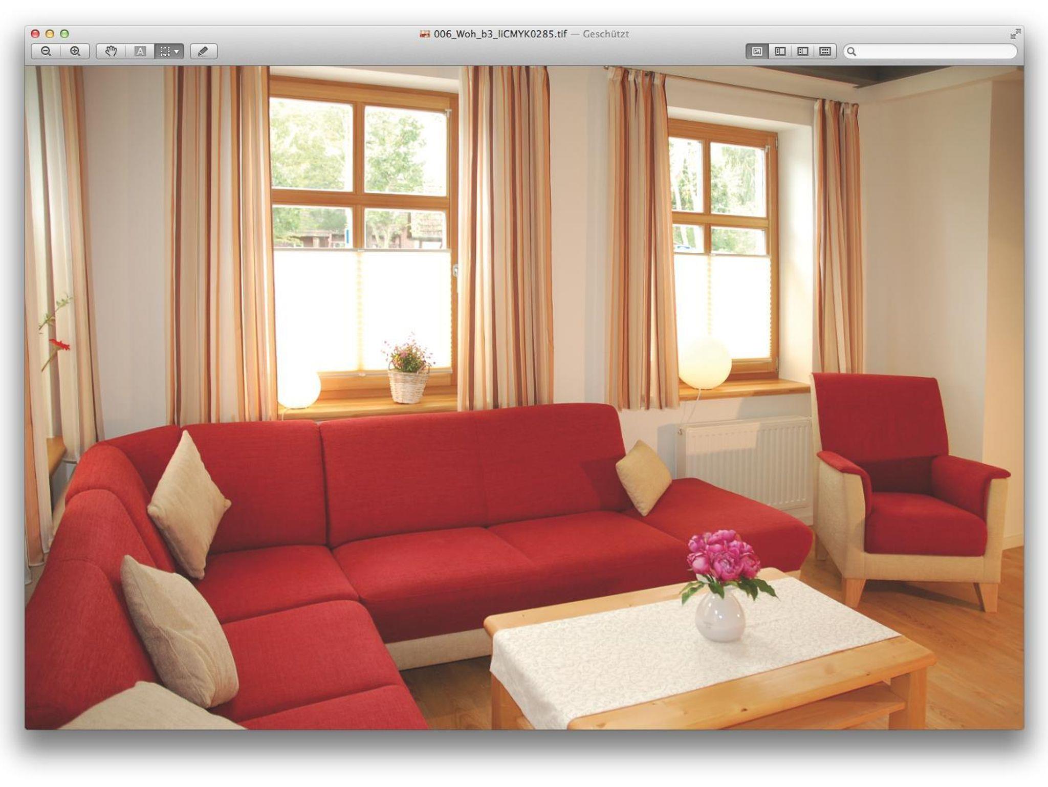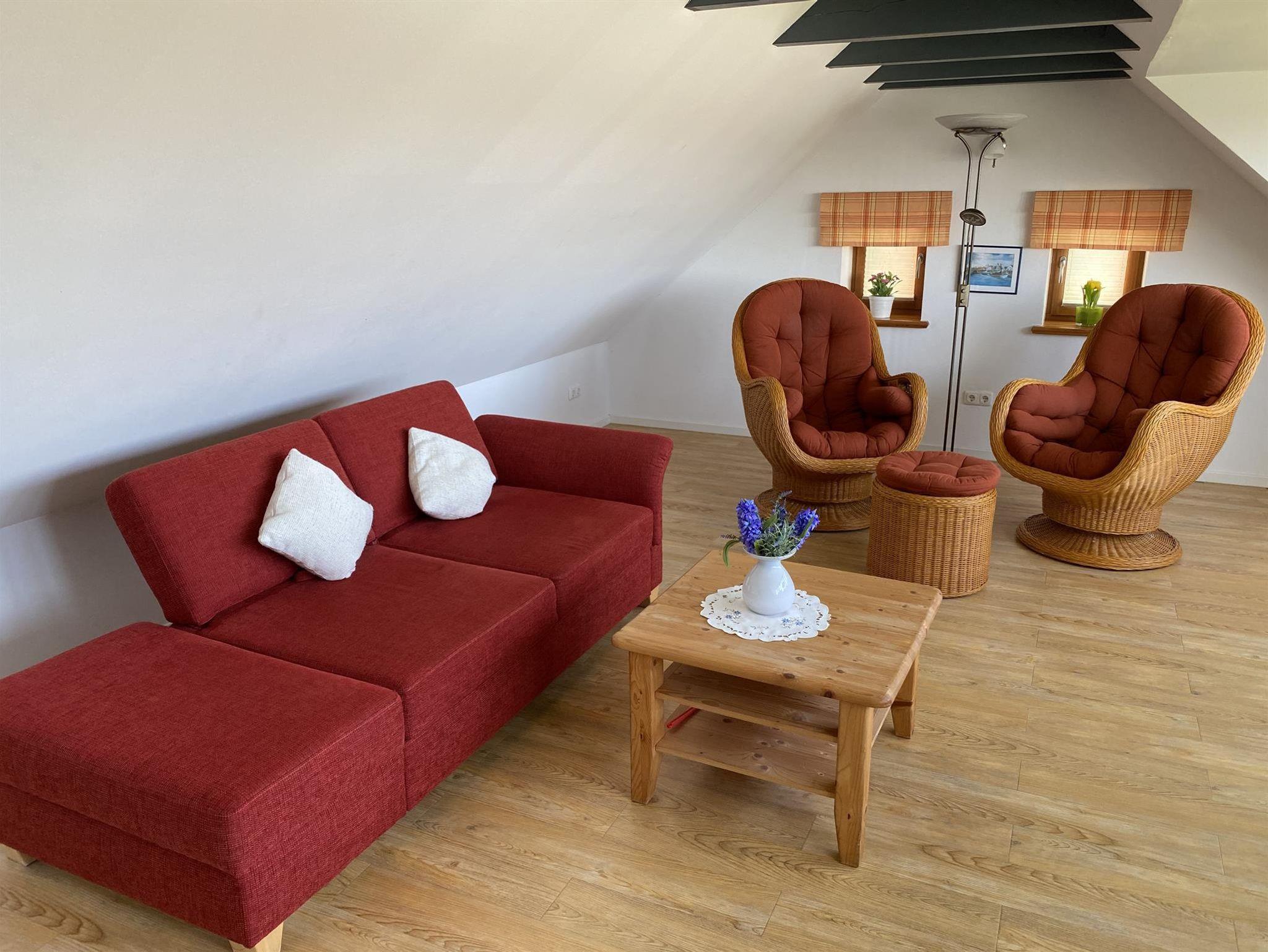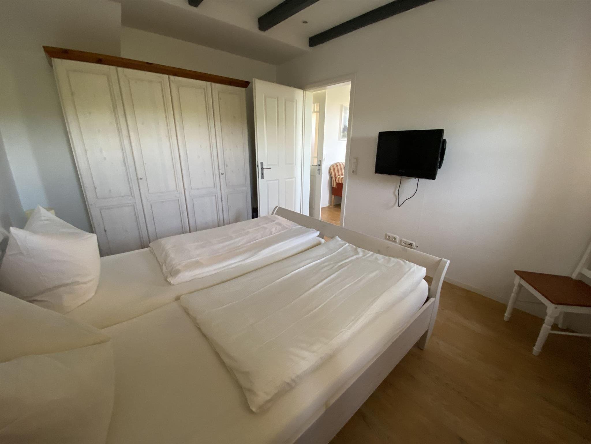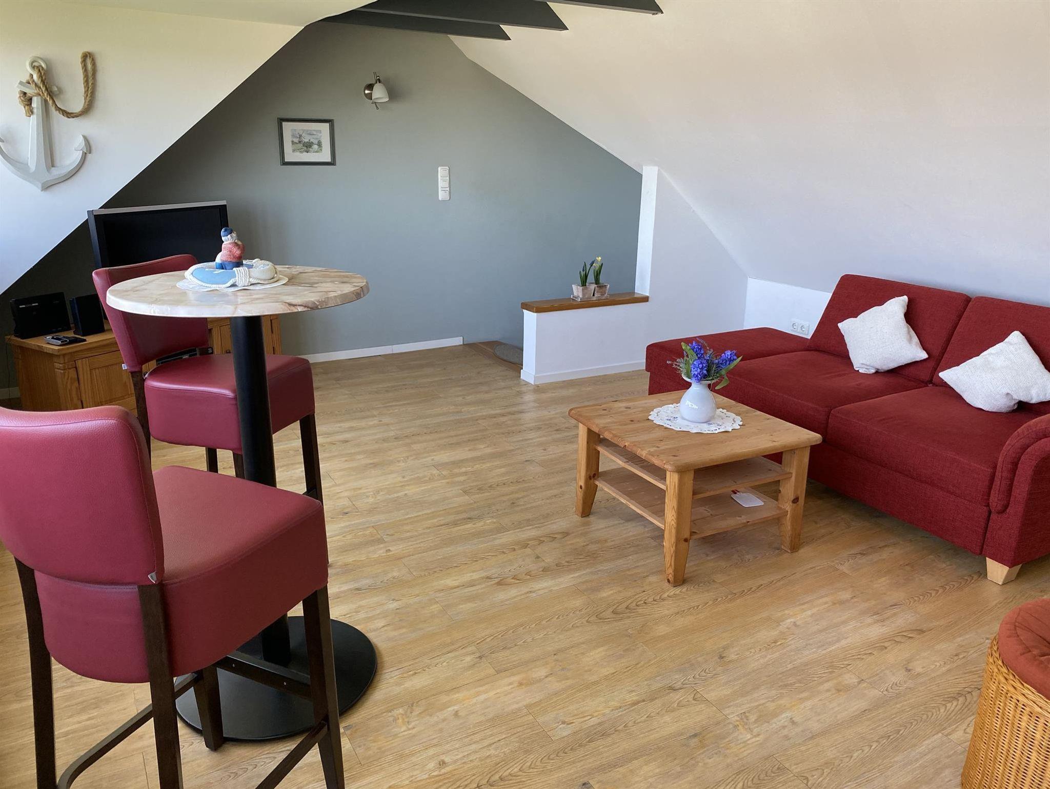 Die Wohnung 3 hat eine Wohnfläche von 90 m² und besteht aus einem großen Wohnzimmer mit Kamin, einer Essecke und Einbauküche, zwei Schlafzimmern mit TV und zwei Badezimmern. Auch diese Wohnung liegt direkt am Deich und ist nur 2 Minuten vom Ortskern entfernt.