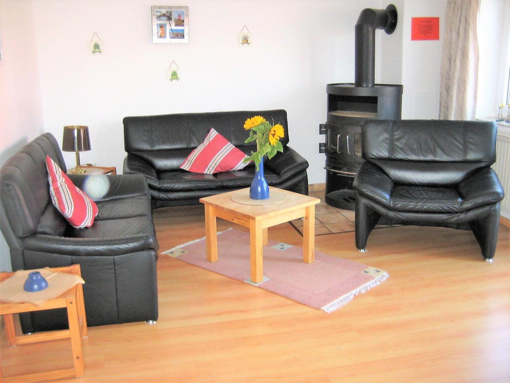 Beide Wohnungen verfügen über einen großzügigen Wohnraum mit Ledersitzgarnitur und Kaminofen (nur als Notfallheizung nutzbar). Die moderne Küchenzeile (Spülmaschine, Mikrowelle, Kühl-Gefrierkombination etc.) ist ebenso wie die Essecke für 4 Personen in den Wohnraum integriert. 2 Schlafzimmer, Kinderreisebett u. Kinderhochstuhl, Du /WC, Terrasse oder Balkon und Garten mit Gartenmöbeln, Grill, Sat-TV, Stereoanlage/Radio und UntKerstellmöglichkeit für Fahrräder runden das Angebot ab. Zu jeder Wohnung gehört ein Parkplatz. Bettwäsche auf Anfrage.