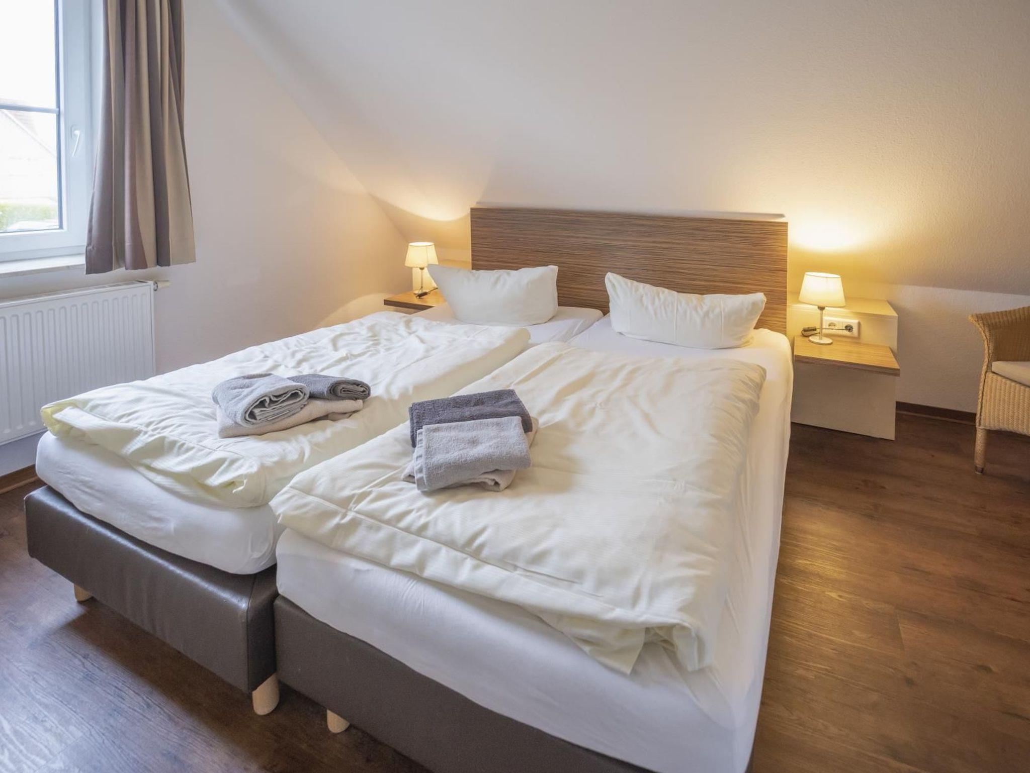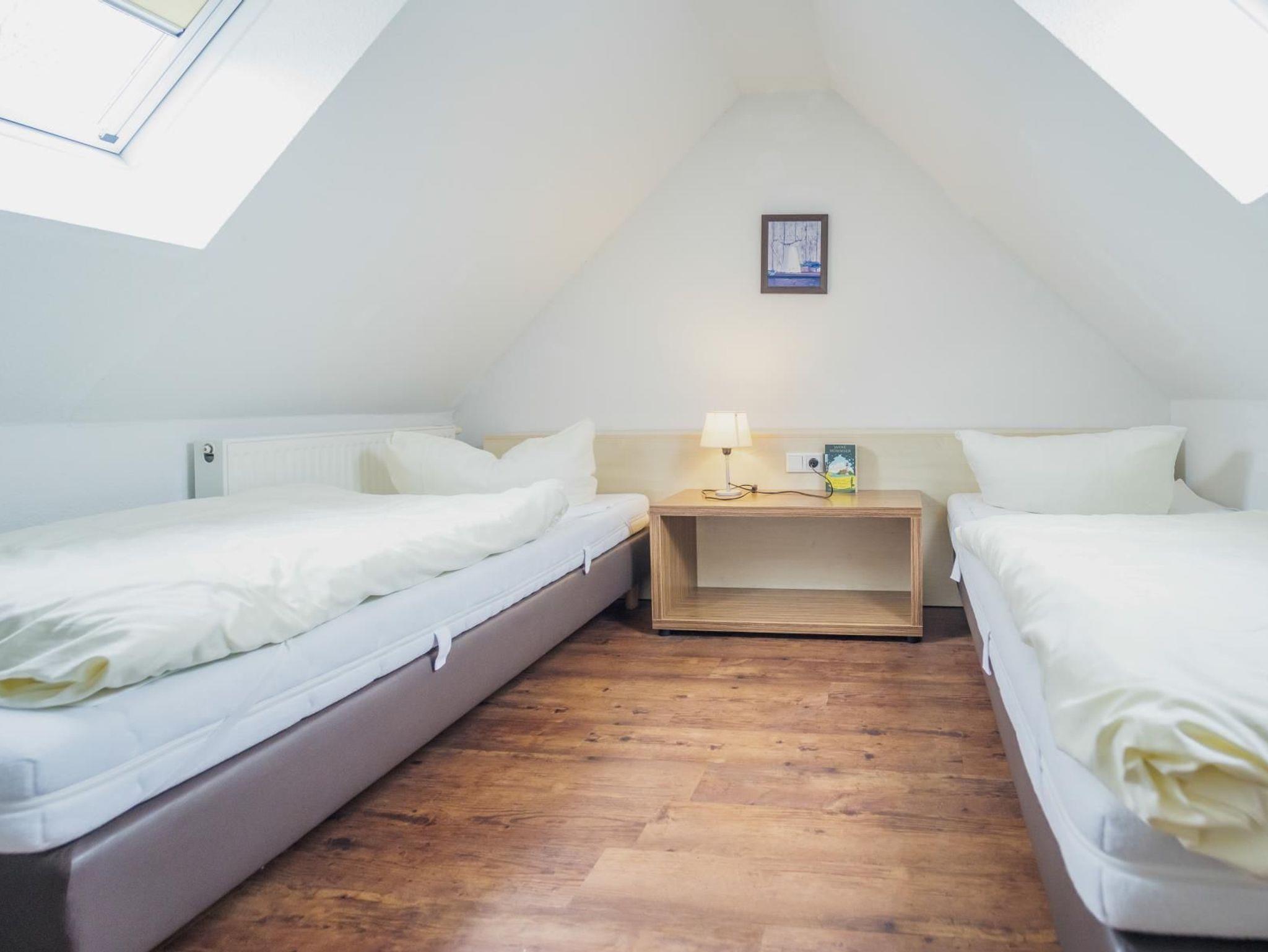 Schlafraum mit zwei Einzelbetten (auch als Doppelbett möglich), Kommode und Flachbildfernseher mit allen erforderlichen Anschlüssen für Spielekonsolen.