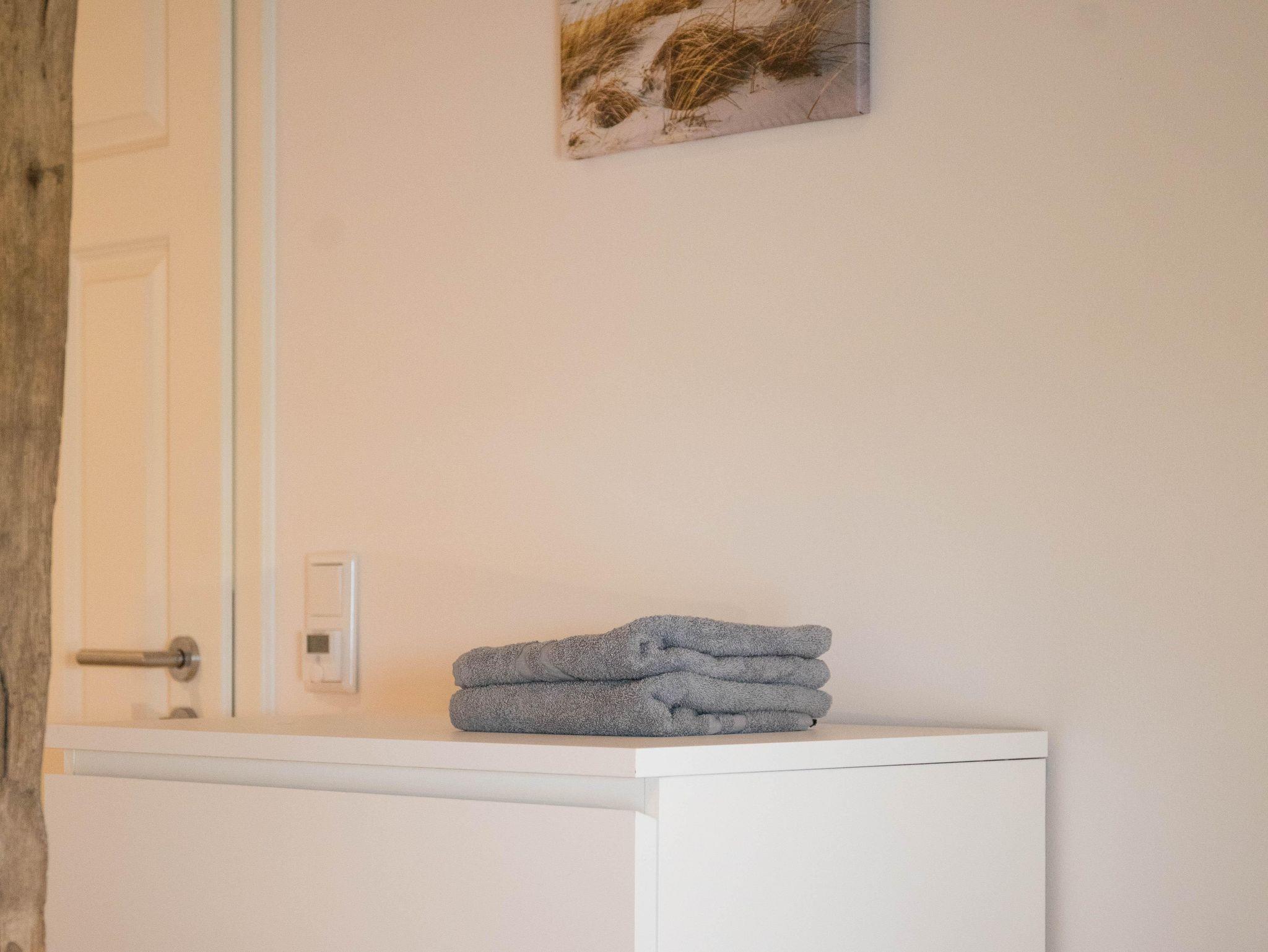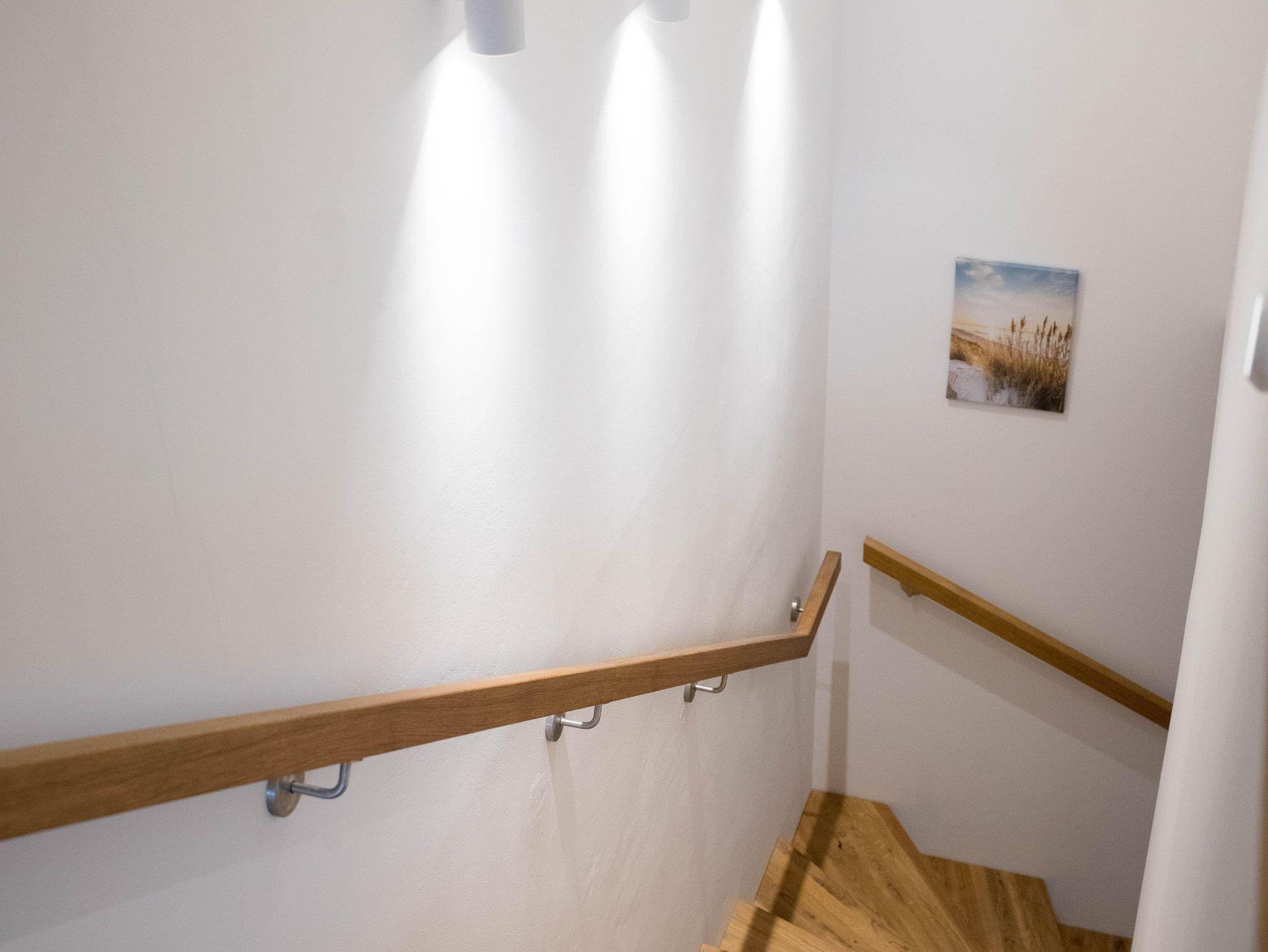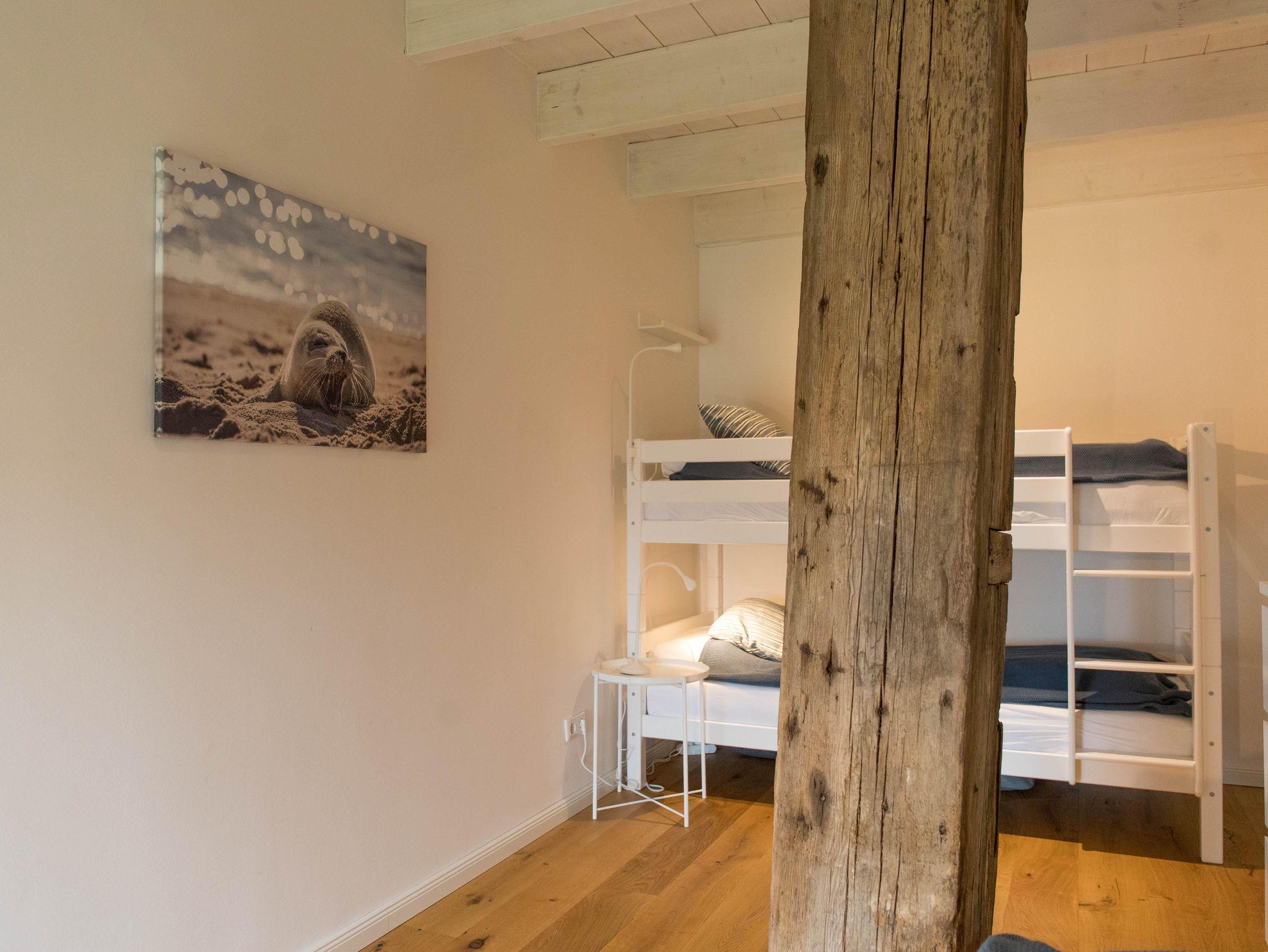 Das Obergeschoss verfügt über zwei geschmackvoll eingerichtete Schlafzimmer. Das Elternschlafzimmer verfügt über ein bequemes Doppelbett sowie einen ausreichenden Kleiderschrank. Im Kinderzimmer stehen bei Bedarf bis zu vier Schlafmöglichkeiten (inkl. zweier Stapelbetten) sowie eine Kommode zur Verfügung. Beide Schlafzimmer verfügen über Verdunklungsrollos. Das moderne Bad ist mit einer Badewanne, einer bodenebenen Dusche, WC und einer Handtuchheizung ausgestattet.