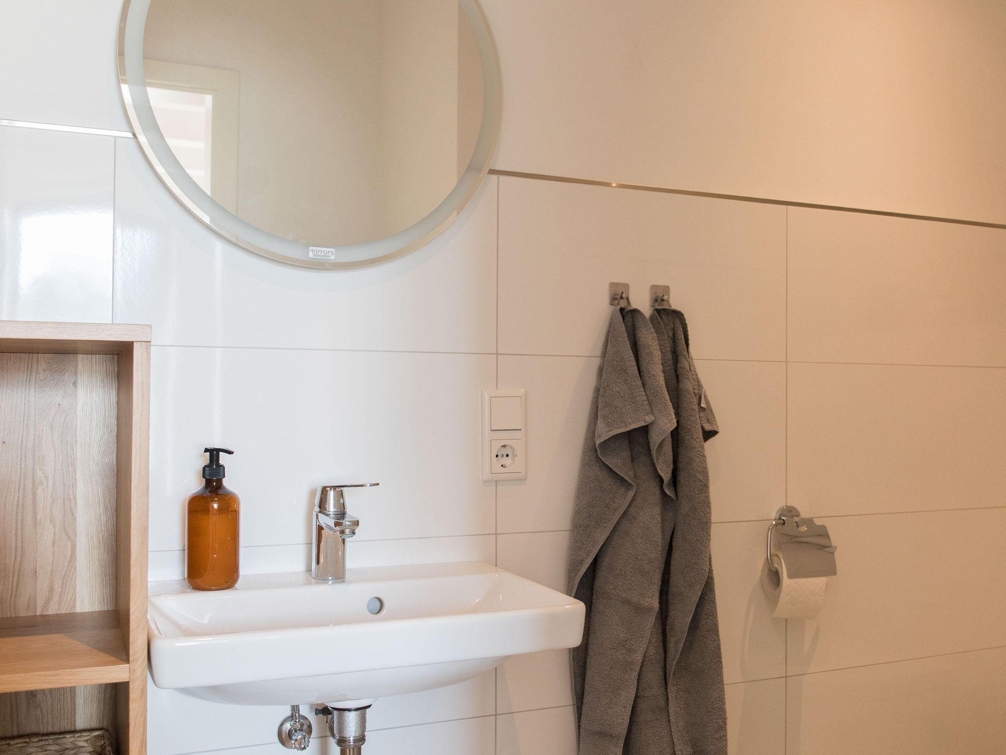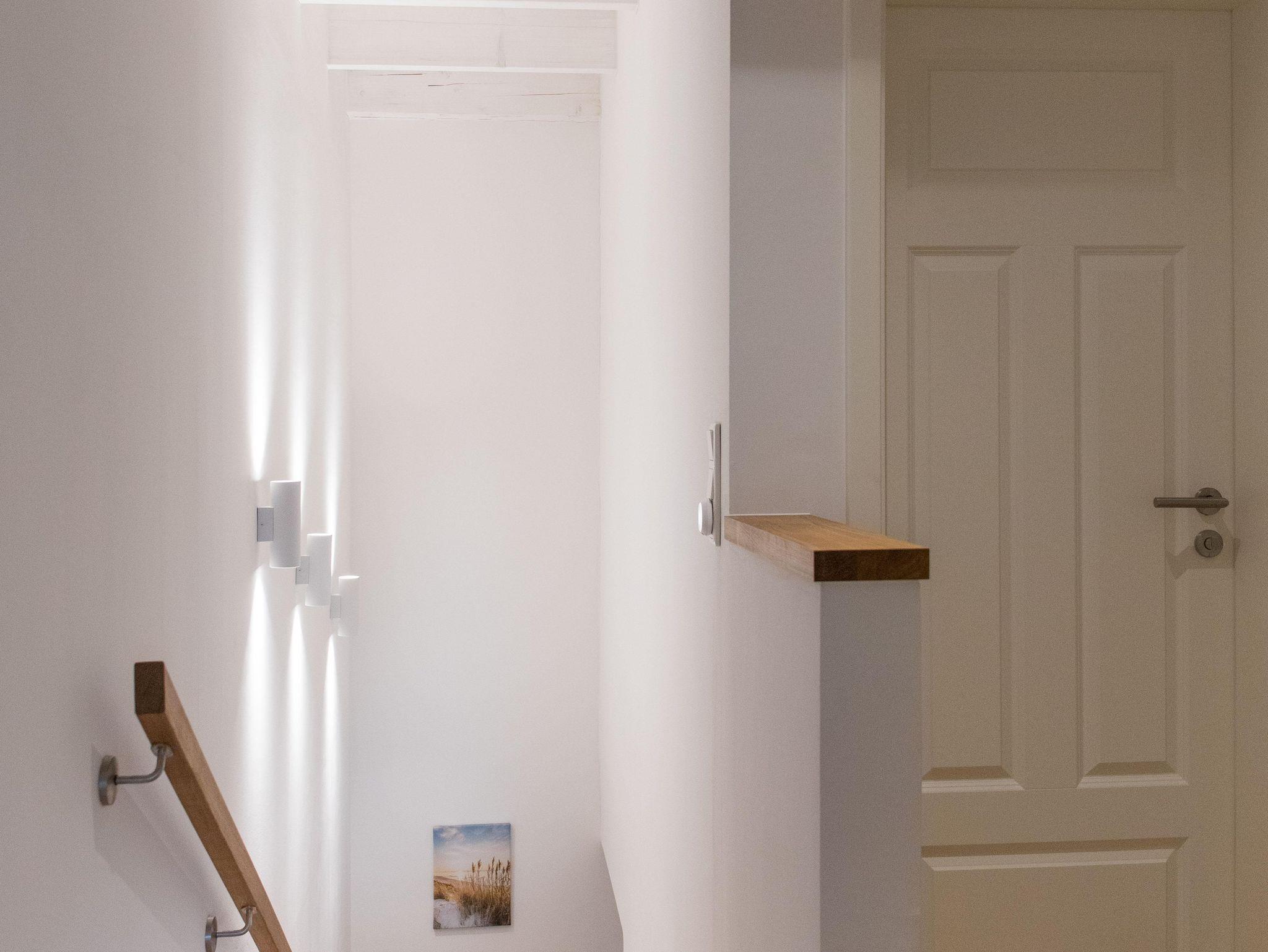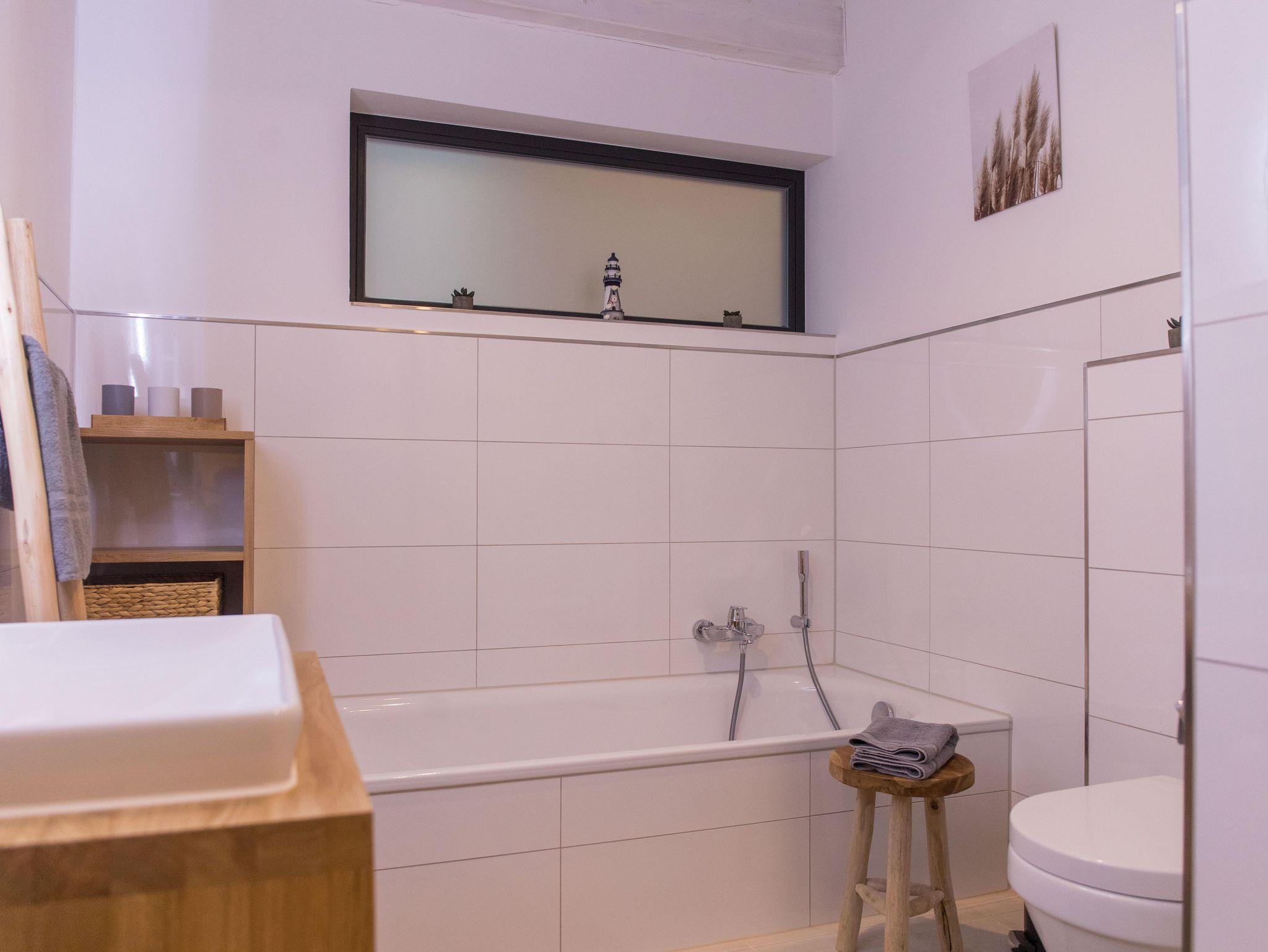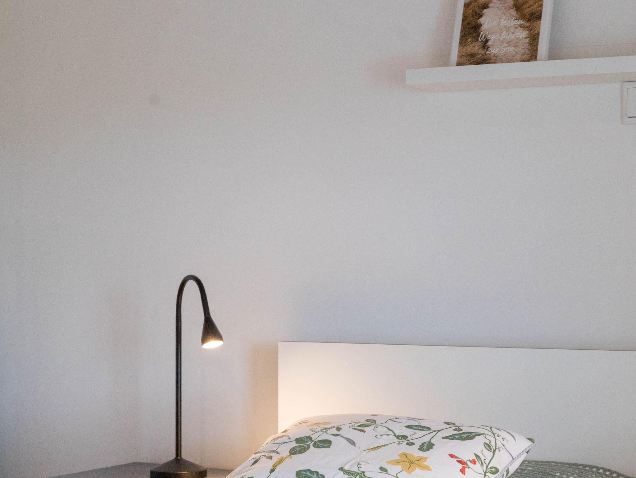 Das Obergeschoss verfügt über zwei geschmackvoll eingerichtete Schlafzimmer. Das Elternschlafzimmer verfügt über ein bequemes Doppelbett sowie einen ausreichenden Kleiderschrank. Im Kinderzimmer stehen bei Bedarf bis zu vier Schlafmöglichkeiten (inkl. zweier Stapelbetten) sowie eine Kommode zur Verfügung. Beide Schlafzimmer verfügen über Verdunklungsrollos. Das moderne Bad ist mit einer Badewanne, einer bodenebenen Dusche, WC und einer Handtuchheizung ausgestattet.