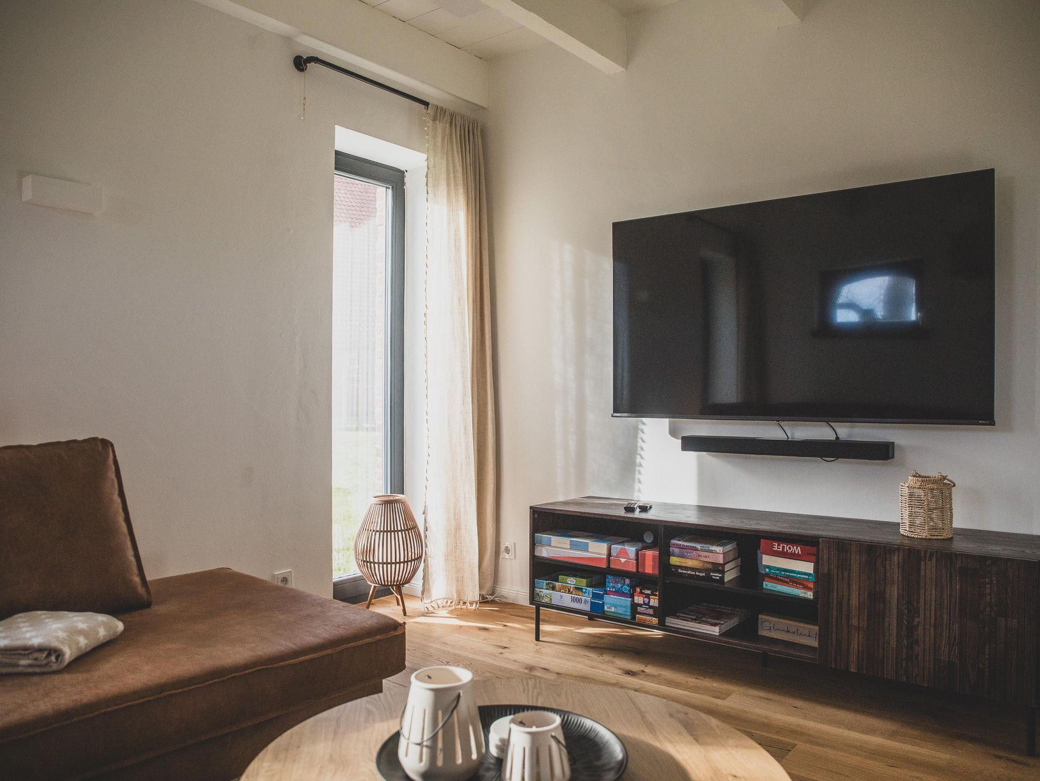 Das Herzstück für alle Film- und Serienliebhaber ist das separate Wohnzimmer, das als privates Kino-Zimmer gestaltetwurde: ein 65-Zoll-TV mit Soundbar sorgt für echtes Heimkino-Feeling – ideal für gemütliche Abende nach einem Tag an der frischen Nordseeluft.