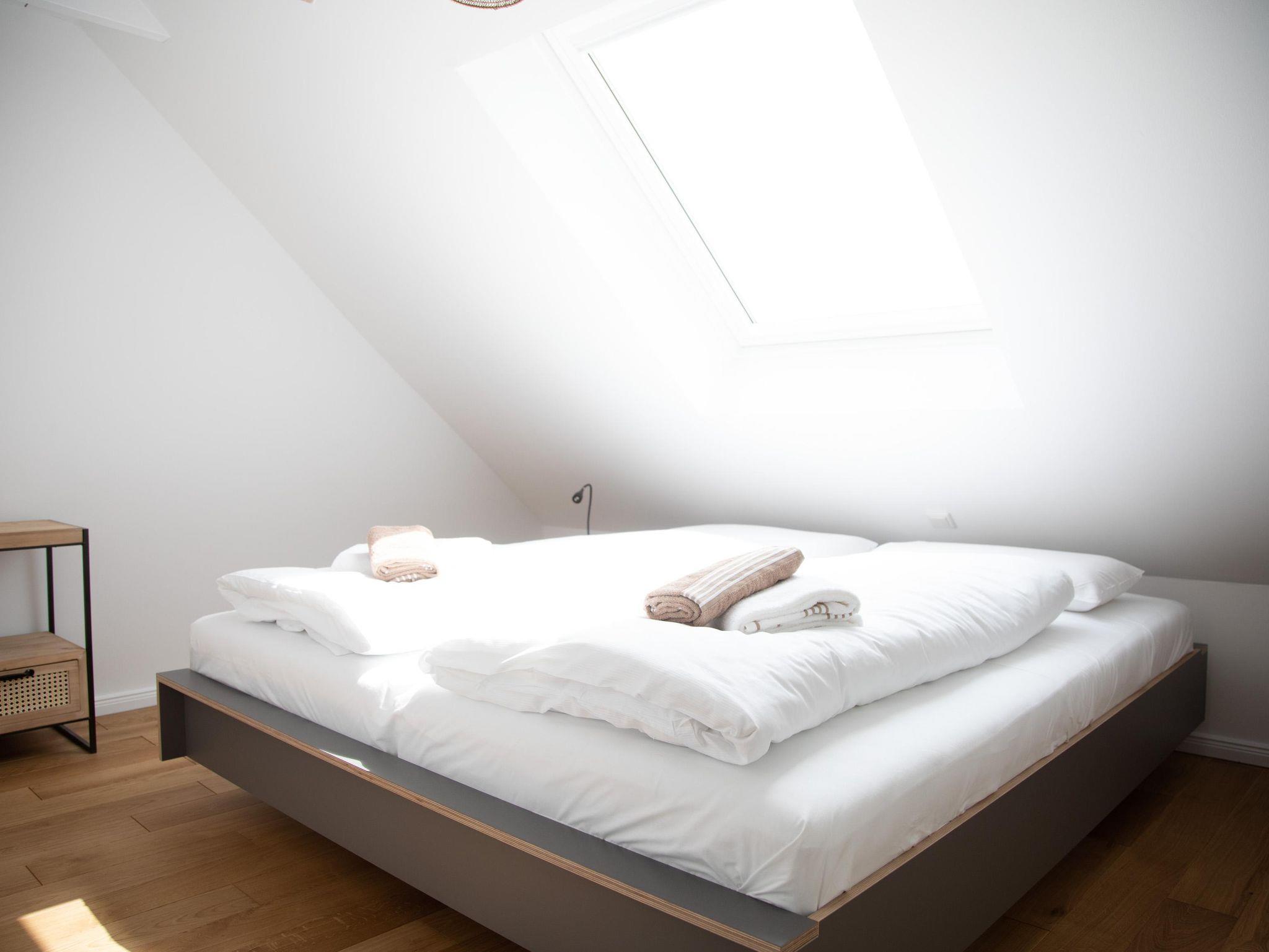 Unsere Wohnung „Reemt“ ist 60m² groß und bietet mit einem Schlafzimmer und zwei weiteren Schlafmöglichkeiten, Platz für 4 Personen. Zu dem Inventar der Wohnung gehört noch ein Reisebabybett.