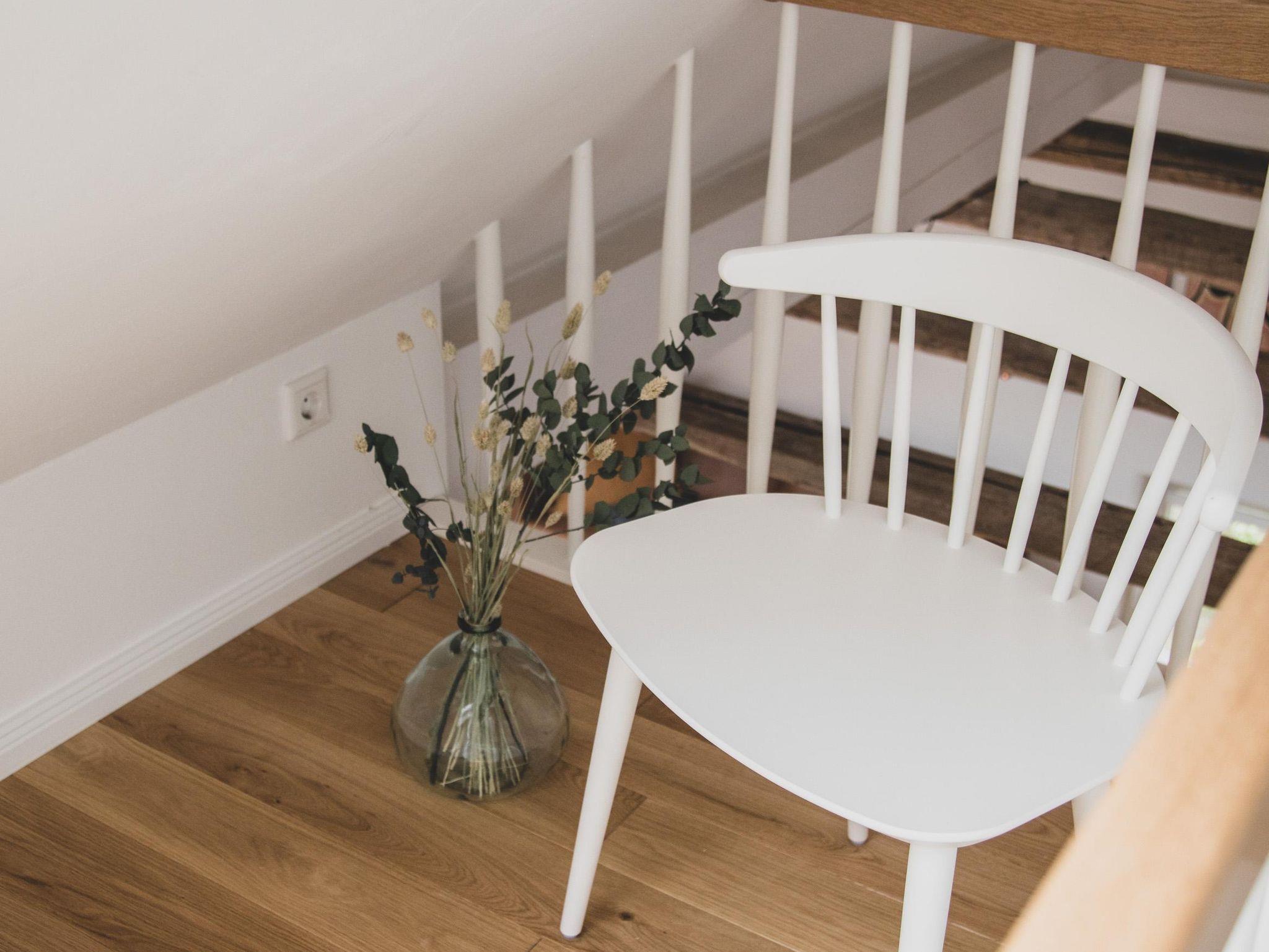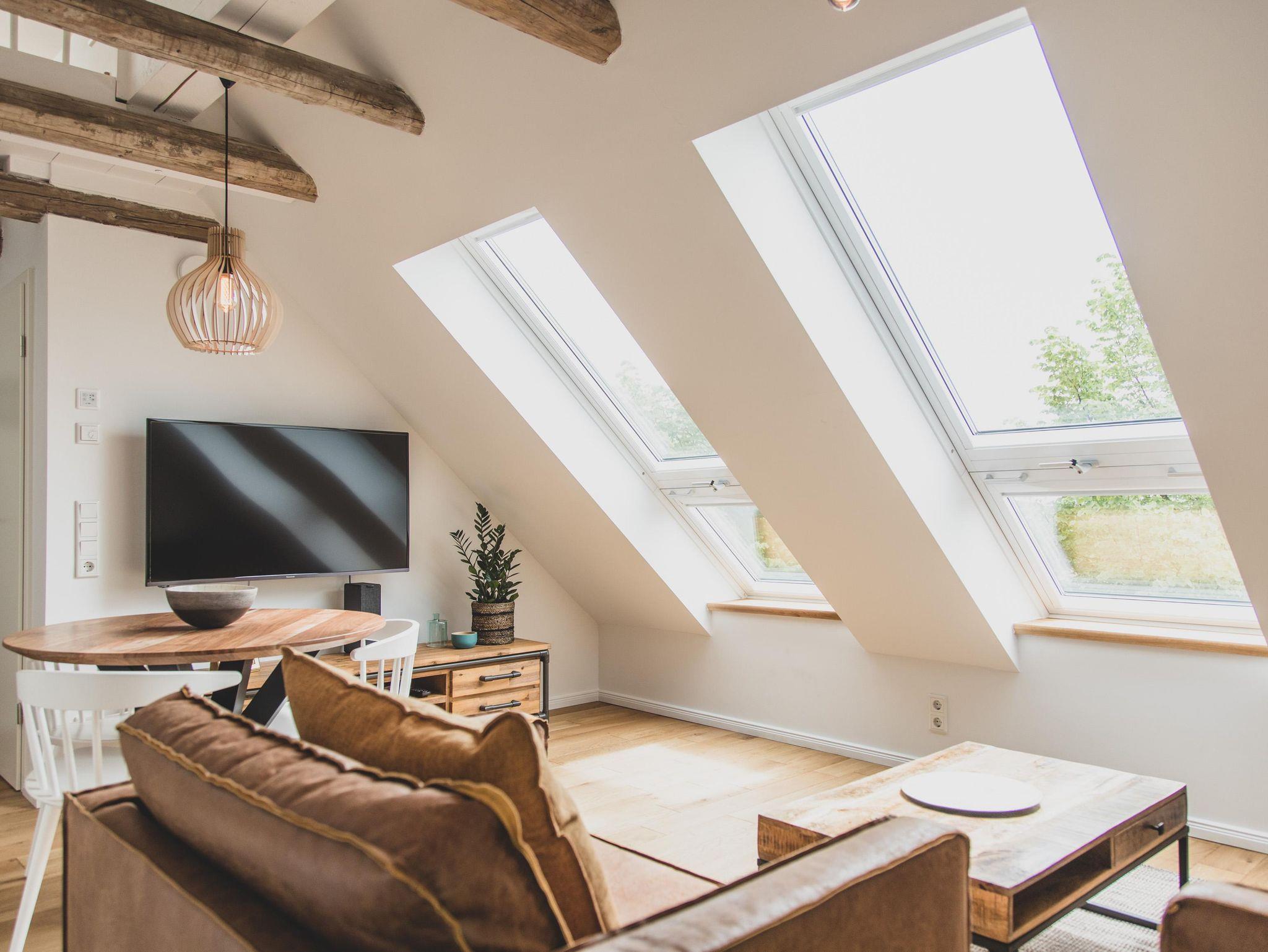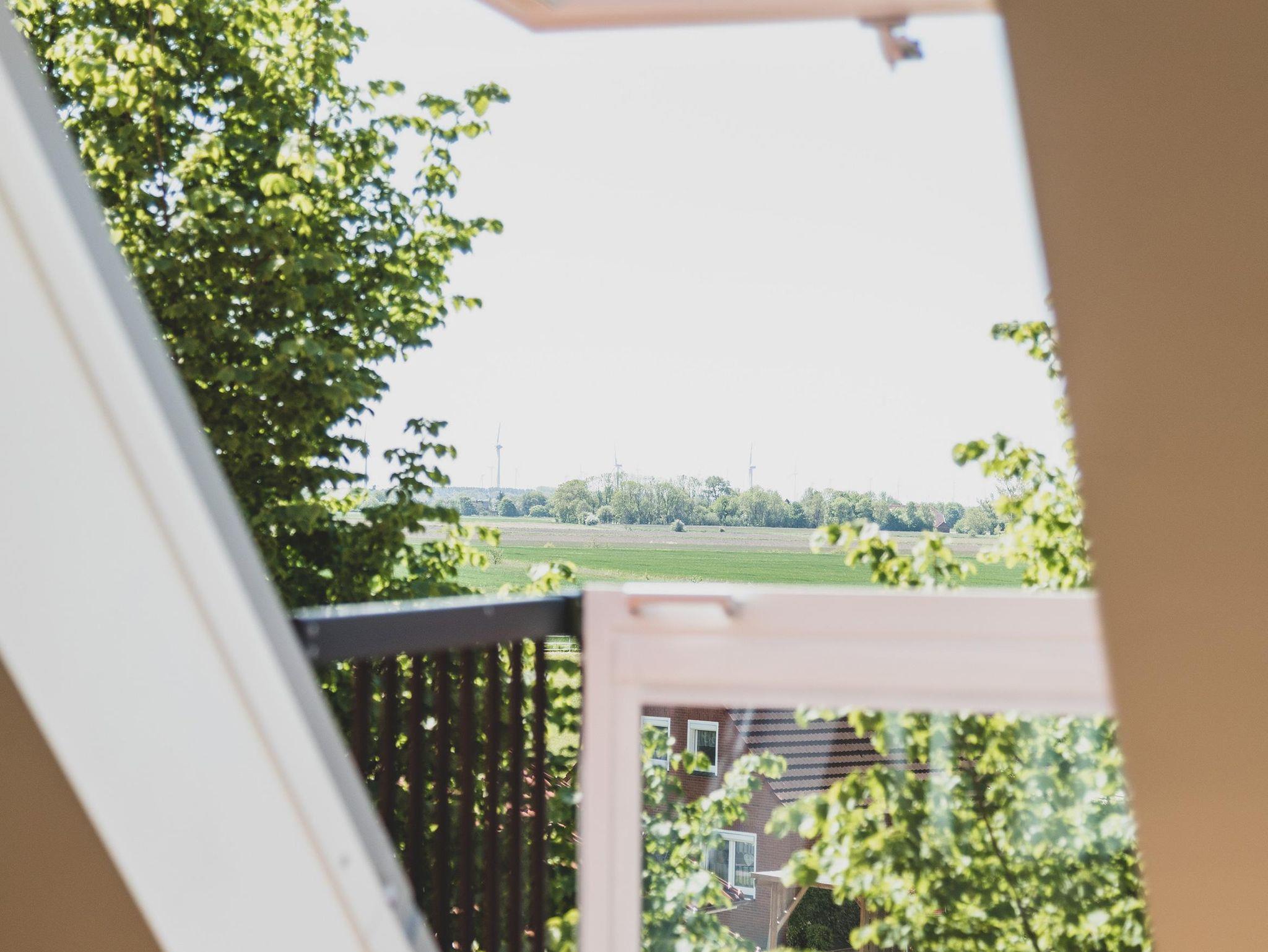 Aufgrund der gemütlichen Schrägen in der Wohnung, haben Sie durch die großzügigen Fenster den weitreichenden Anblick in die umliegende Natur. Die Fenster im Wohnzimmer lassen sich zudem mühelos zu kleinen Balkonen umfunktionieren, sodass sie dort den Ausblick in die Krummhörn gemeinsam genießen können.