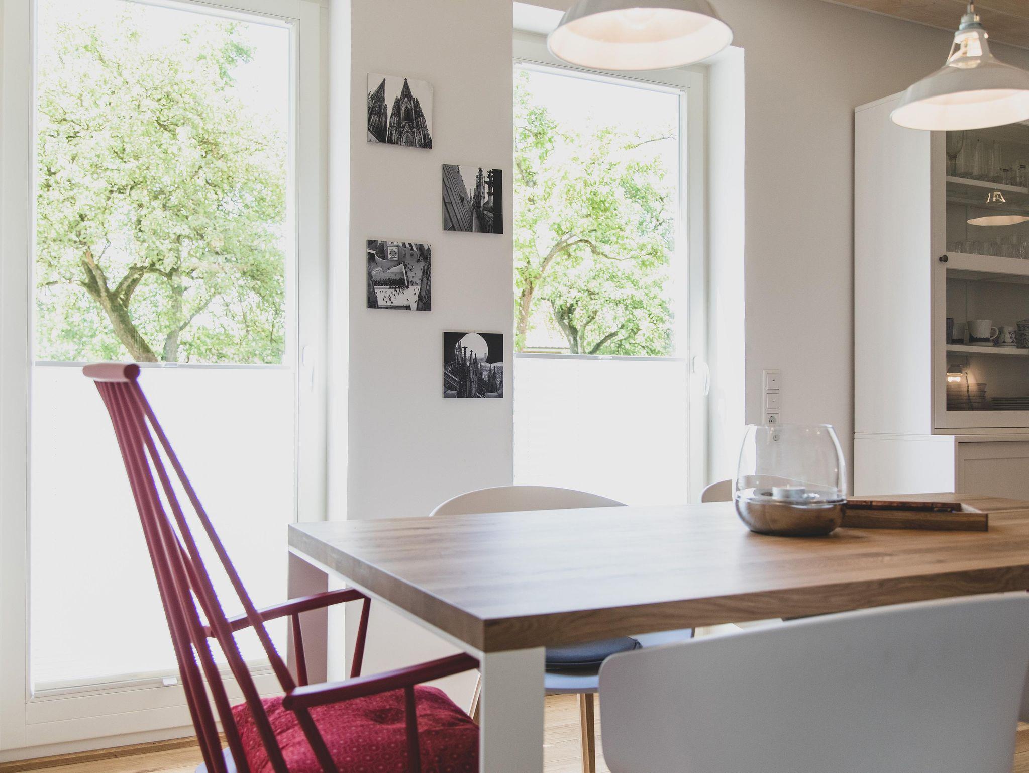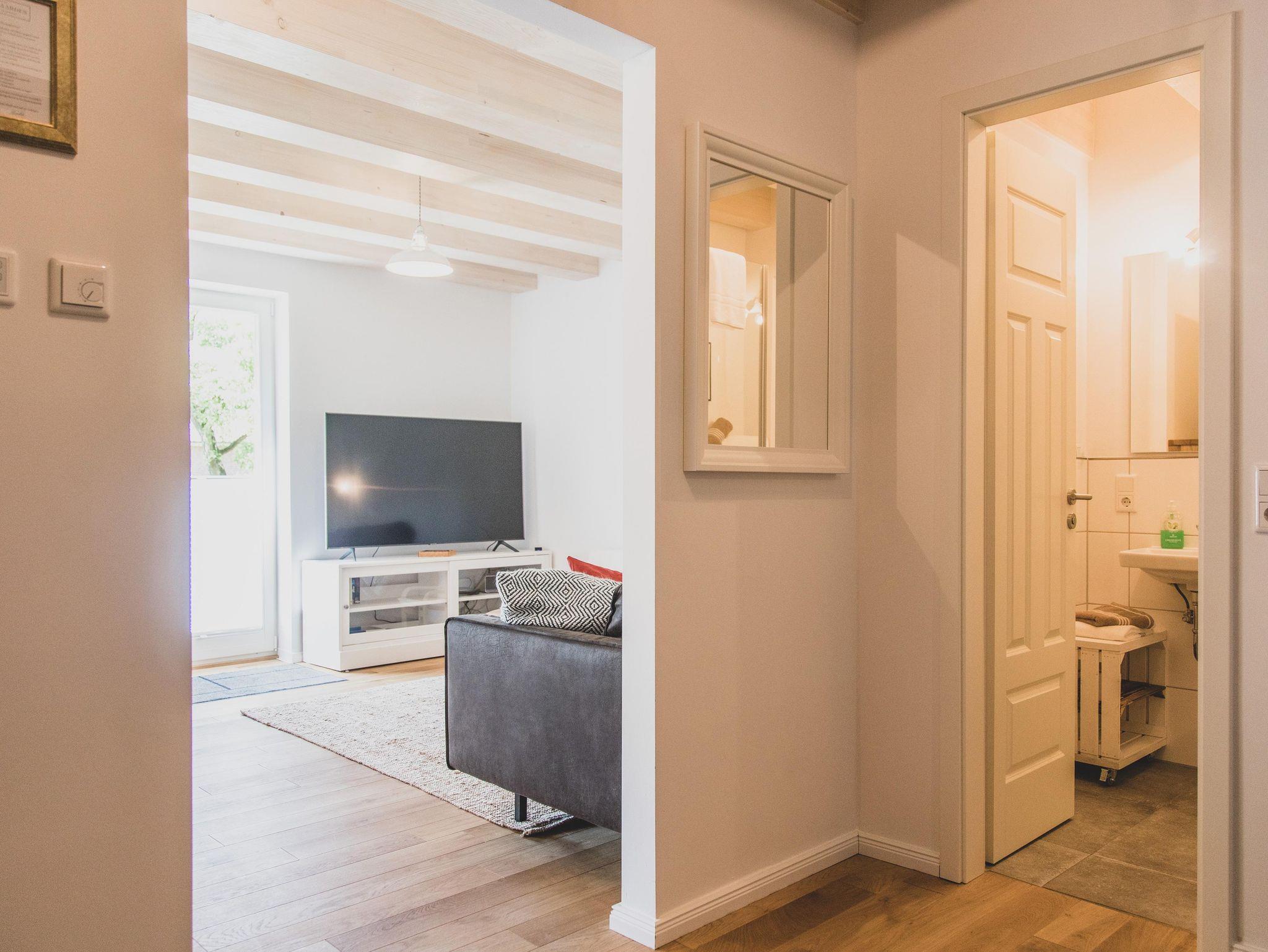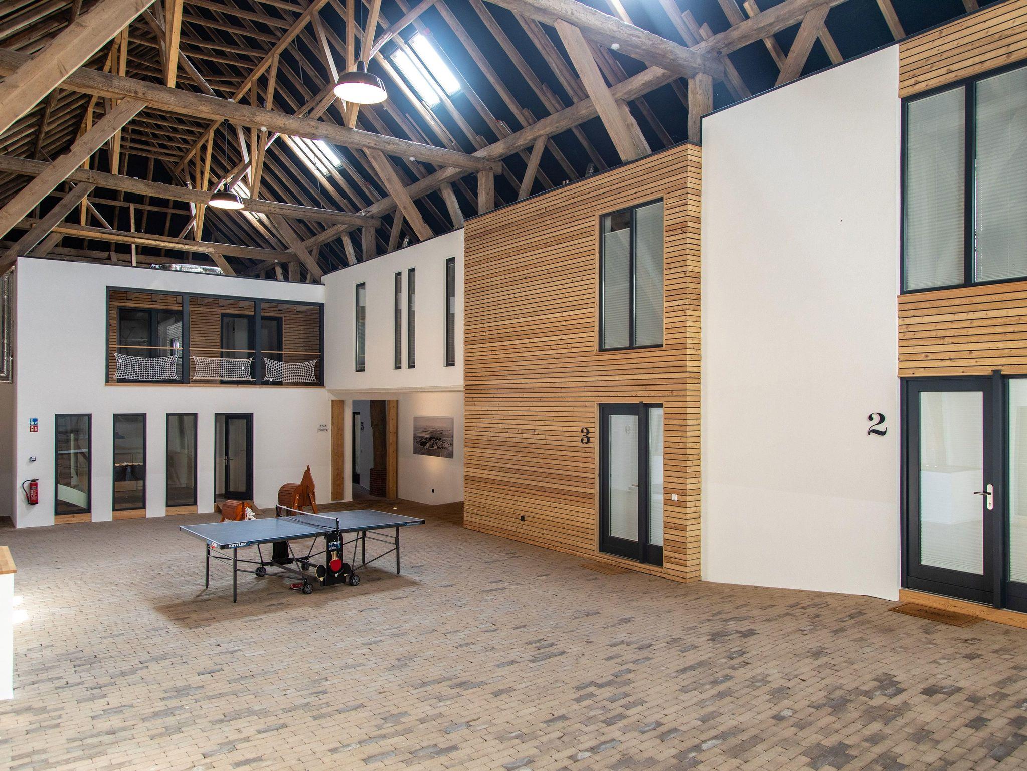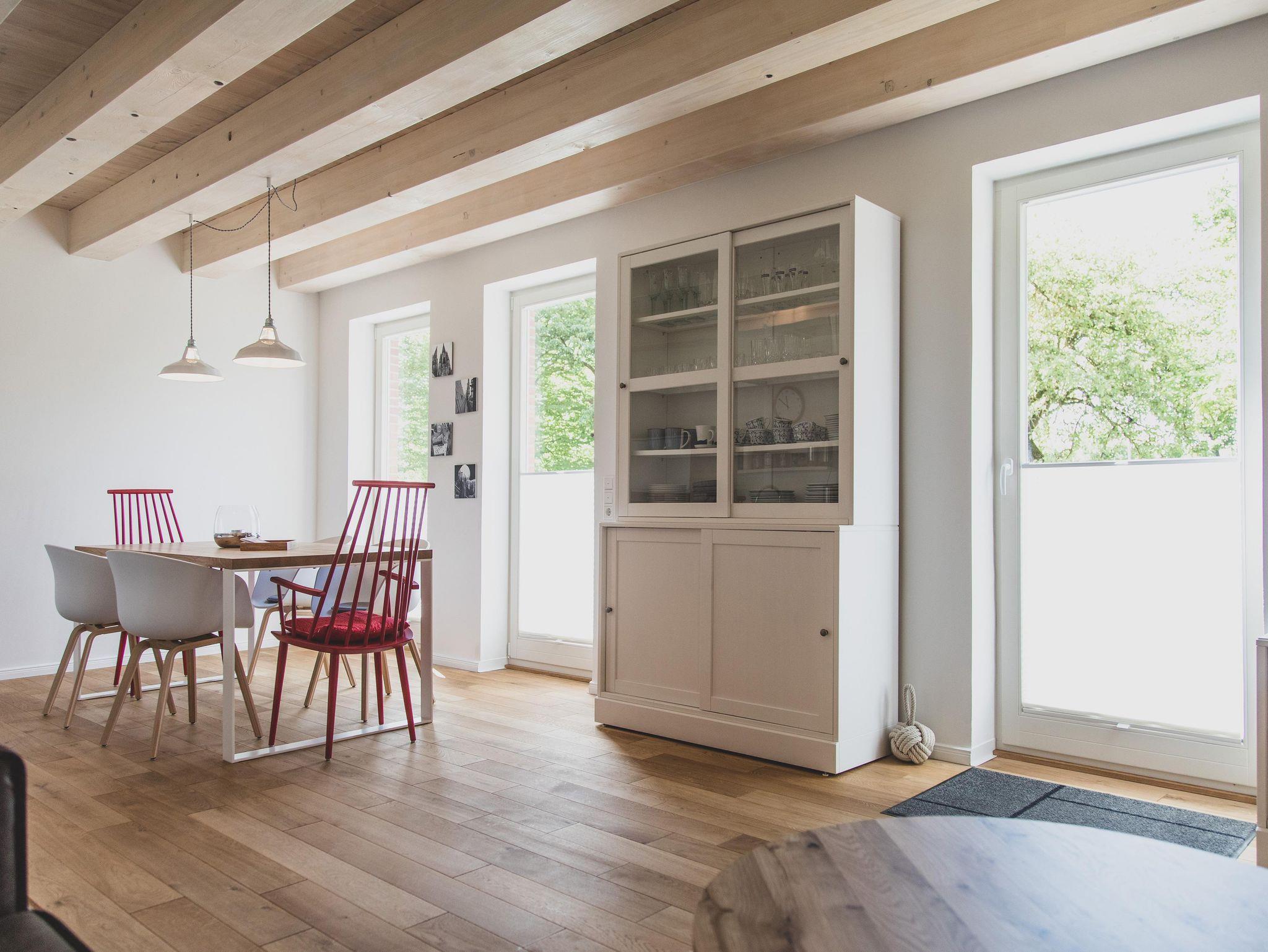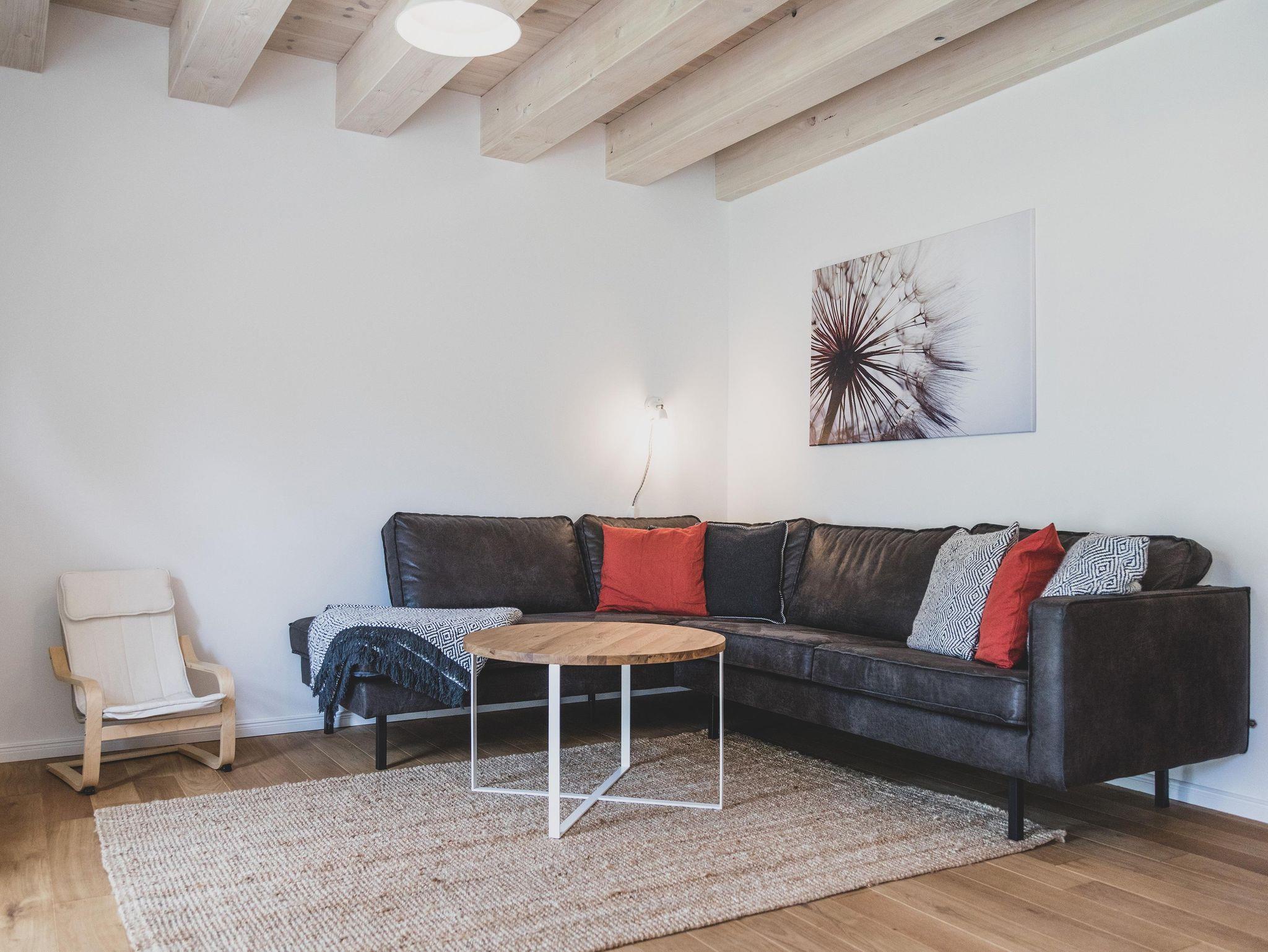 Unsere Wohnungen im Vorderhaus des Ferienhofs verfügen über hohe Decken mit durchgehend erhaltenen alten Deckenbalken. Die historischen Blockrahmenfenster und Fensterläden wurden in Handarbeit neu erstellt und runden den Anblick des denkmalgeschützten Gulfhofs ab. Im ehemaligen Scheunentrakt befinden sich durch bodentiefe Fenster helle und großzügig geschnittene Wohnungen. Alle Ferienwohnungen sind individuell, modern und mit viel Liebe zum Detail eingerichtet und bieten von der Terrasse einen erholsamen Blick auf die Grünflächen mit altem Baumbestand.