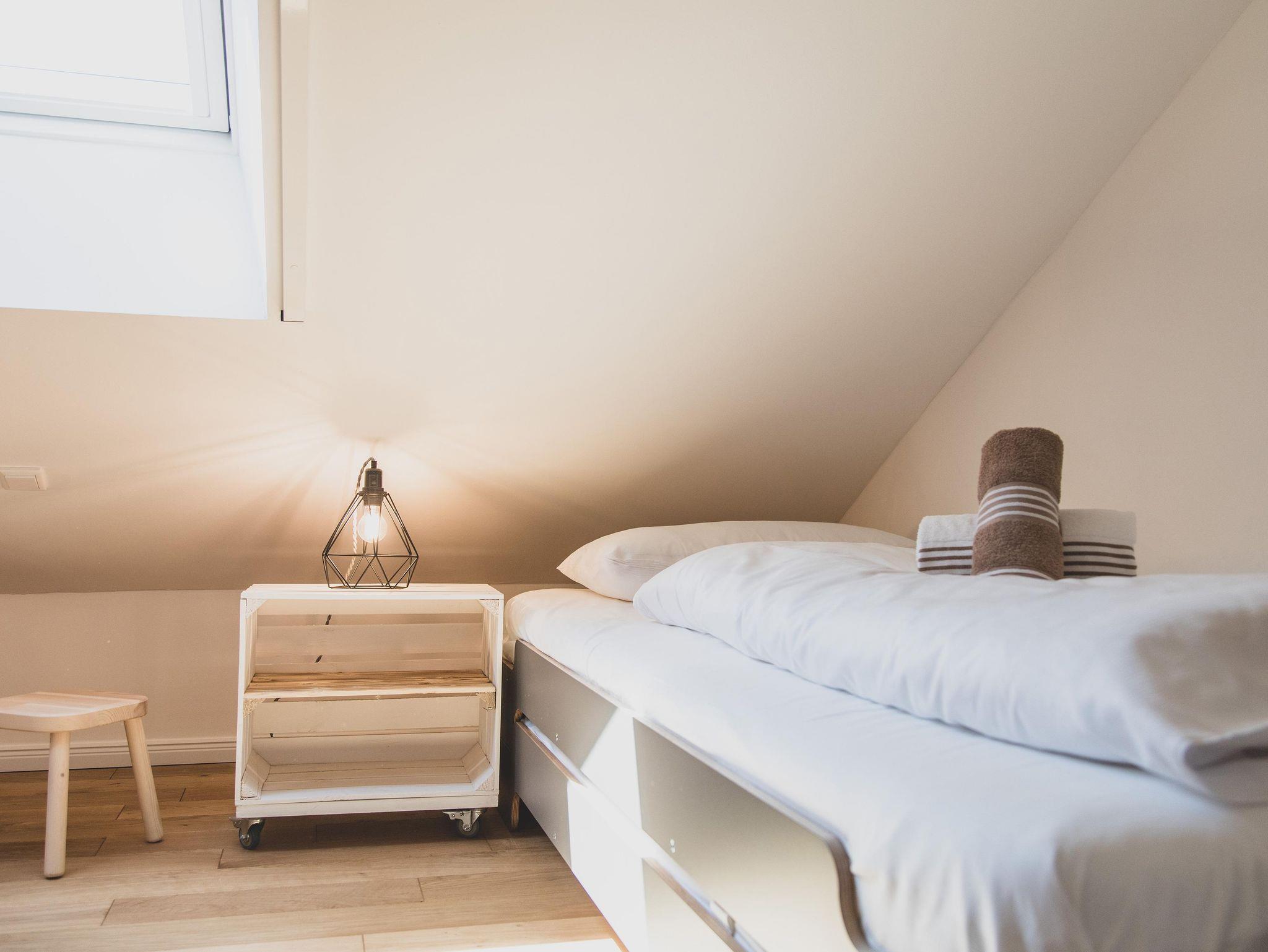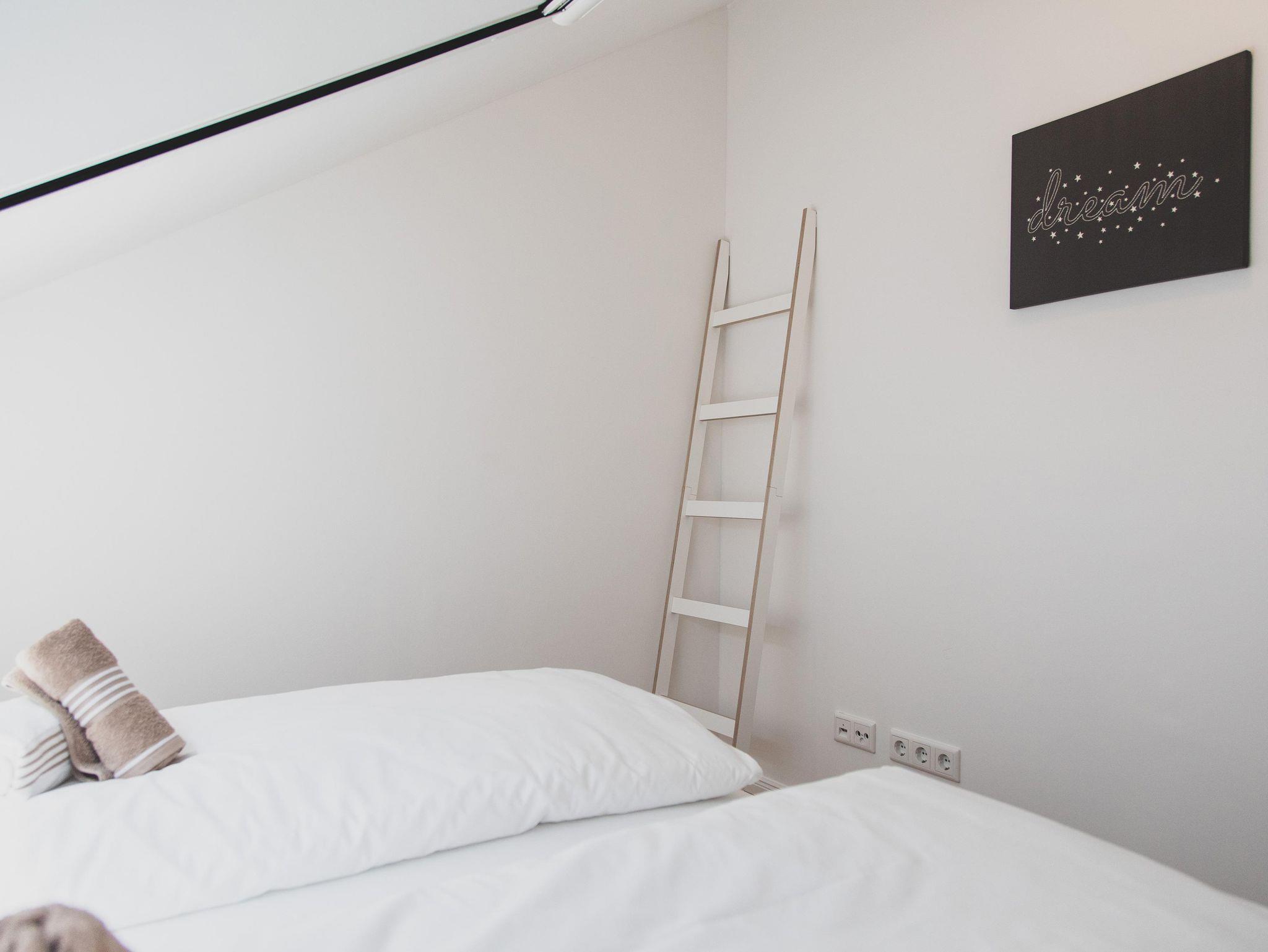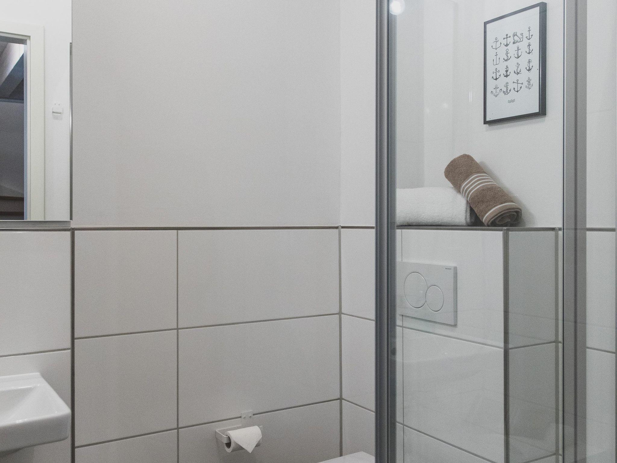 Im Obergeschoss befinden sich zwei Schlafzimmer sowie ein geräumiges Bad mit Dusche. Im Schlafzimmer 1 befindet sich ein Doppelbett, Schlafzimmer 2 bietet Platz für bis zu drei (ggf. auch vier) Kinder. Alternativ kann die Wohnung auch von 4 erwachsenen Feriengästen genutzt werden, da in Schlafzimmer 2 auch ein Doppelbett darstellbar ist. Beide Schlafzimmer verfügen über Verdunkelungs- und Insektenschutzrollos.