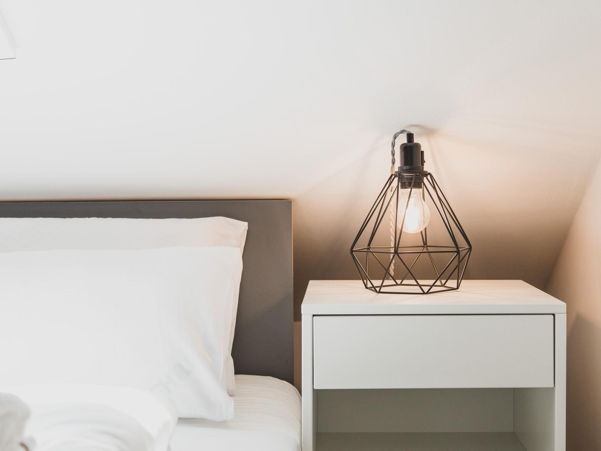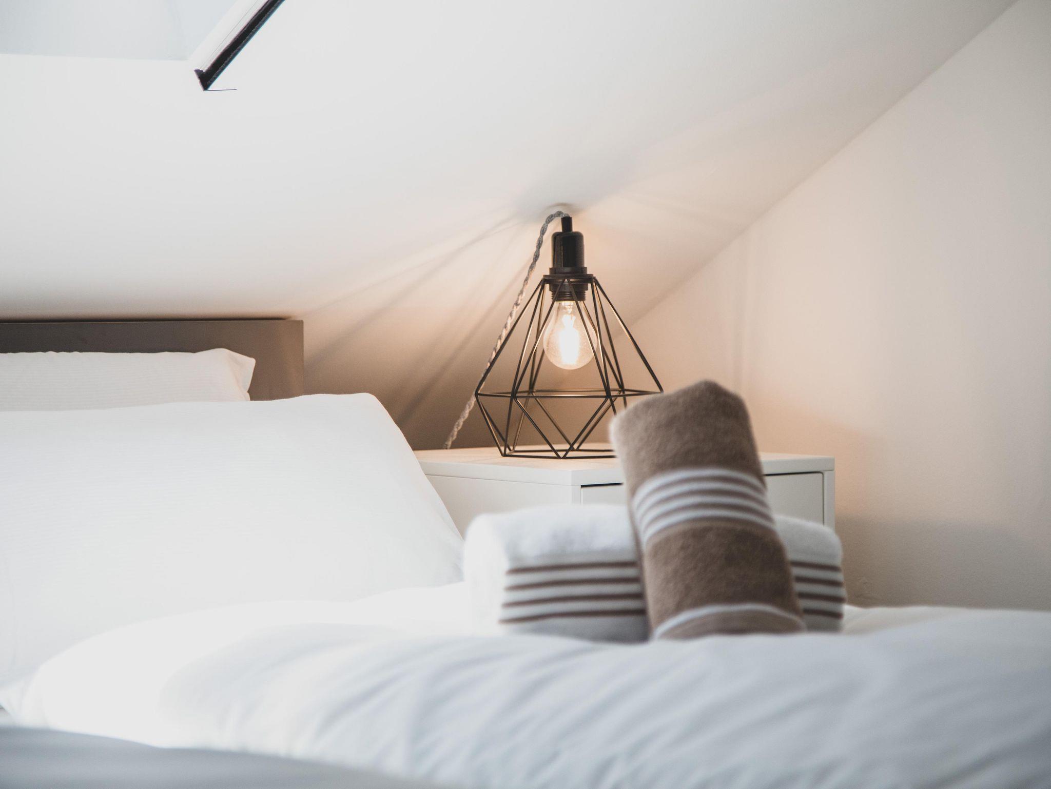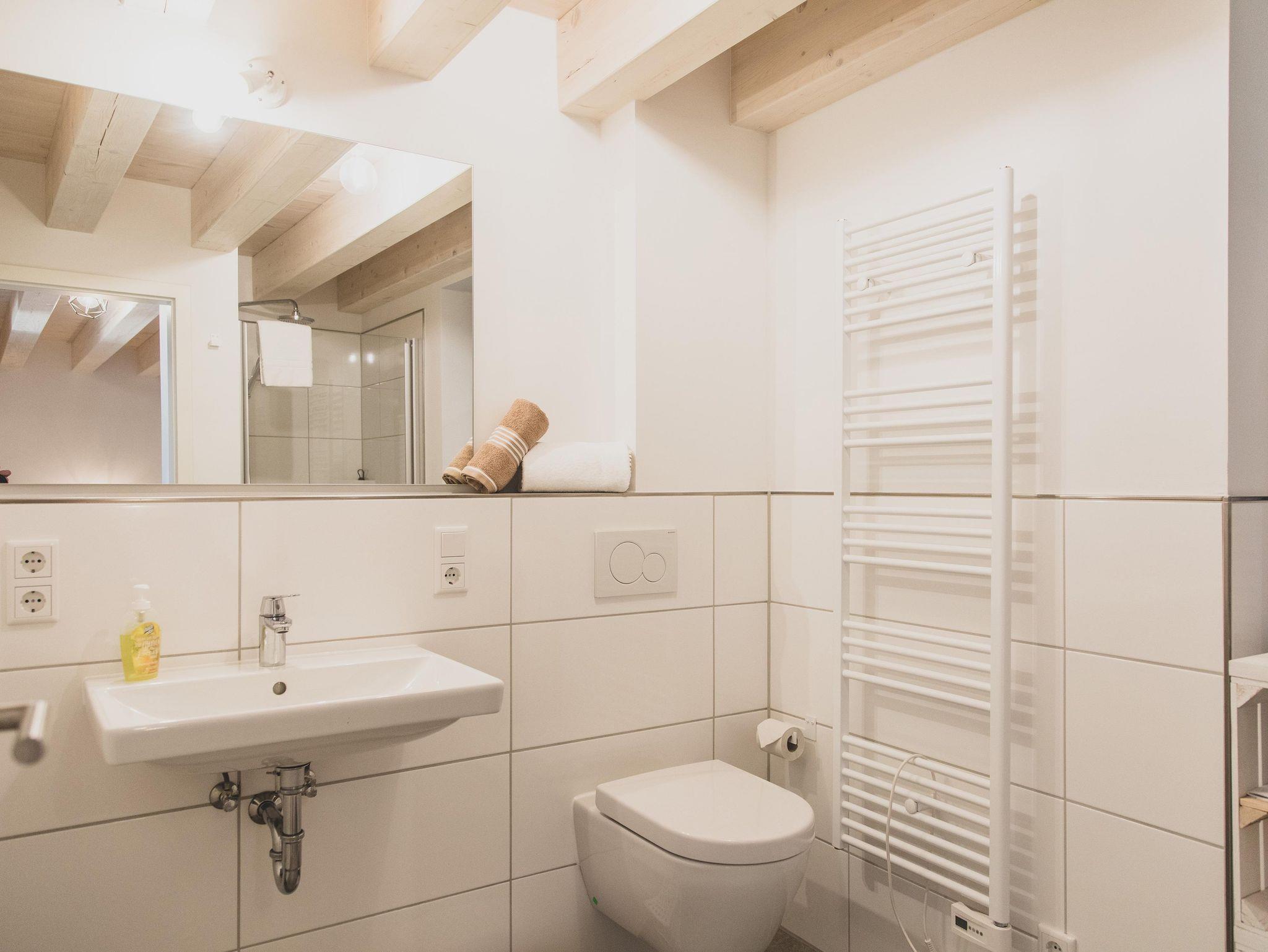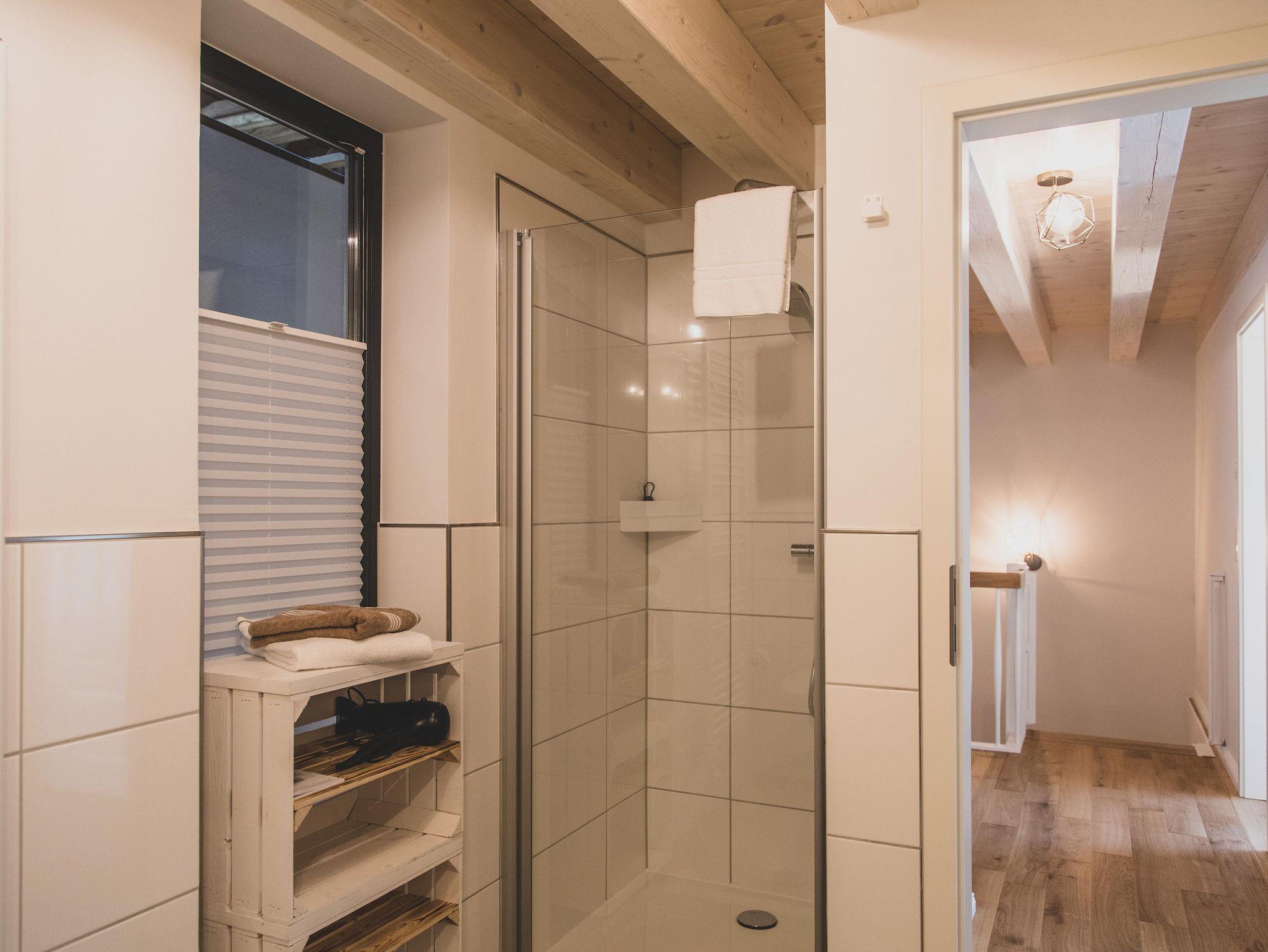 Im Obergeschoss befinden sich zwei Schlafzimmer sowie ein geräumiges Bad mit Dusche. Im Schlafzimmer 1 befindet sich ein Doppelbett, Schlafzimmer 2 bietet Platz für bis zu drei (ggf. auch vier) Kinder. Alternativ kann die Wohnung auch von 4 erwachsenen Feriengästen genutzt werden, da in Schlafzimmer 2 auch ein Doppelbett darstellbar ist. Beide Schlafzimmer verfügen über Verdunkelungs- und Insektenschutzrollos.