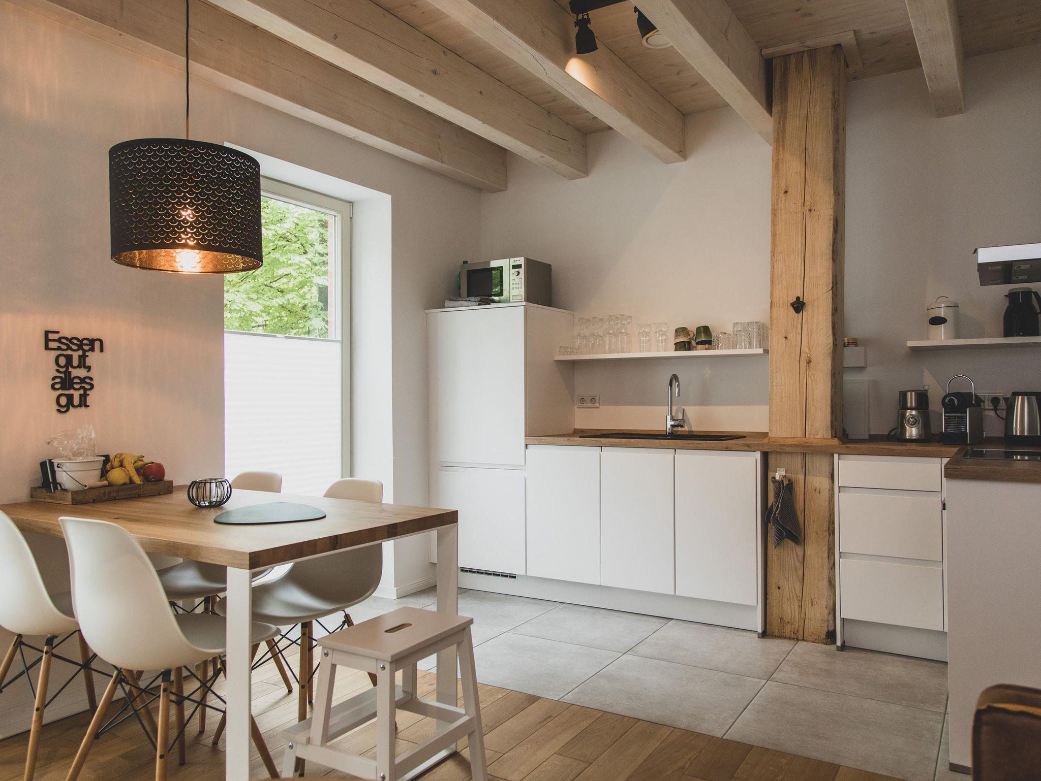 Ein denkmalgeschützter Träger des Ständerfachwerks, der auf beiden Wohnebenen sichtbar ist, verleiht der Wohnung besonderen Flair.