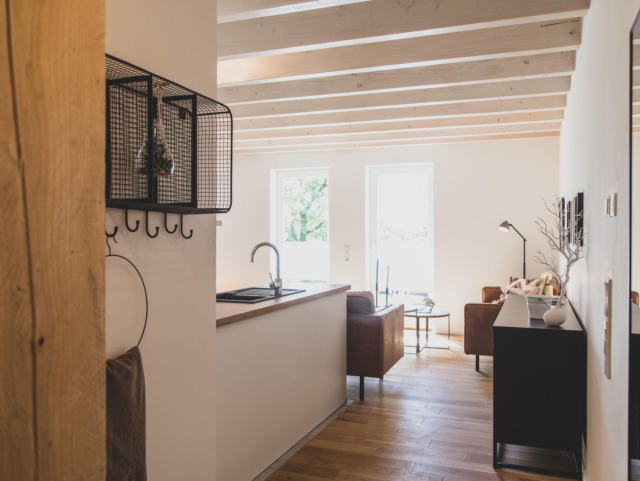 Unsere Wohnungen im Vorderhaus des Ferienhofs verfügen über hohe Decken mit durchgehend erhaltenen alten Deckenbalken. Die historischen Blockrahmenfenster und Fensterläden wurden in Handarbeit neu erstellt und runden den Anblick des denkmalgeschützten Gulfhofs ab. Im ehemaligen Scheunentrakt befinden sich durch bodentiefe Fenster helle und großzügig geschnittene Wohnungen. Alle Ferienwohnungen sind individuell, modern und mit viel Liebe zum Detail eingerichtet und bieten von der Terrasse einen erholsamen Blick auf die Grünflächen mit altem Baumbestand.