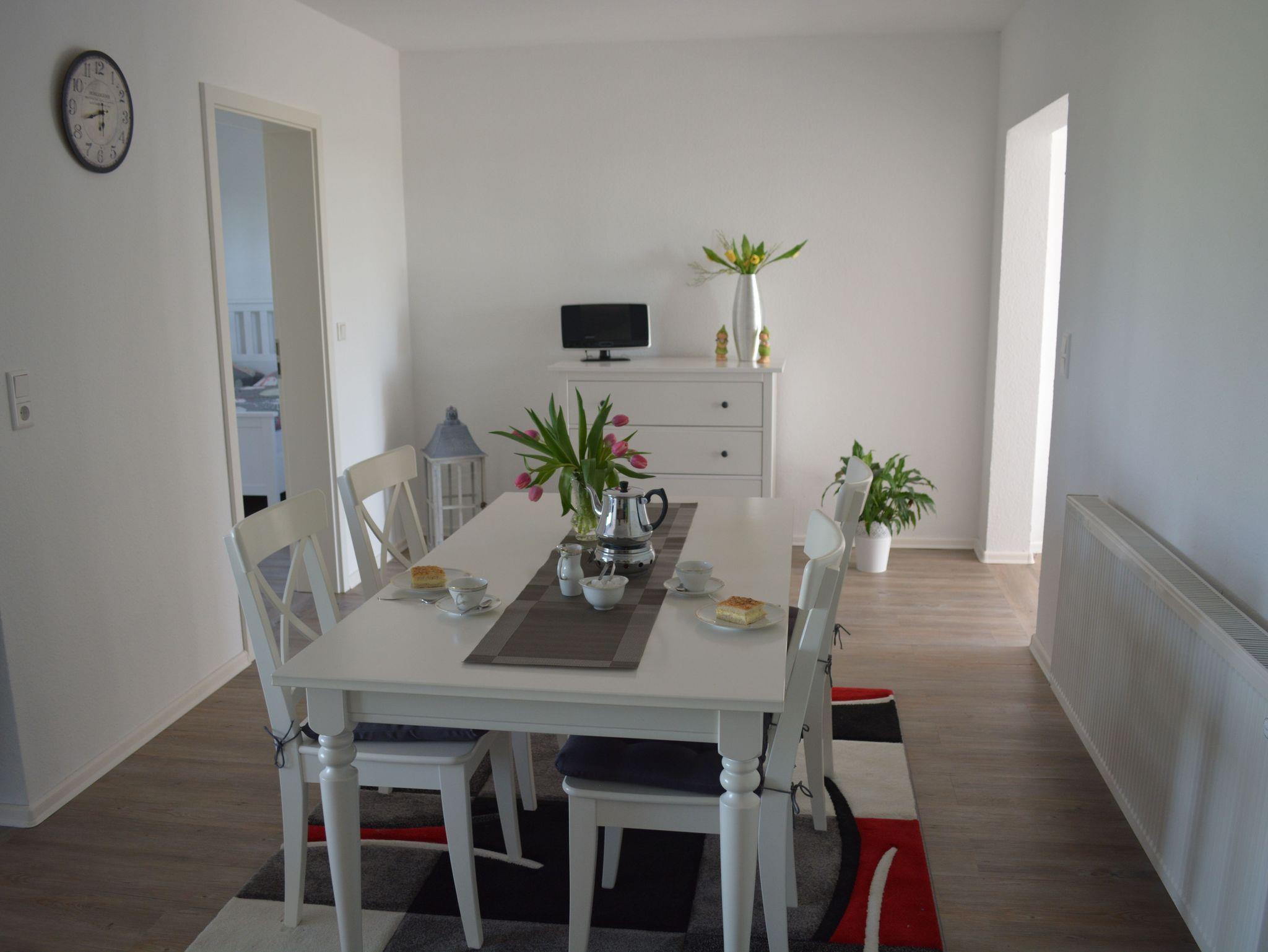Die ebenerdige sowie modern und hell eingerichtete Ferienwohnung (ca. 68 qm) bietet Platz für bis zu 4 Personen. Sie verfügt über zwei separate Schlafzimmer (ein Schlafzimmer mit Doppelbett 1,80 m x 2,00 m und einem Schlafzimmer mit zwei Einzelbetten jeweils 0,90, x 2,00 m). Dem großzügigen Wohn- und Essbereich ist eine Küche mit E- Herd, Backofen, Geschirrspüler, Kühlschrank mit Gefrierfach, Toaster, Wasserkocher und Kaffeemaschine angegliedert. Das Bad mit ebenerdiger Dusche und WC verfügt zudem über eine Fußbodenerwärmung. SAT-TV, Stereoanlage und WLAN sind vorhanden. Kinderreisebett sowie ein Hochstuhl können zur Verfügung gestellt werden. Mit zur Ferienwohnung gehört eine separate Terrasse, welche mit Gartenmöbeln und Sonnenschirm ausgestattet ist. Der Internetzugang ist für unsere Gäste selbstverständlich kostenfrei. Wachmaschine und Wäschetrockner befinden sich ebenfalls in der Anlage und können gegen Gebühr genutzt werden. Handtücher und Bettwäsche werden einmalig gestellt (weitere Wechsel sind selbstverständlich gegen Gebühr möglich). Wir bitten im Interesse unserer allergischen Gäste um Verständnis, dass das Mitbringen von Haustieren nicht gestattet ist. Das Rauchen ist im Außenbereich möglich. Vermietung ausschließlich an Feriengäste, nicht an Firmen.