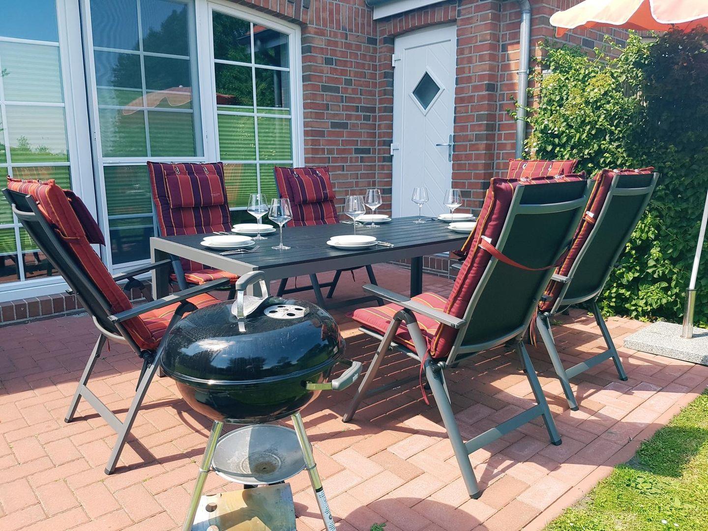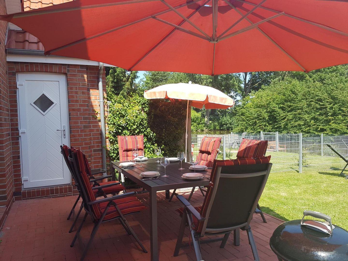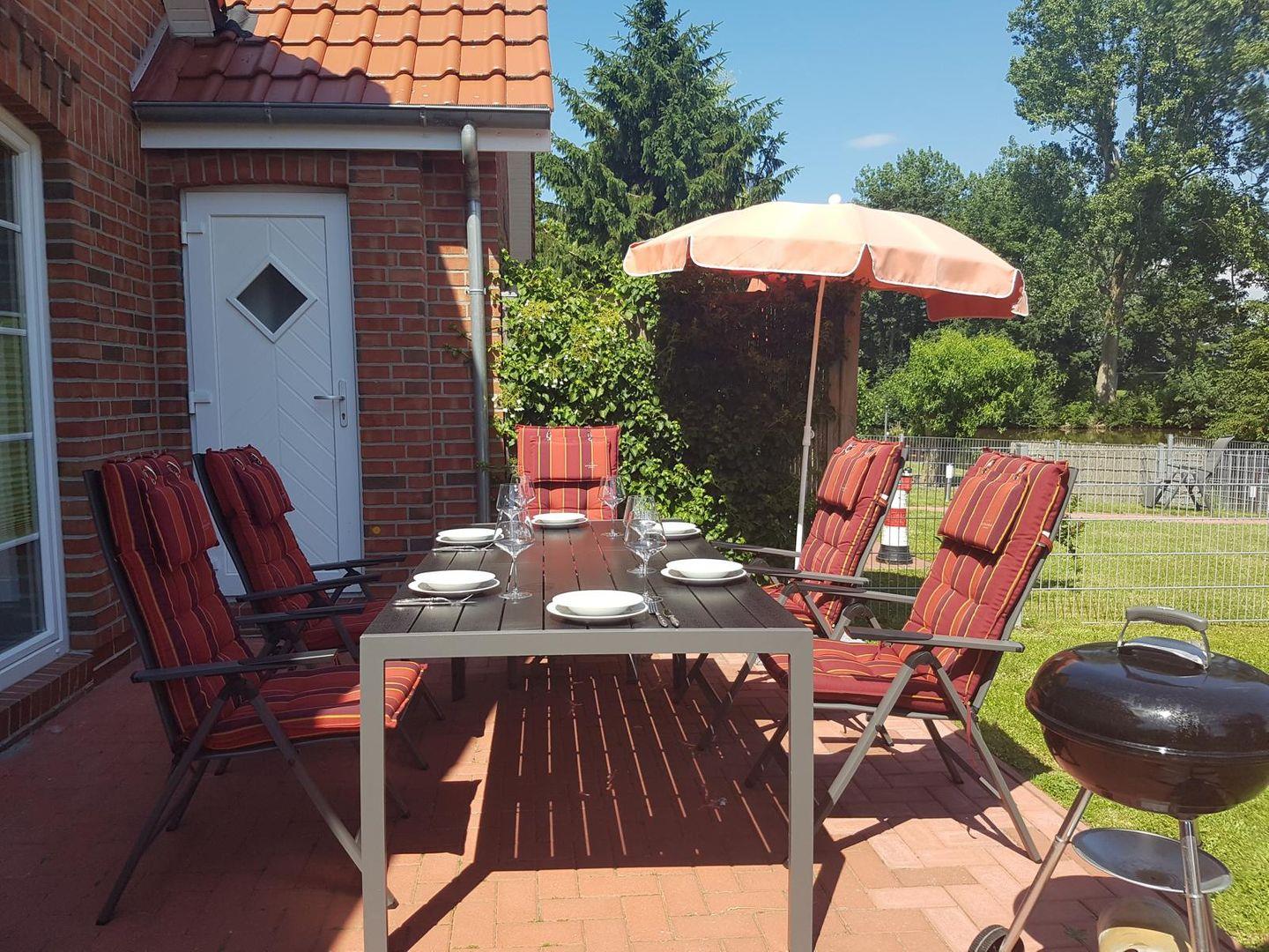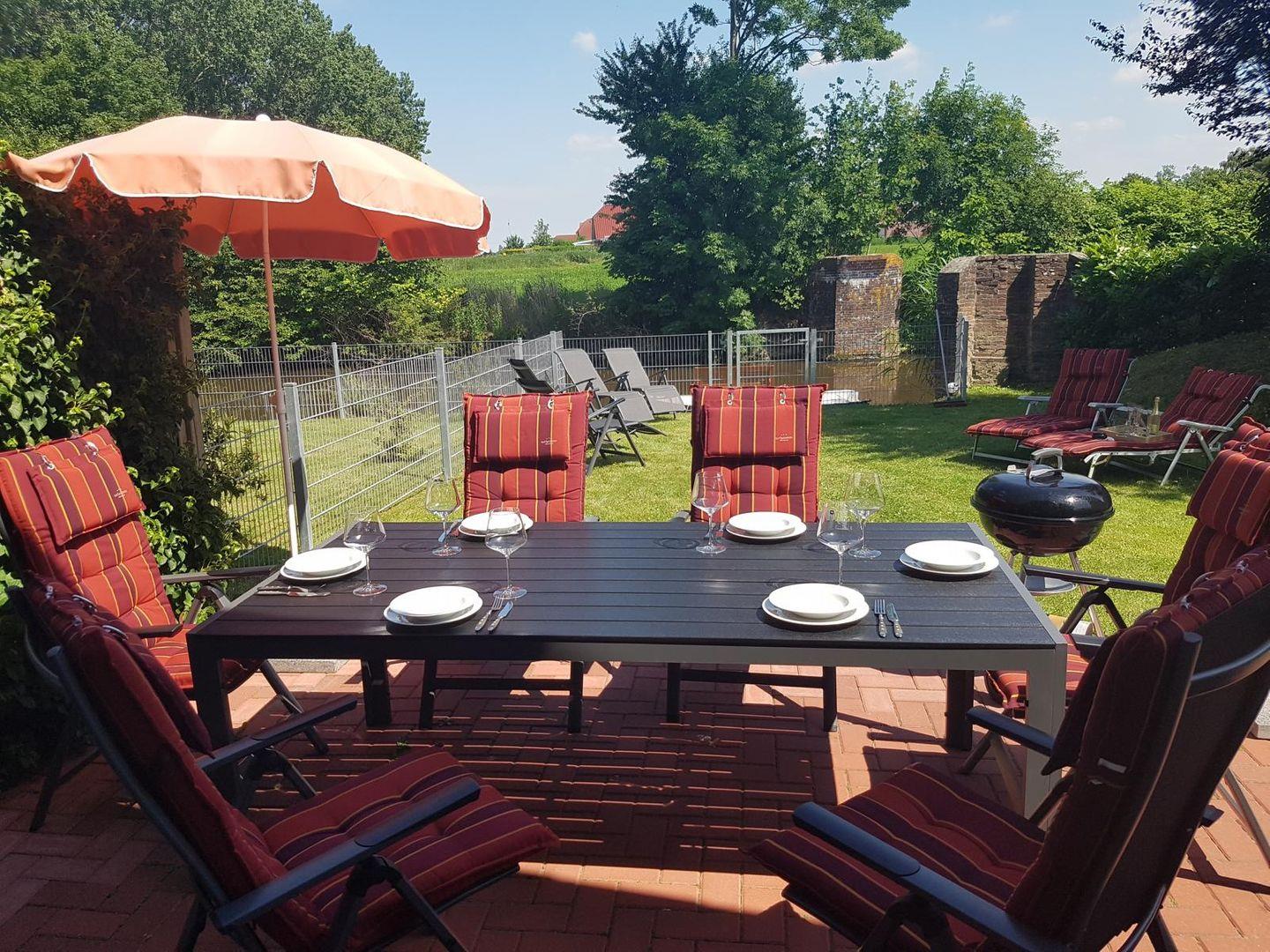 Sie finden 4 Hochlehner, 2 Hochlehner mit Liegefunktion sowie zwei Sonnenliegen. Neben einem Sonnenschirm mit fahrbarem Ständer finden sie auch einen großen Ampelschirm. Die Terrasse ist zur Sonnenseite ausgerichtet und bietet einen wunderschönen Blick auf das Siel. Für Schatten sorgt nachmittags ein Zierkischenbaum.