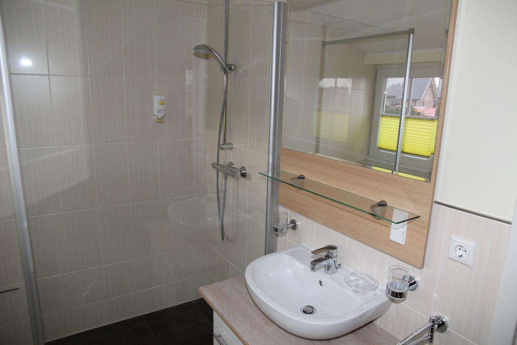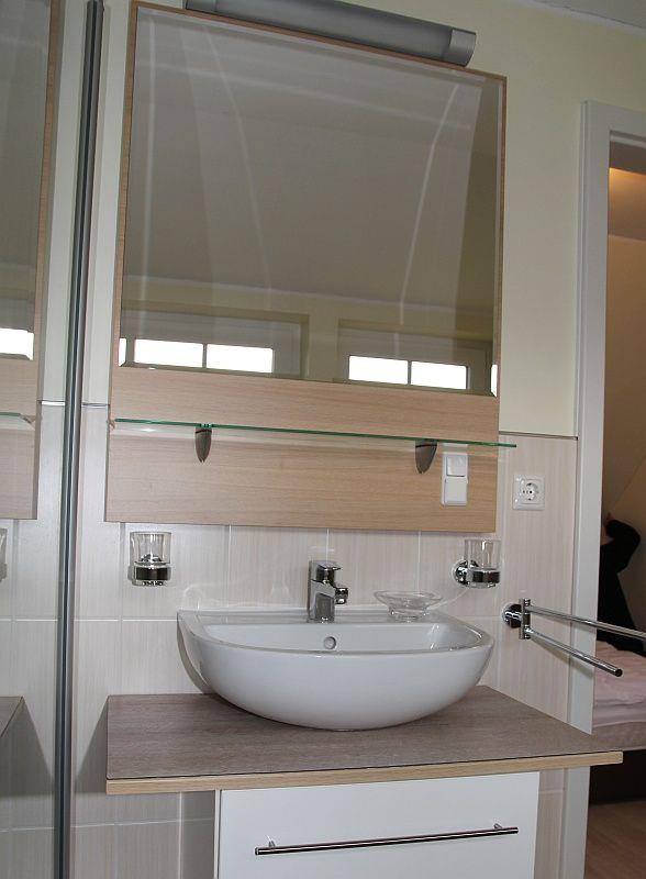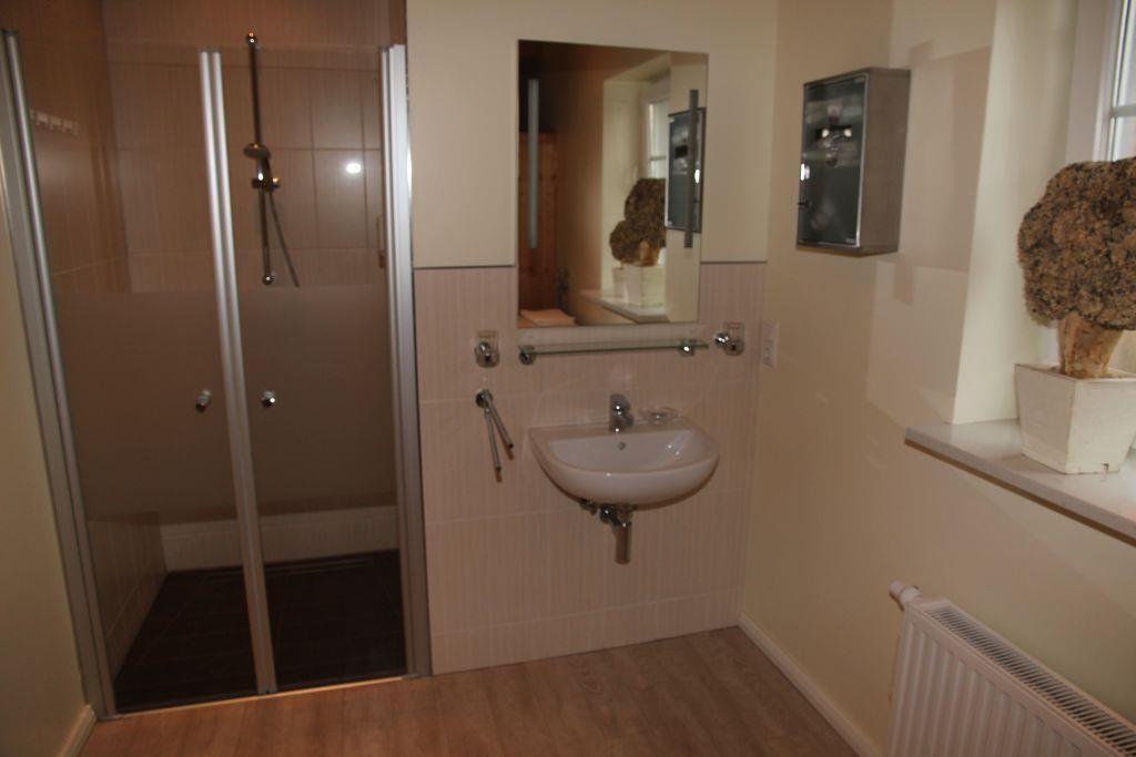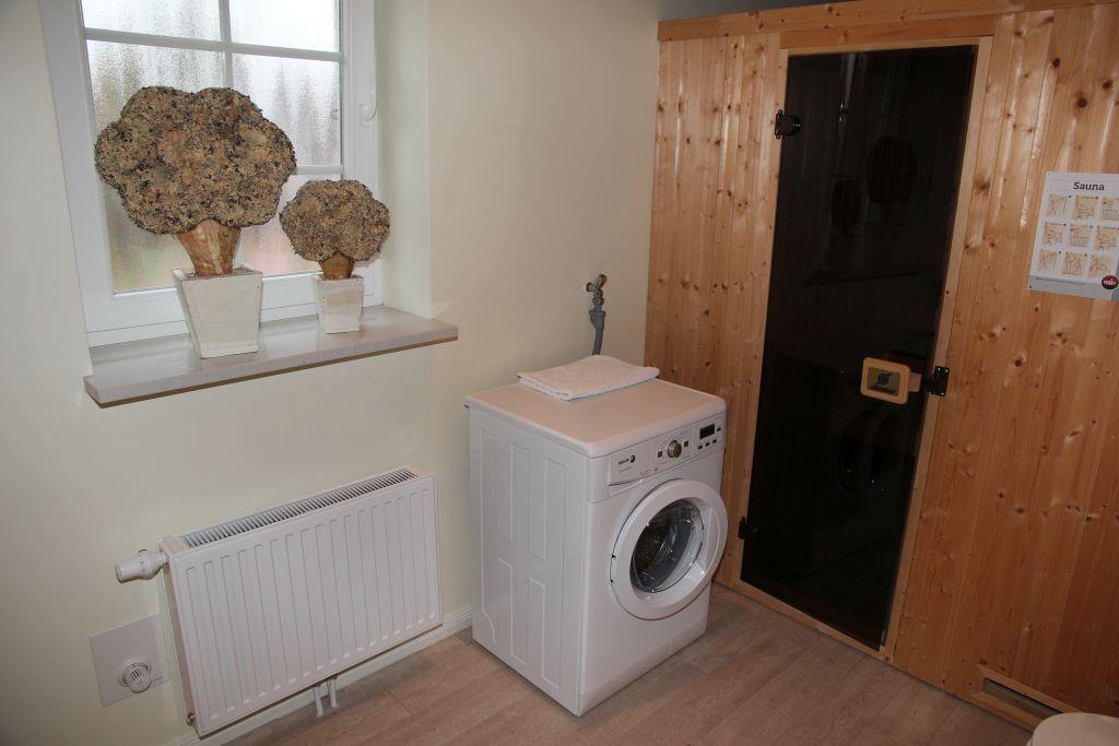 Im Erdgeschoss finden Sie ein großzügiges Bad mit bodentiefer Dusche, Waschbecken mit großem Spiegel und WC, sowie die Sauna für 2 bis 5 Personen. Der Waschtrockner bietet einen Stauraum von 5kg, für kleine Missgeschicke ist ein Erste-Hilfe-Schrank angebracht. Im kleinen Hauswirtschaftsraum finden Sie auch ein Bügelbrett mit Bügeleisen und Wäschespinne.