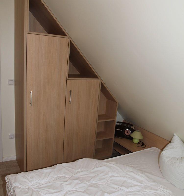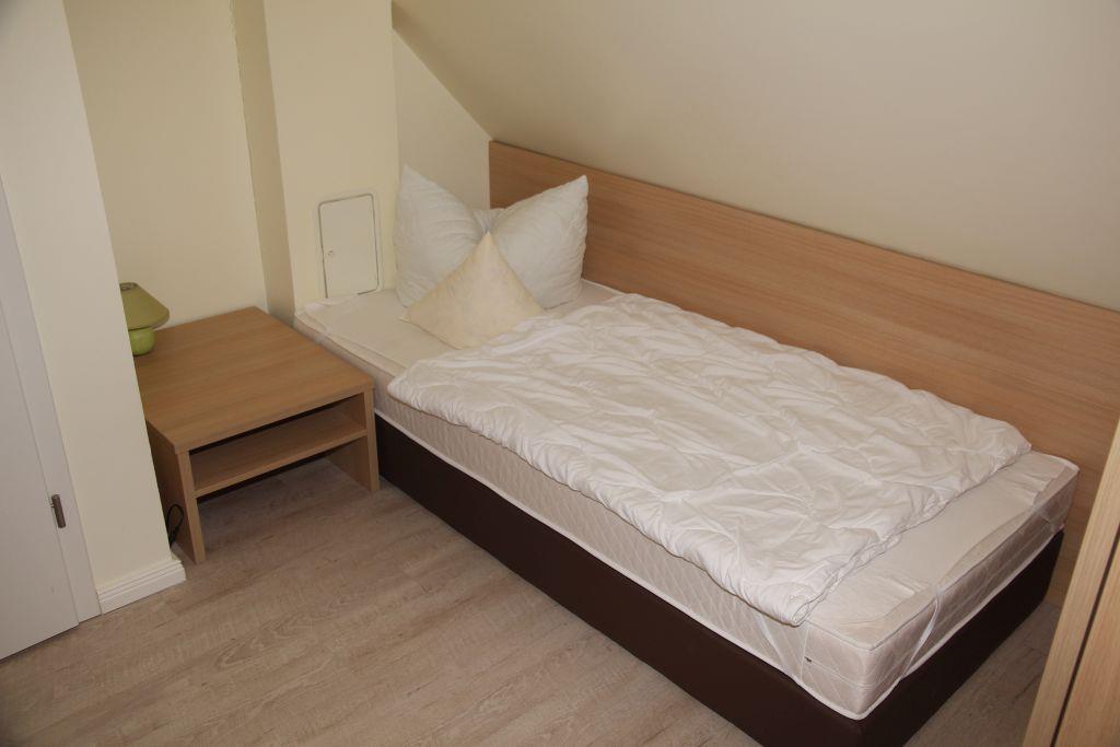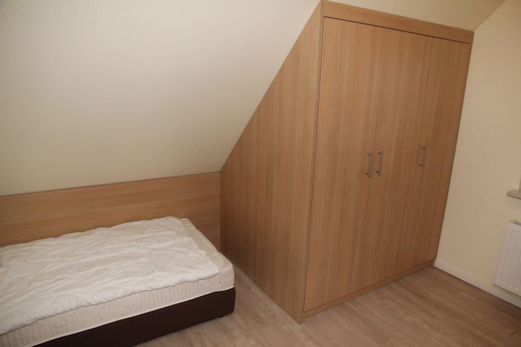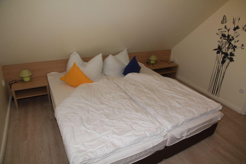 Das zweite Schlafzimmer im Obergeschoss ist mit einem Doppelbett und einem Einzelbett ausgestattet, im Wandschrank befindet sich ein Regal-Safe und neben dem Einzelbett steht ein kleiner Fernseher mit DVD-Spieler.