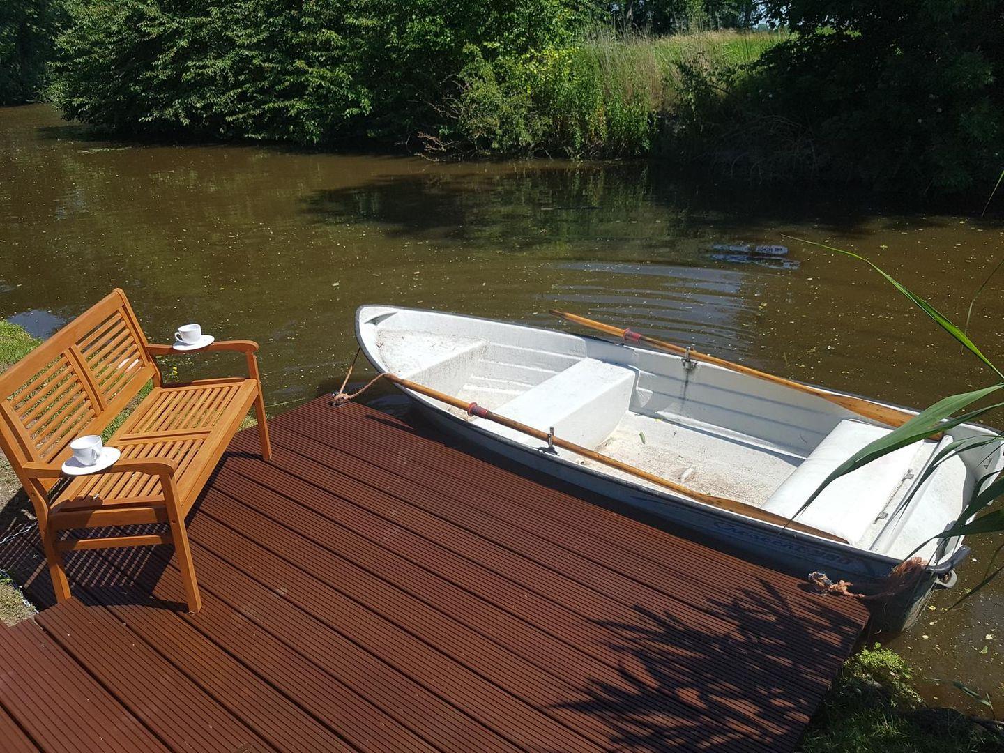 Mit dem ebenfalls zur Ausstattung gehörenden kleinen Boot (muss ggf. mit Bewohnern des Hauses Backbord geteilt werden, Verfügbarkeit des Bootes nur von April bis Ende Oktober und ohne Gewähr) können Sie direkt vom eigenen Steg zu Ihrer Entdeckungs- oder Angeltour durch die ostfriesischen Kanäle und Tiefs starten. Für Kinder liegen eine Rettungsweste 20- bis 30kg und eine 30- bis 40kg bereit.