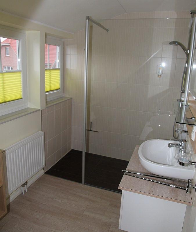 Im Obergeschoss befinden sich die beiden geräumigen Schlafzimmer. Ein Schlafzimmer mit Doppelbett verfügt über einen direktem Zugang zum zweiten Bad, in dem Sie eine bodentiefe Dusche, WC und Waschbecken mit großem Spiegel und Kosmetikspiegel erwartet. Drei Fenster sorgen hier für Tageslicht.