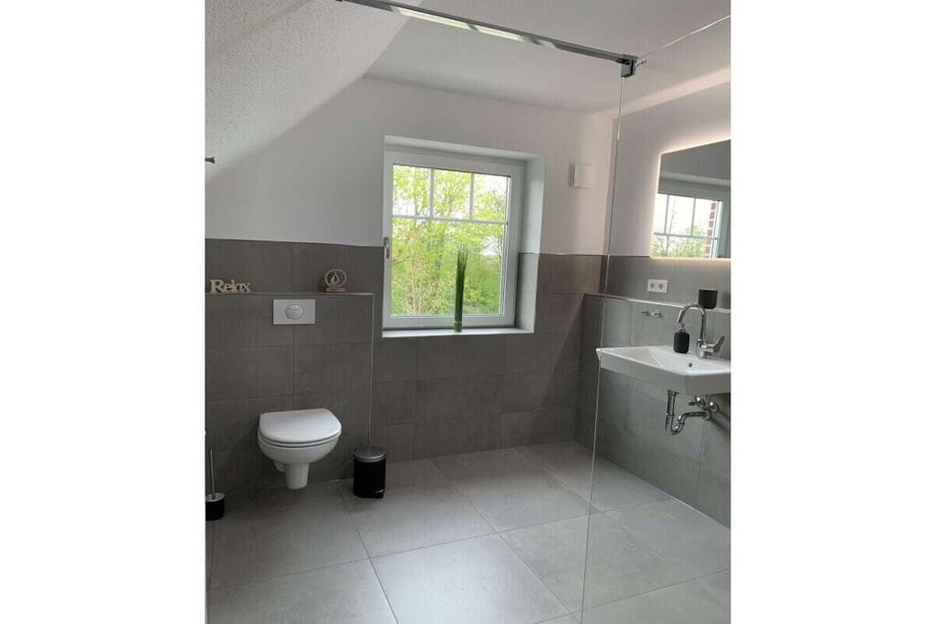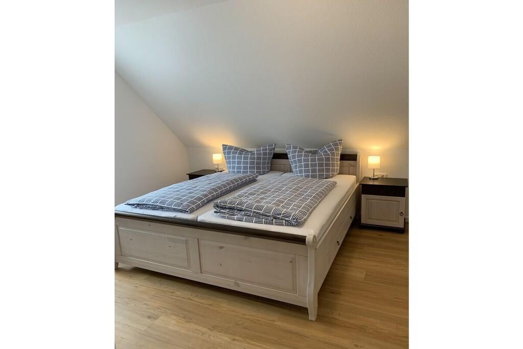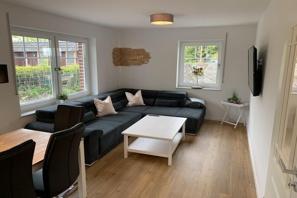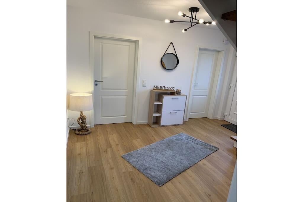 Vores sommerhus Meerzeit stod færdigt i 2021 og er udstyret til op til 6 personer. Boligen er indrettet til en høj standard og er moderne og har gulvvarme overalt, hvilket sikrer et behageligt ophold selv på kolde vinterdage. I indgangspartiet til højre er der et lille toilet med bruseniche. Bryggerset ligger også i højre side. En vaskemaskine er tilgængelig her gratis. Stueetagen har et soveværelse med dobbeltseng (140 cm x 200 cm). Opholds- og spiseområdet har en stor sofa, et dejligt opholdsområde og et stort fladskærms-tv. Vores køkken er også fuldt udstyret. Der er yderligere tre soveværelser på første sal. To med en enkeltseng hver og en med dobbeltseng (180 cm x 200 cm). Der er fjernsyn i alle soveværelser. Der er desuden et flot, stort badeværelse med bruseniche (150 cm x 100 cm) på øverste etage.
