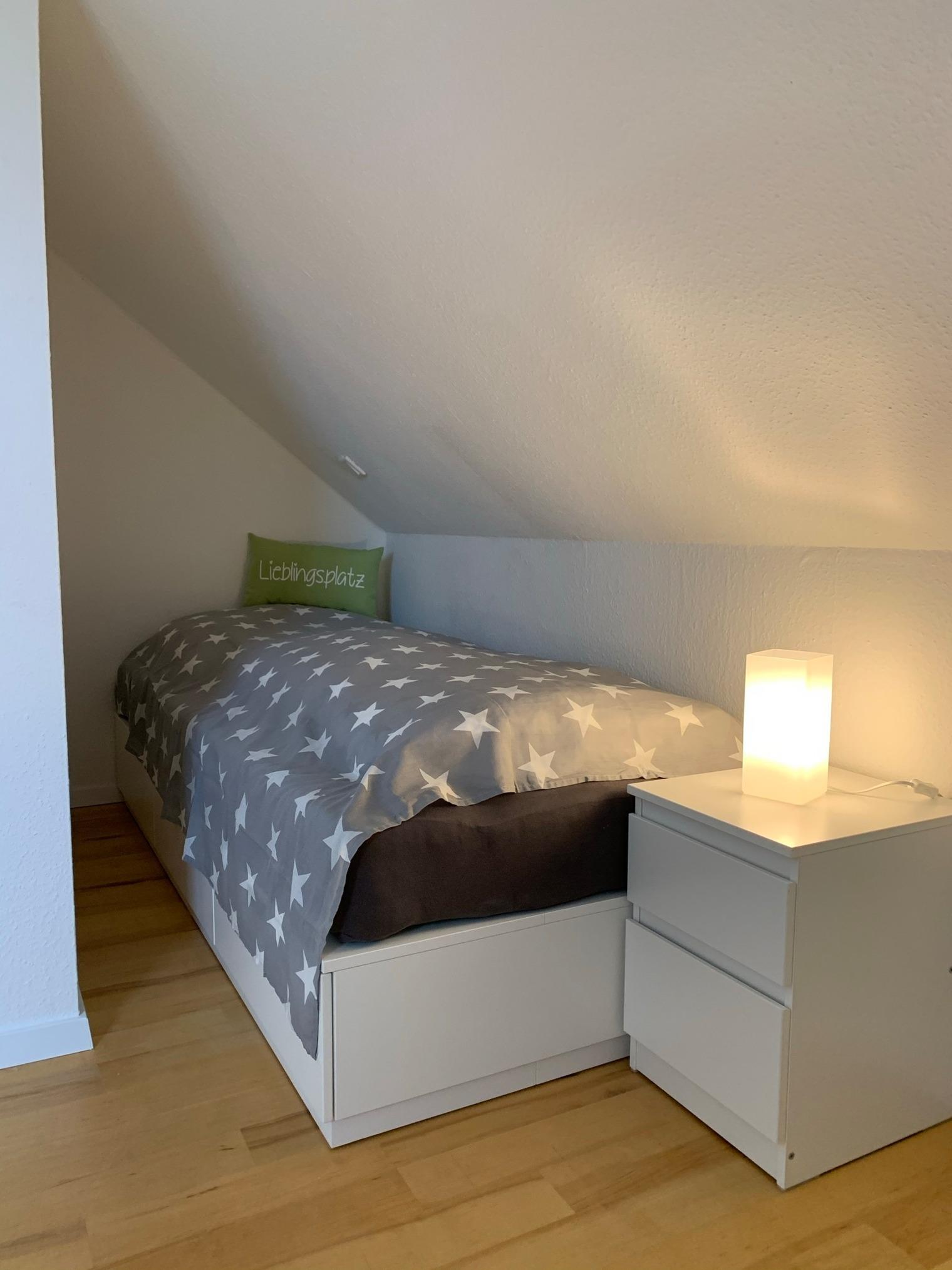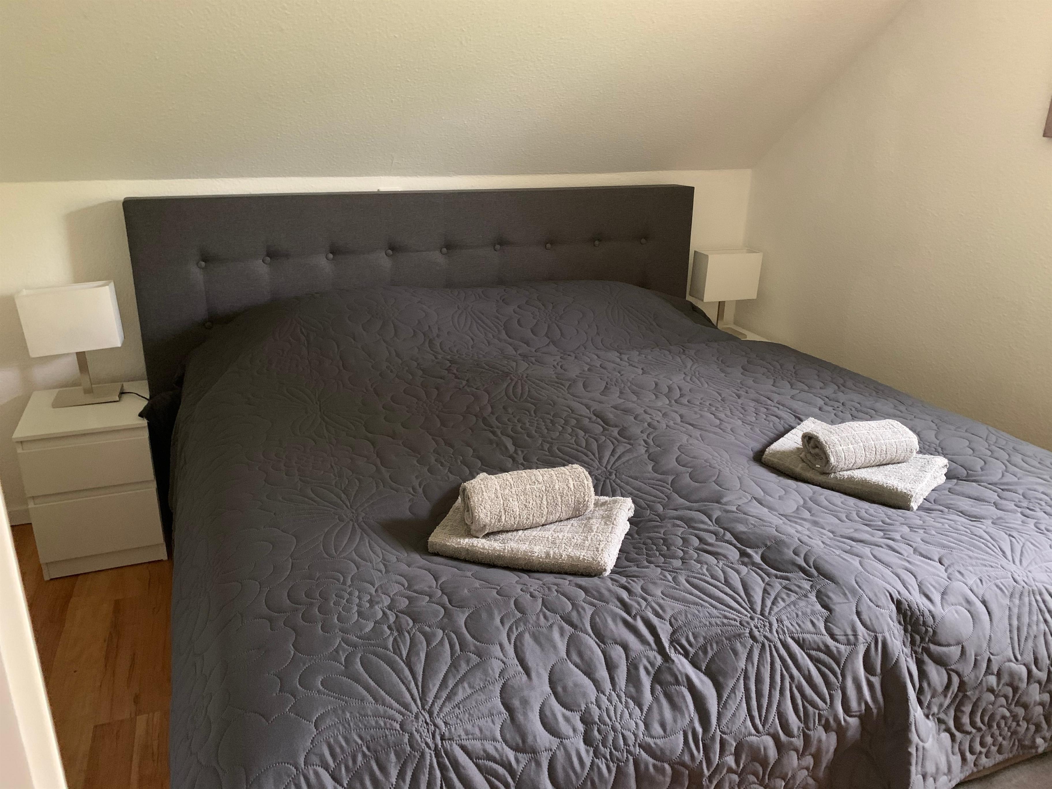 Vom Wohnzimmer aus, gelangen Sie über eine breite Metalltreppe in das ausgebaute Obergeschoss. Oben angekommen finden Sie zwei gemütliche Schlafzimmer mit Einbauschränken, sowie ein modernes Tageslichtbad mit Regendusche.