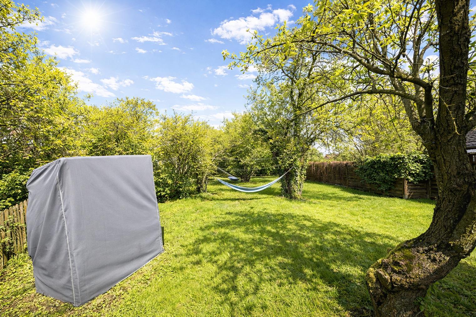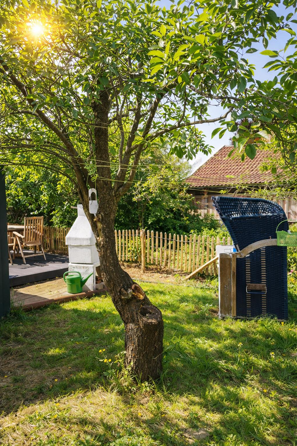 Besonders schön: der große, naturbelassene Garten mit Obstbäumen, Strandkorb, Hängematte und einem Gartenhaus mit Kaminofen. Hier lässt man die Seele baumeln — ob bei Sonnenschein im Grünen oder abends am knisternden Feuer. In der Erntezeit dürfen Sie vom Obst naschen.