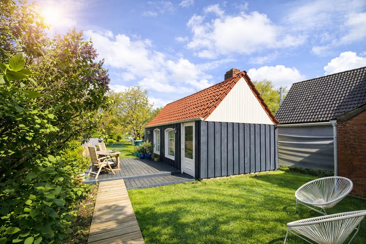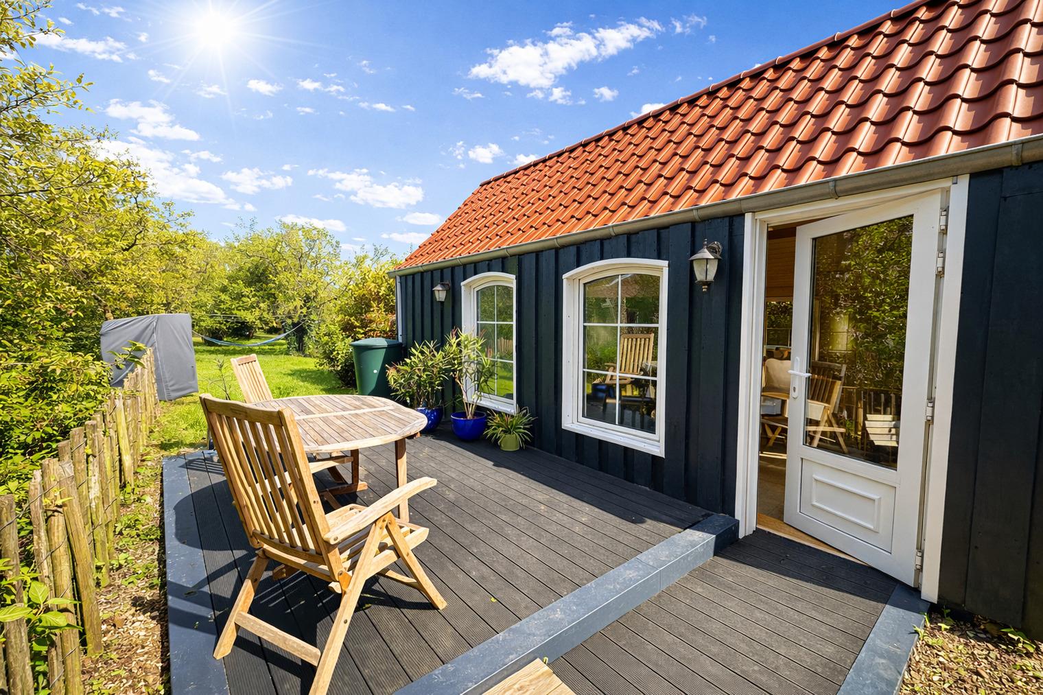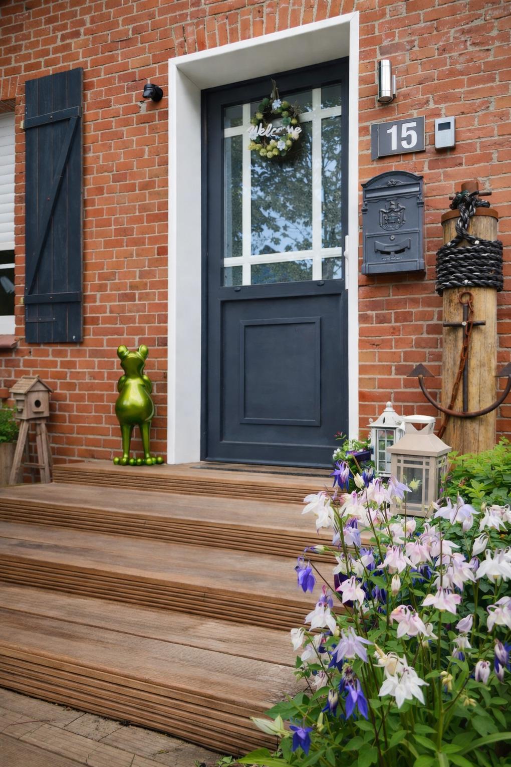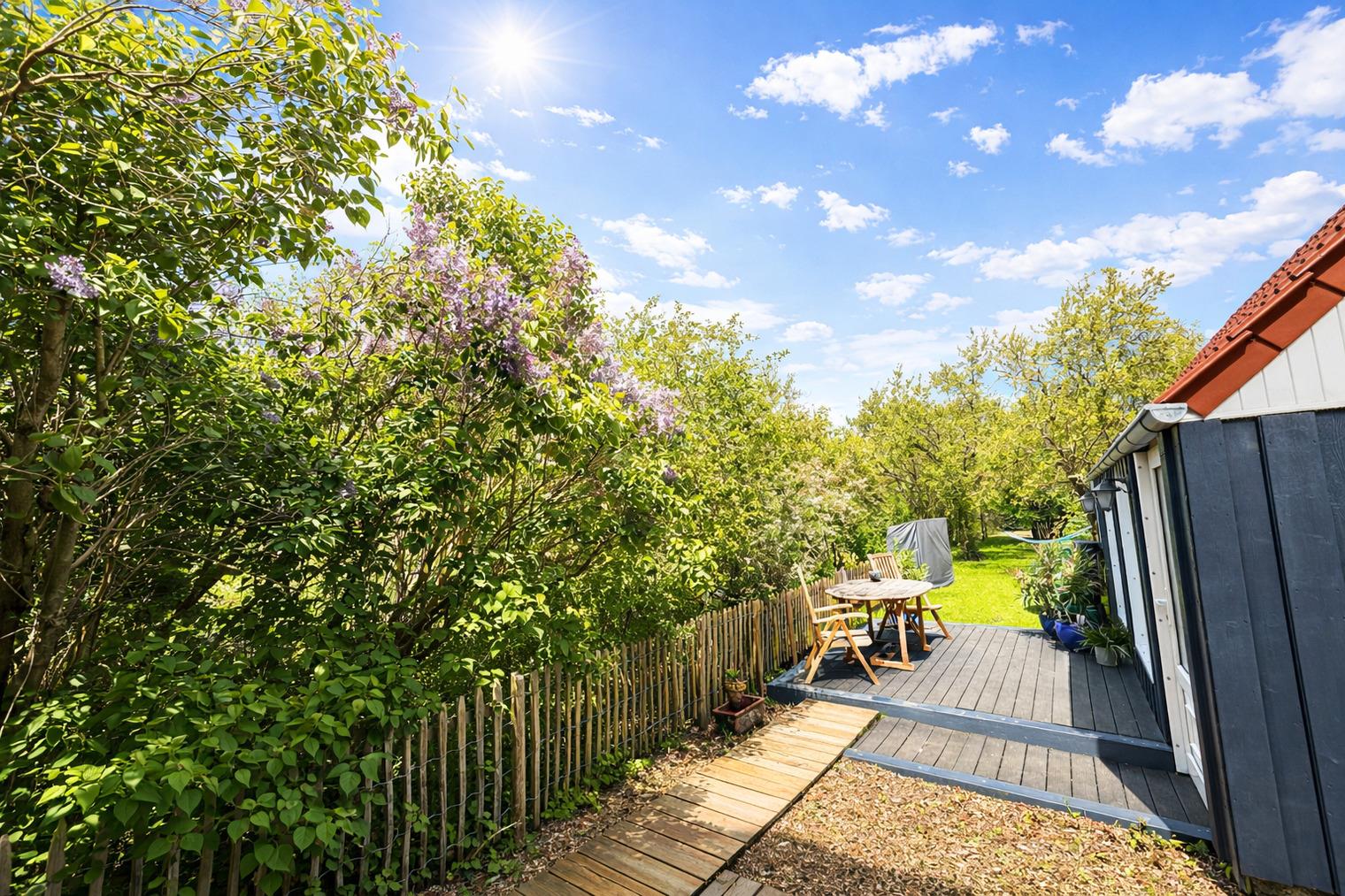 Vor dem Gartenhaus ist unsere Terrasse, die ausgestattet ist mit einem echten Nordseestrandkorb und einer Tischgruppe aus Teakholz. Einen Grill haben wir auch für Sie.