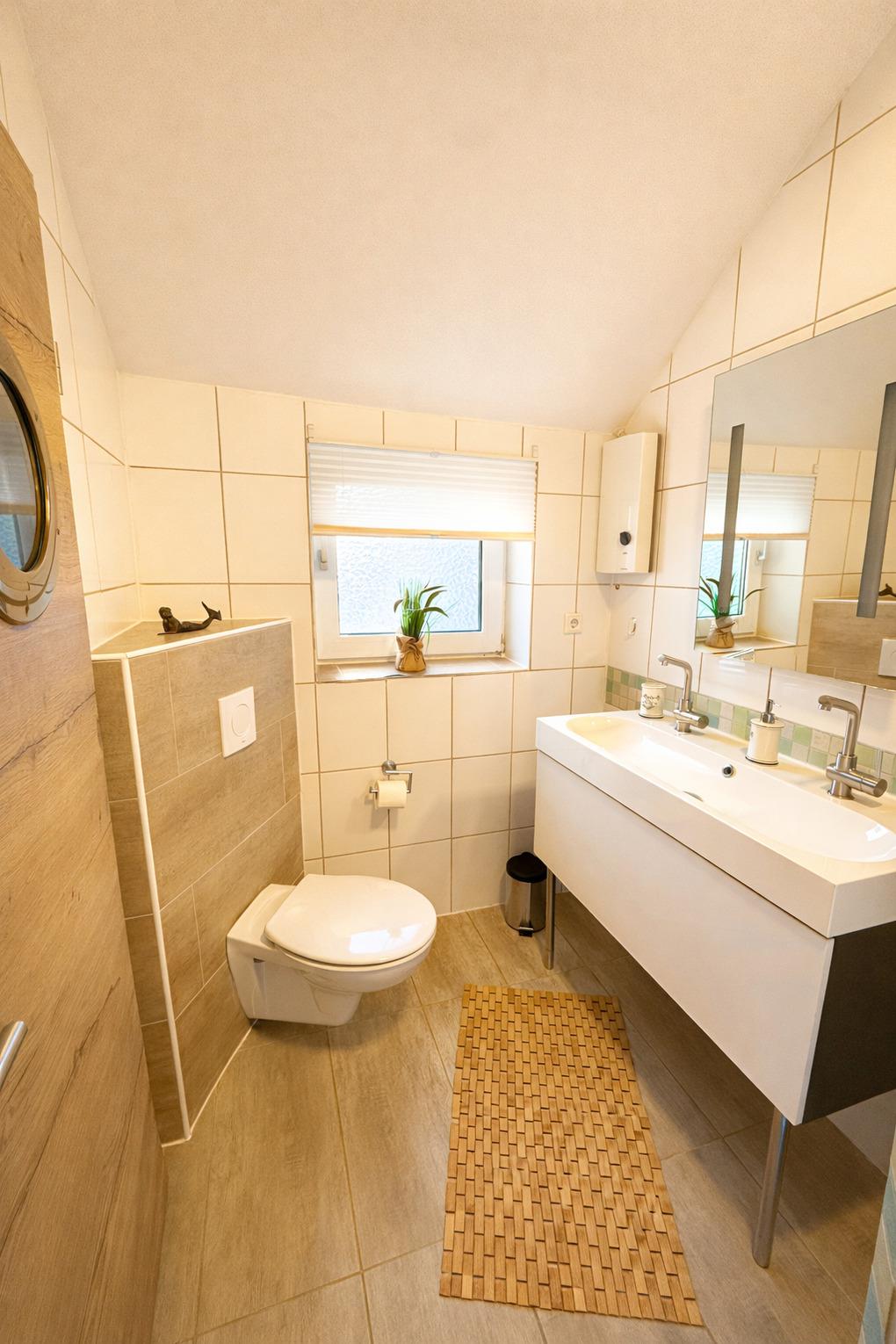 Das Bad hat ein Doppelwaschbecken und ist mit Handtüchern ausgestattet. Das Schlafzimmer hat ein großes Doppelbett in 180x200 cm, Bettwäsche in 155x220cm und einen Fernseher.