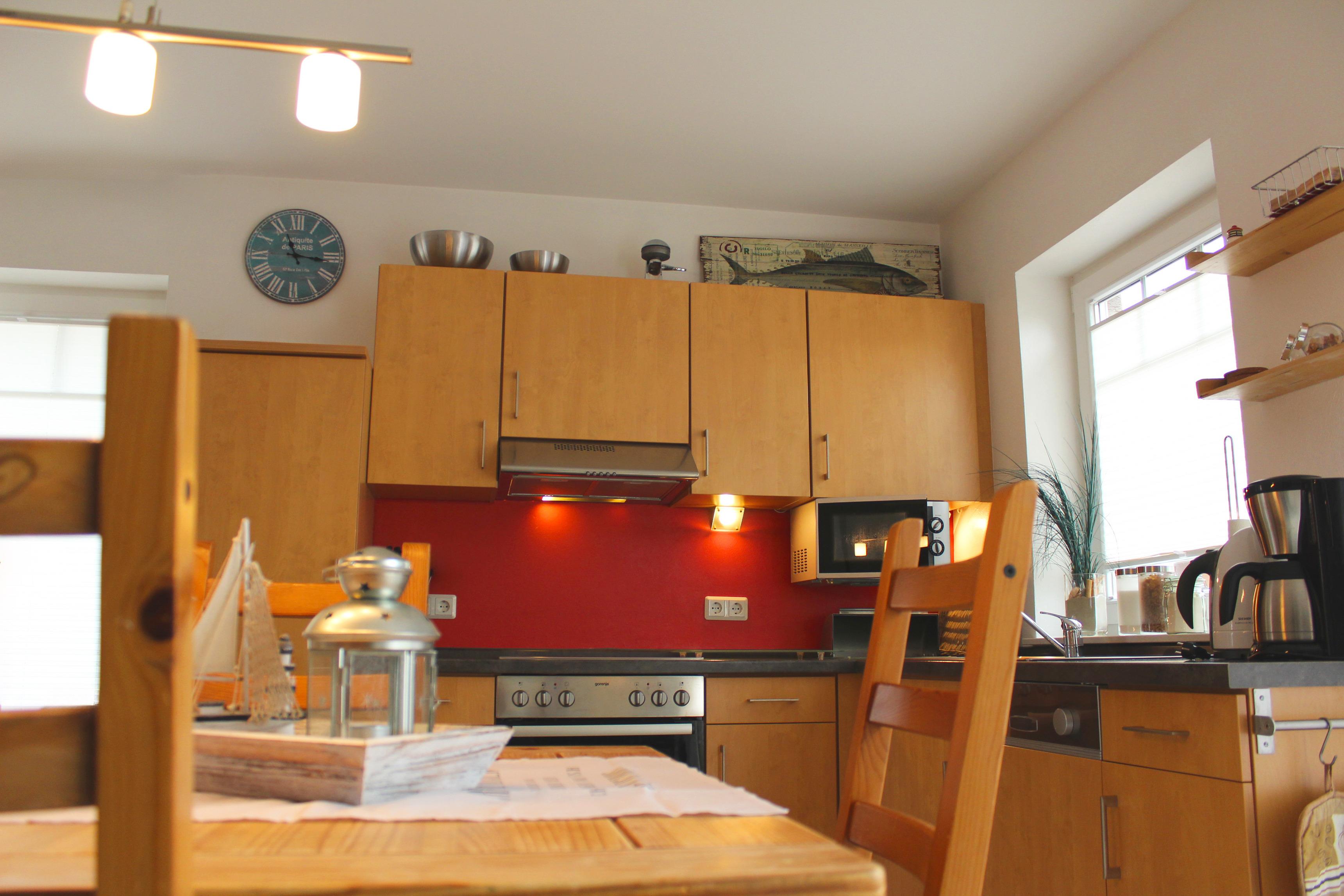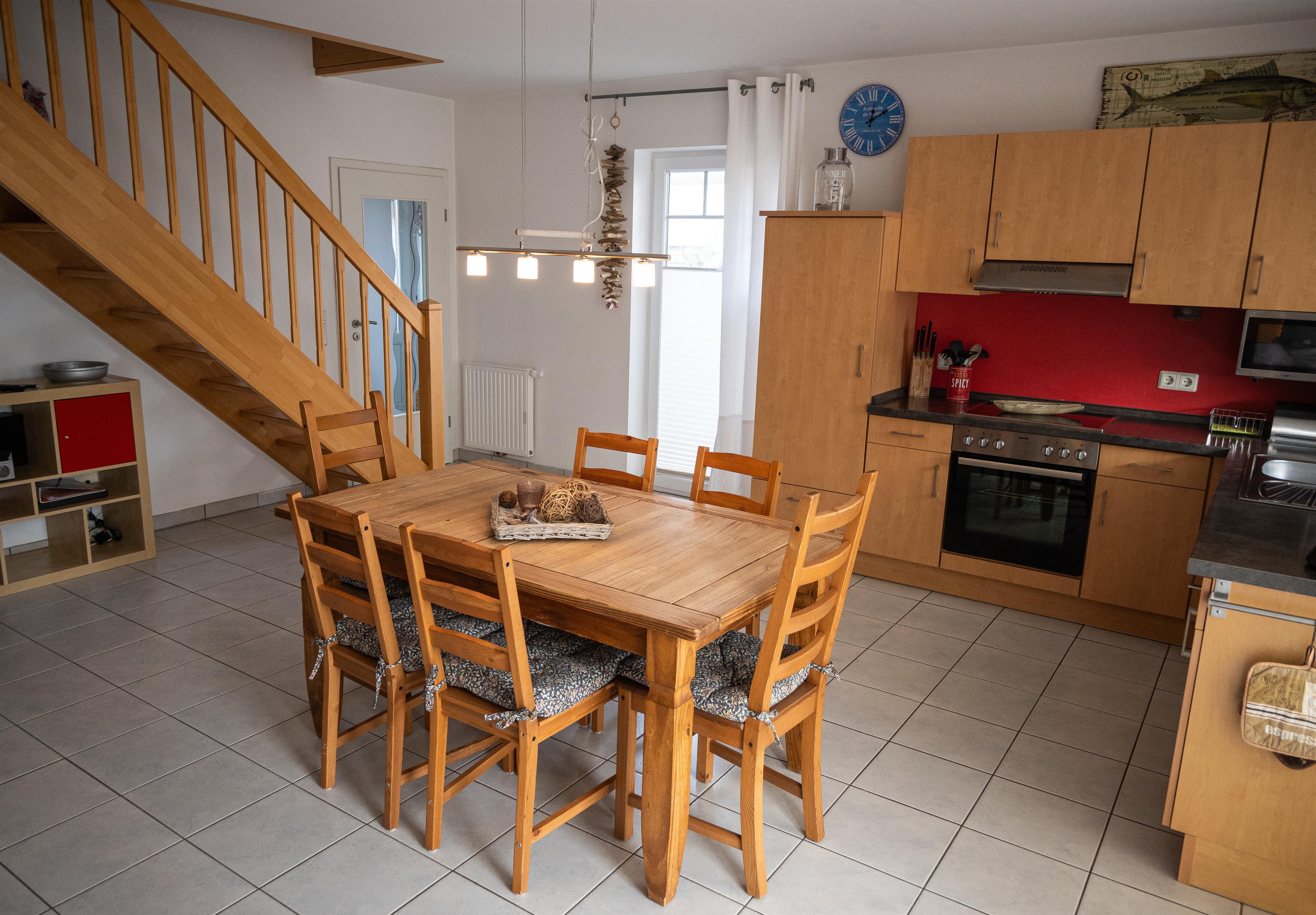 Im EG finden Sie den kombinierten Wohnraum mit einer großen modernen Einbauküche und einer Esstischgruppe, mit Platz für 6 Personen + 1 Kleinkind/Baby vor. Die Küche ist modern mit einem Cerankochfeld, Backofen, Mikrowelle und einem Kühlschrank mit Gefrierfach ausgestattet.