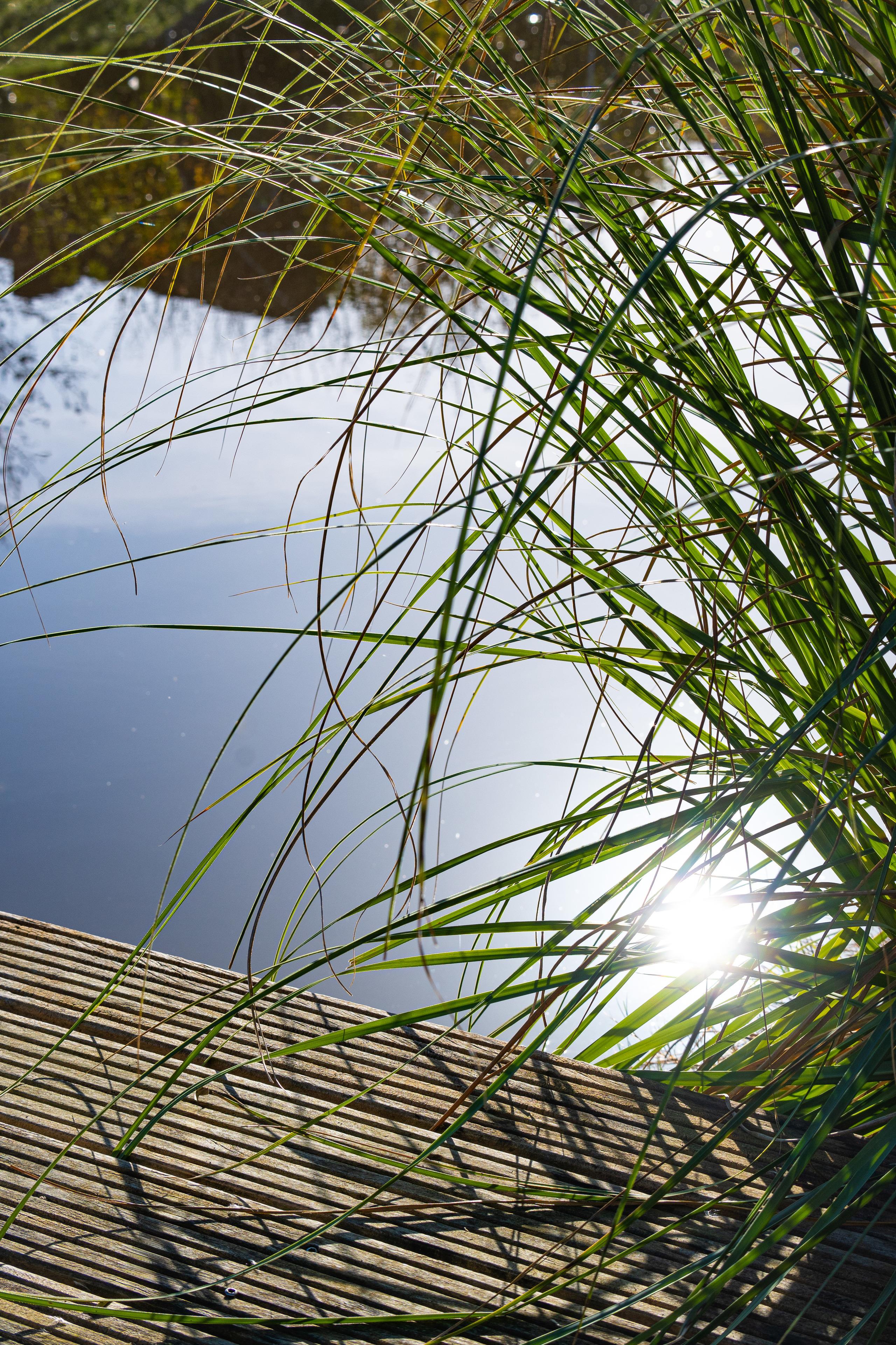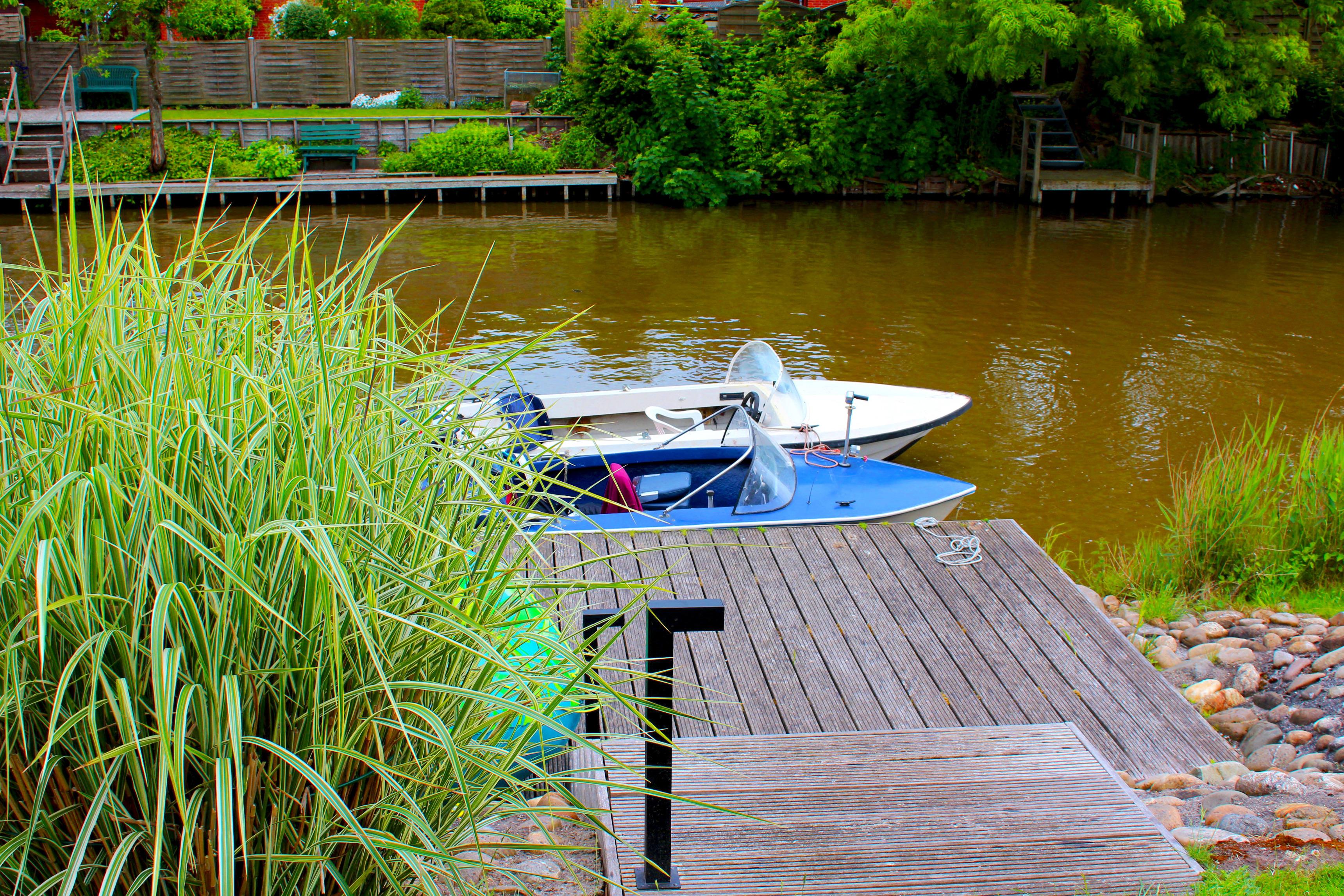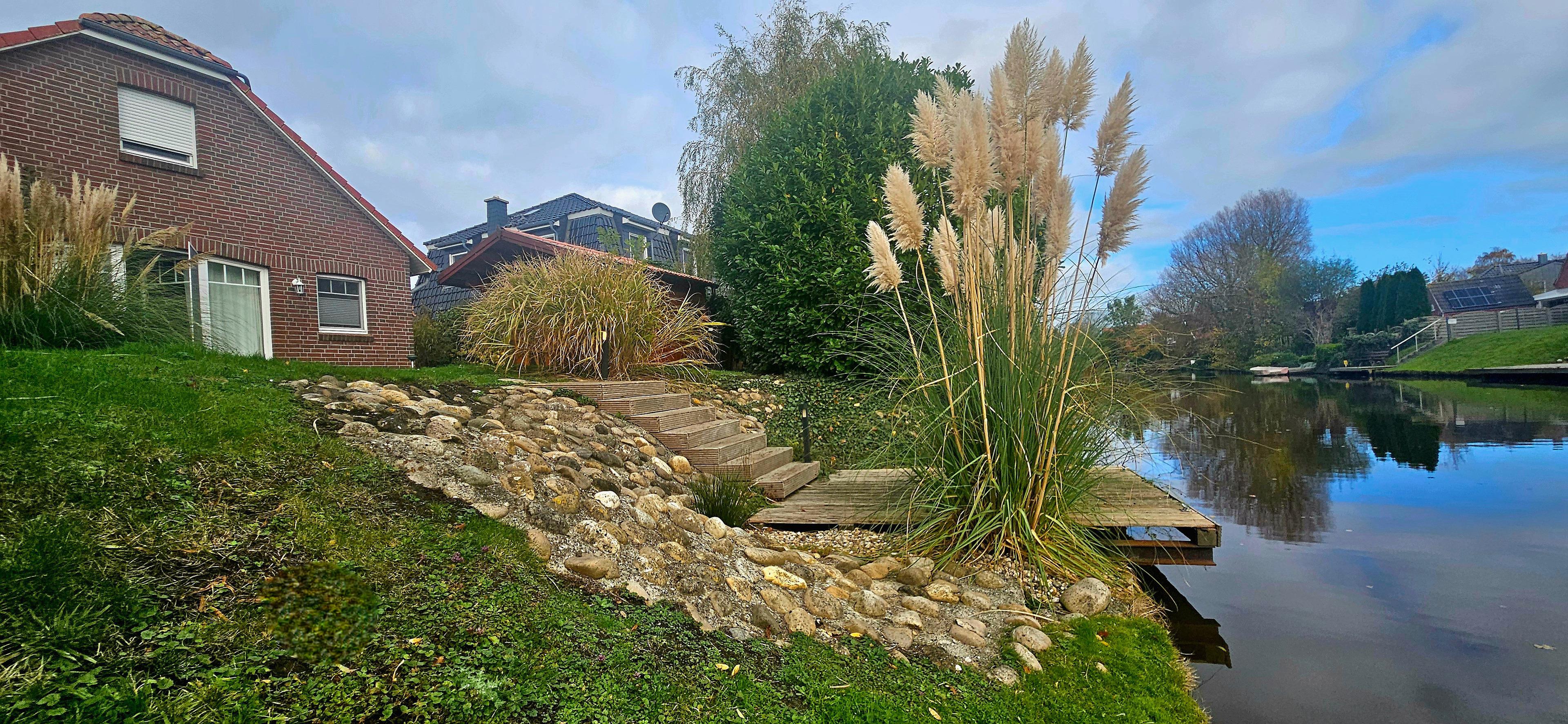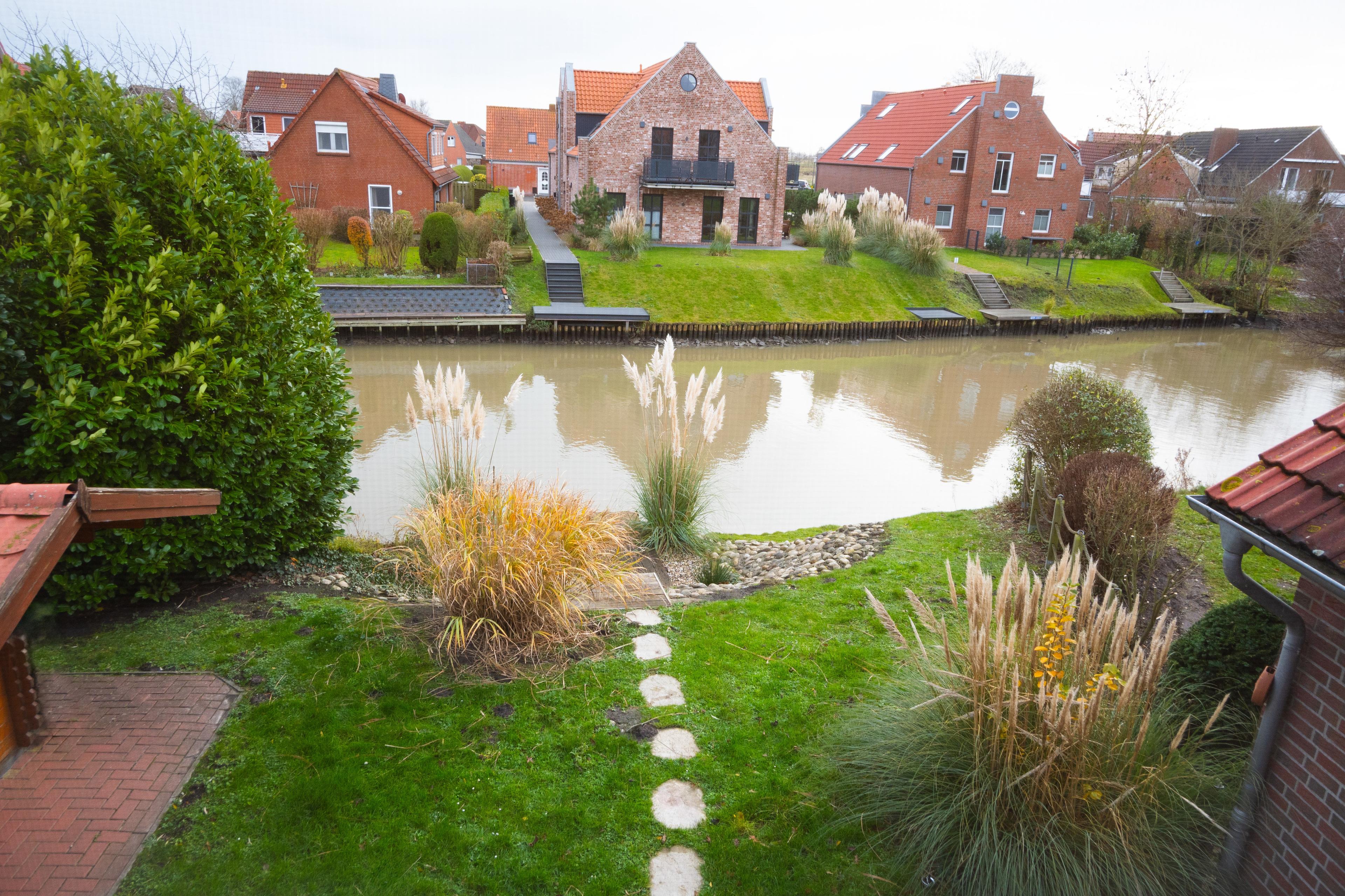 Durch das Panoramafenster im Wohnraum haben Sie den Garten mit Bootssteg, sowie die Grachten mit seinen "Skippern" bestens im Blick.