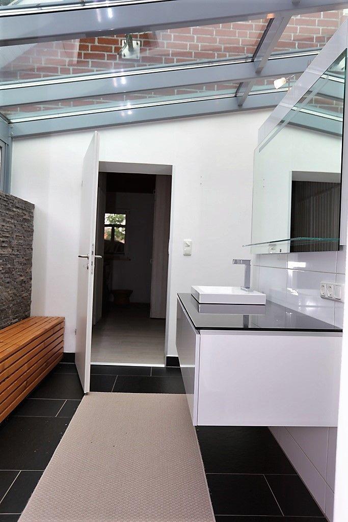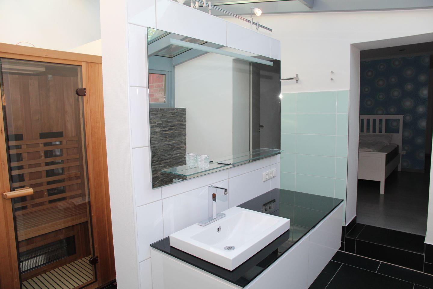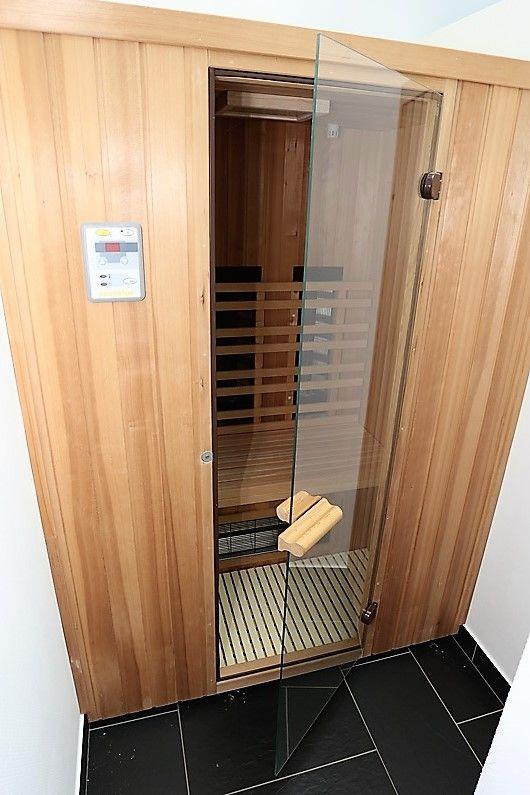 Im Masterbad erwarten Sie eine ebenerdige Regenwalddusche mit Fußbodenheizung und eine Infrarot-Wärmekabine. Das zweite Bad im Obergeschoss verfügt über Dusche und Eckbadewanne. Ein Waschtrockner ist im Hauswirtschaftsraum ebenfalls vorhanden.