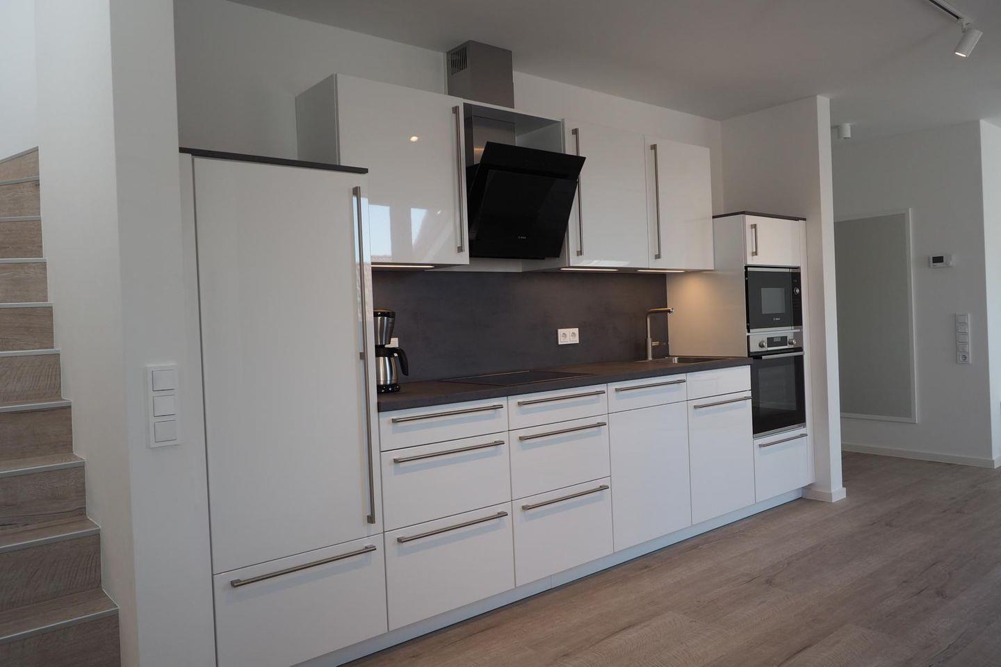 In der ersten Etage der Wohnung finden Sie den Wohnbereich mit Sofa und großem Fernseher (Smart-TV). Angrenzend befindet sich die hochwertige Einbauküche mit allen wichtigen Küchenutensilien und Geräten, wie bspw. Backofen, Herd, Mikrowelle, Kühlschrank mit Gefrierfach, Kaffeemaschine sowie ein Esstisch mit zwei bequemen Stühlen. Von hier aus können Sie auch auf die großzügige Loggia (Balkon) in Süd-West-Ausrichtung mit klappbaren Gartenmöbeln hinaustreten.