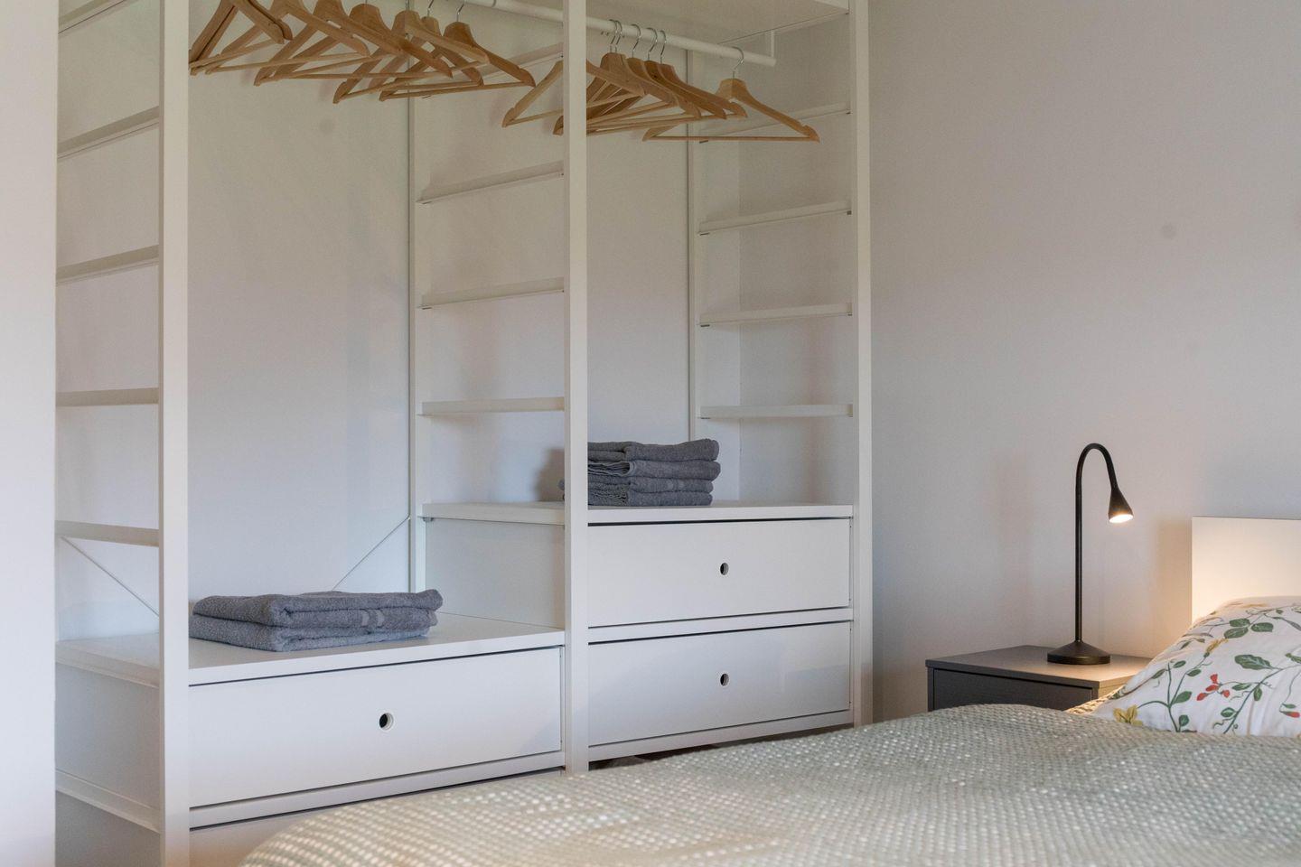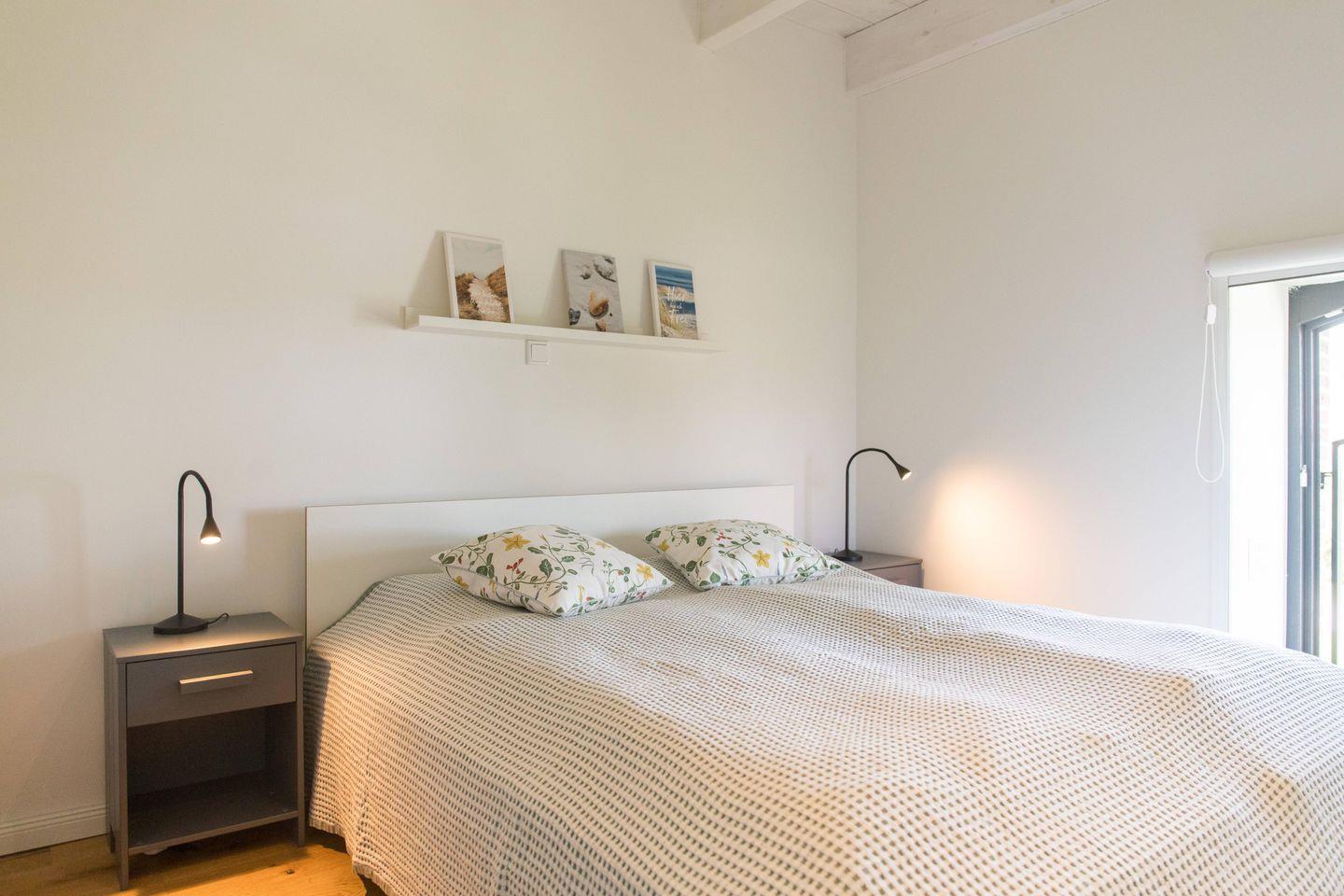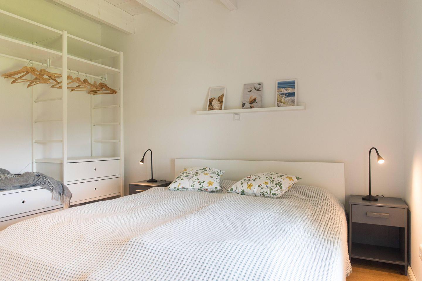 Das Obergeschoss verfügt über zwei geschmackvoll eingerichtete Schlafzimmer. Das Elternschlafzimmer verfügt über ein bequemes Doppelbett sowie einen ausreichenden Kleiderschrank. Im Kinderzimmer stehen bei Bedarf bis zu vier Schlafmöglichkeiten (inkl. zweier Stapelbetten) sowie eine Kommode zur Verfügung. Beide Schlafzimmer verfügen über Verdunklungsrollos. Das moderne Bad ist mit einer Badewanne, einer bodenebenen Dusche, WC und einer Handtuchheizung ausgestattet.