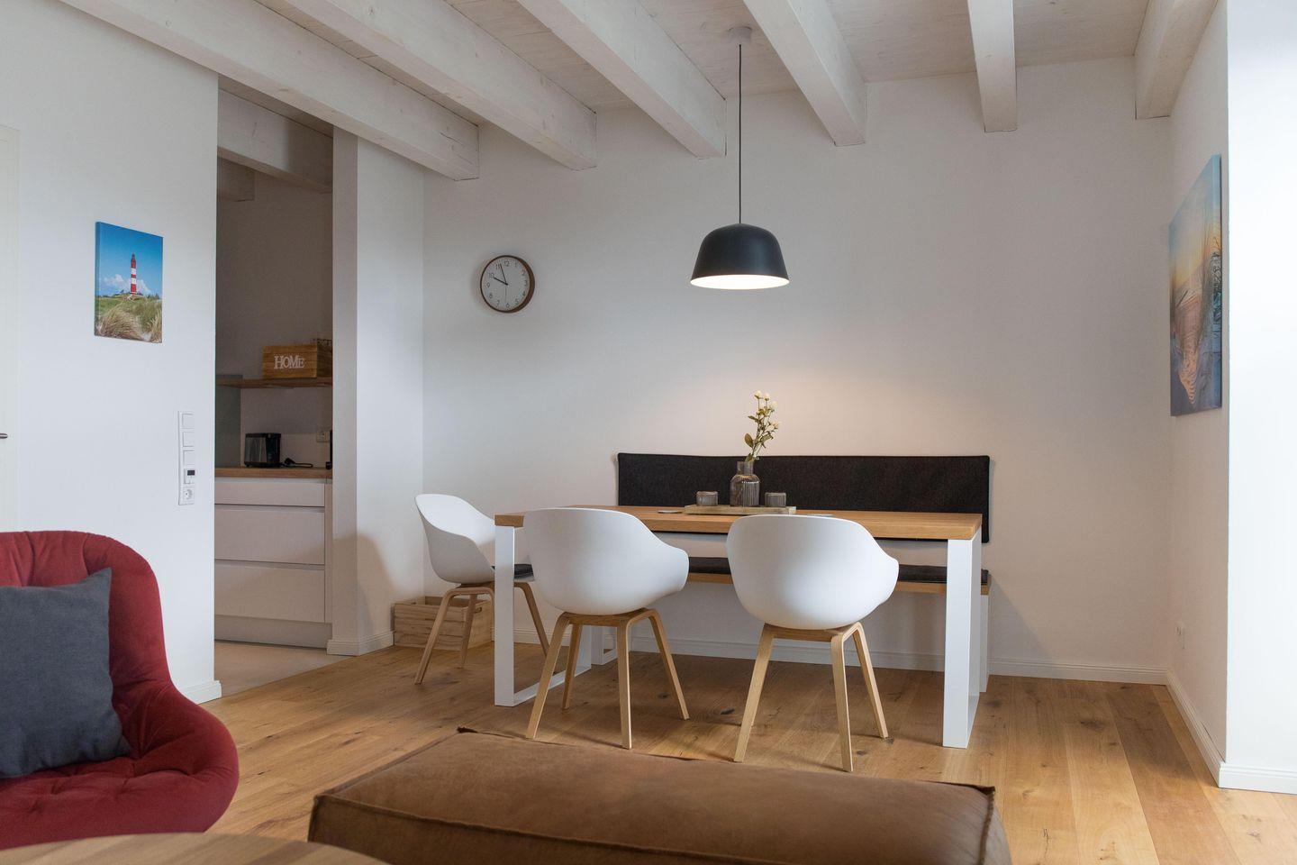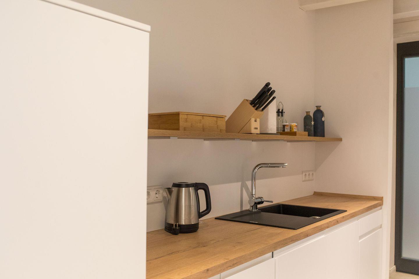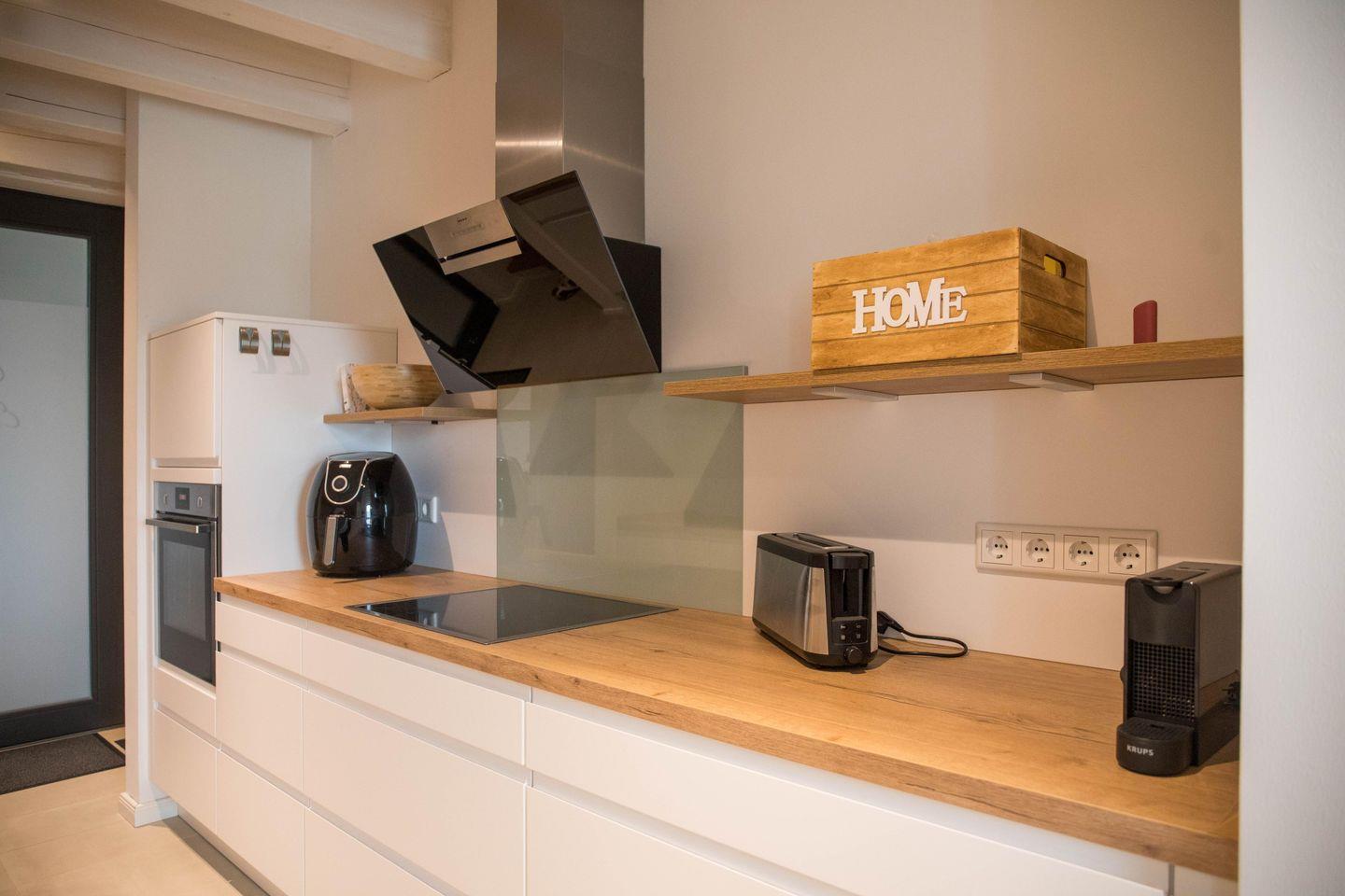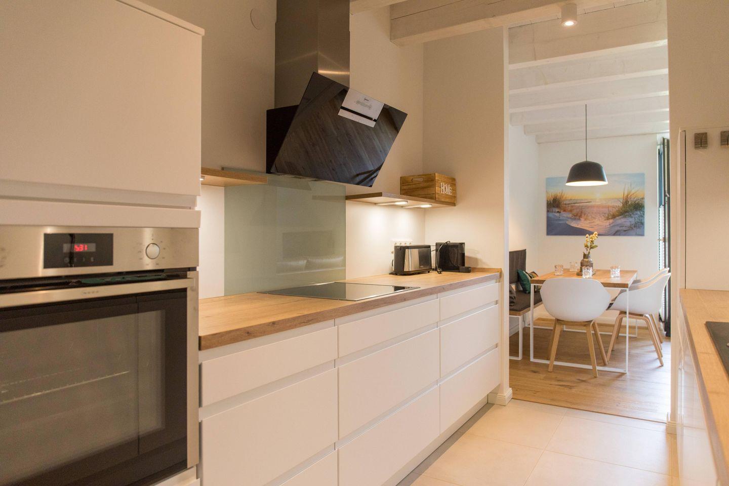 Die Wohnung verfügt über eine gut ausgestattete Küche im Eingangsbereich. Hier stehen Ihnen alle wesentlichen Küchenutensilien zur Verfügung, von der Induktionsherdplatte über eine moderne Espressomaschine bis hin zu einer Heißluftfritteuse.
