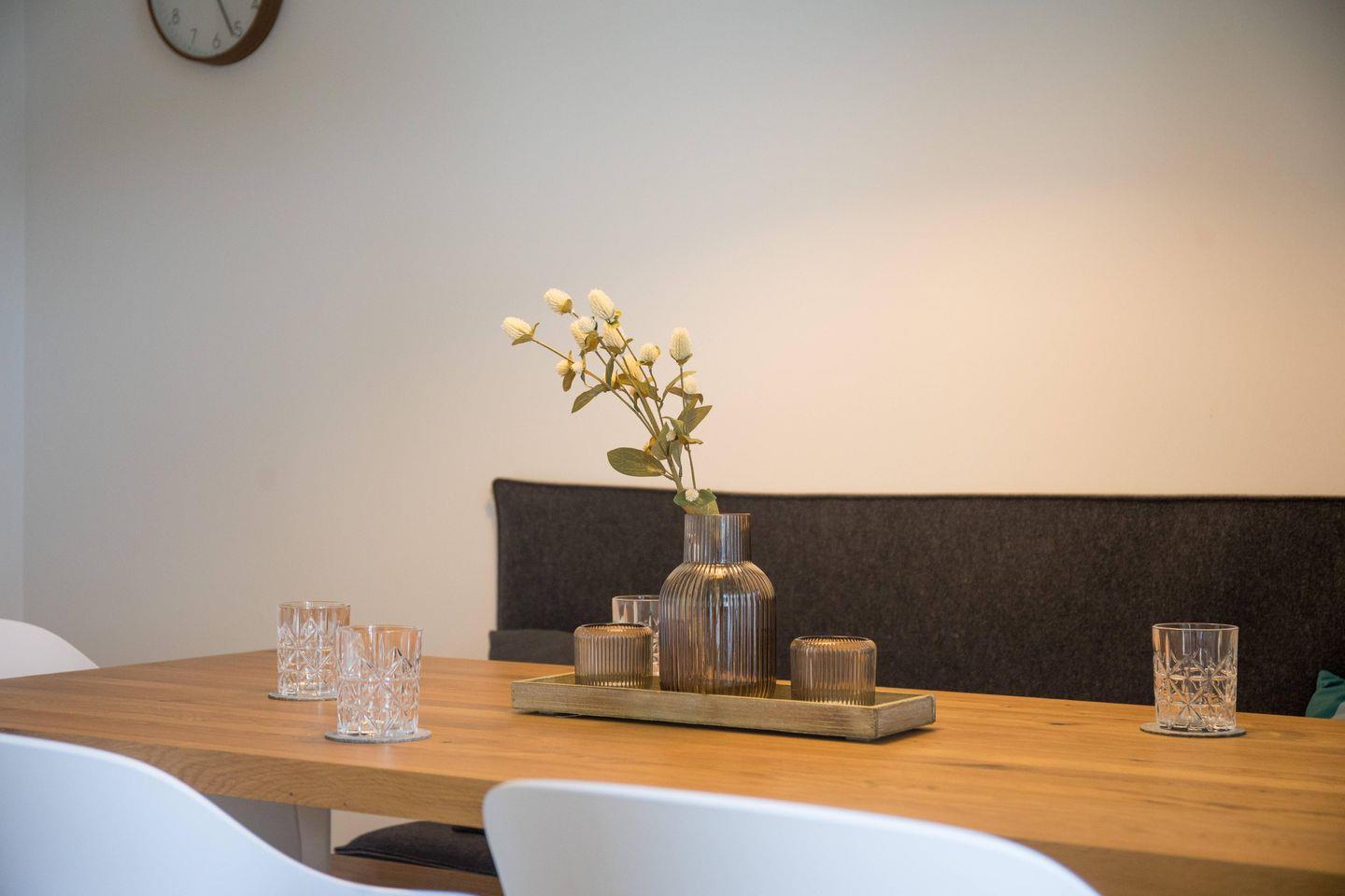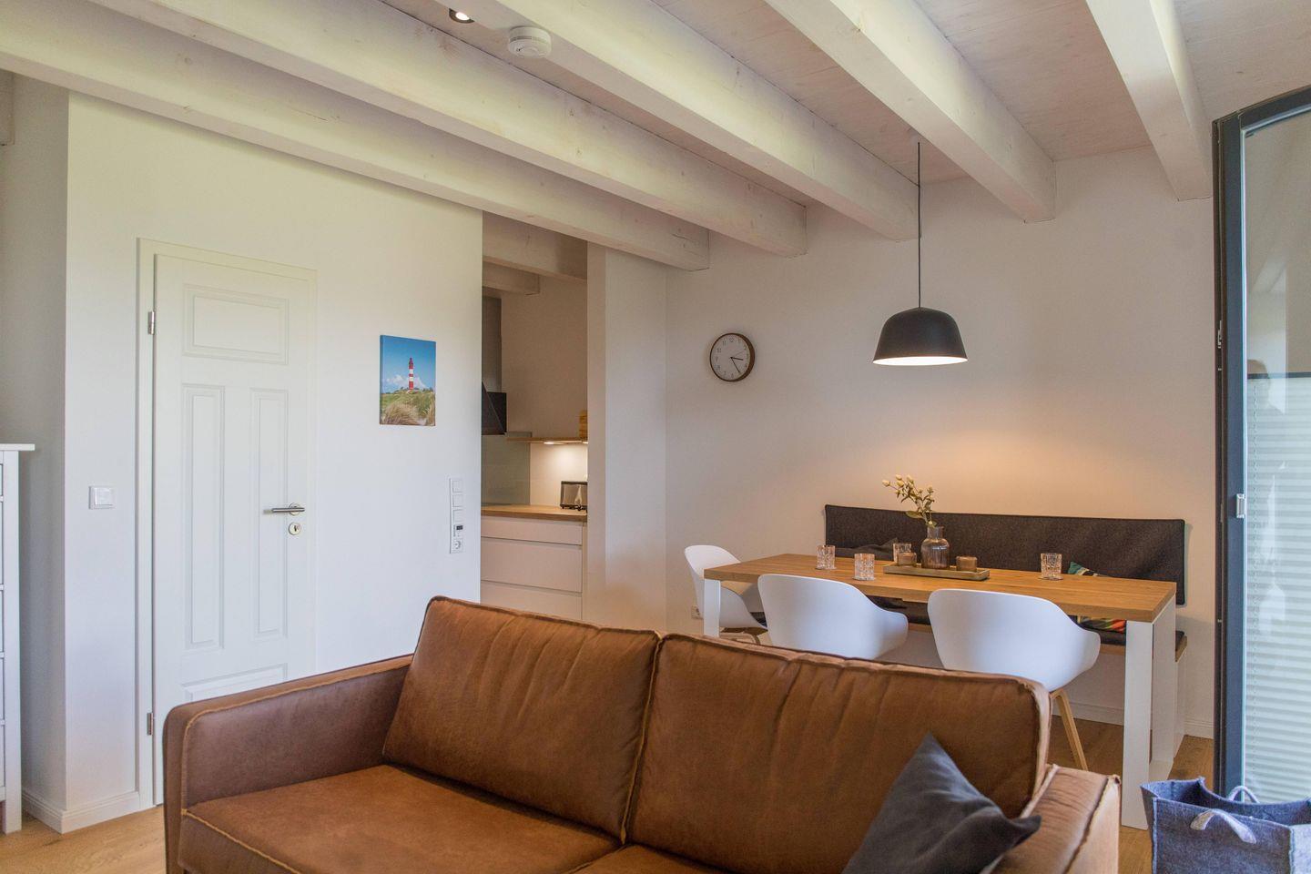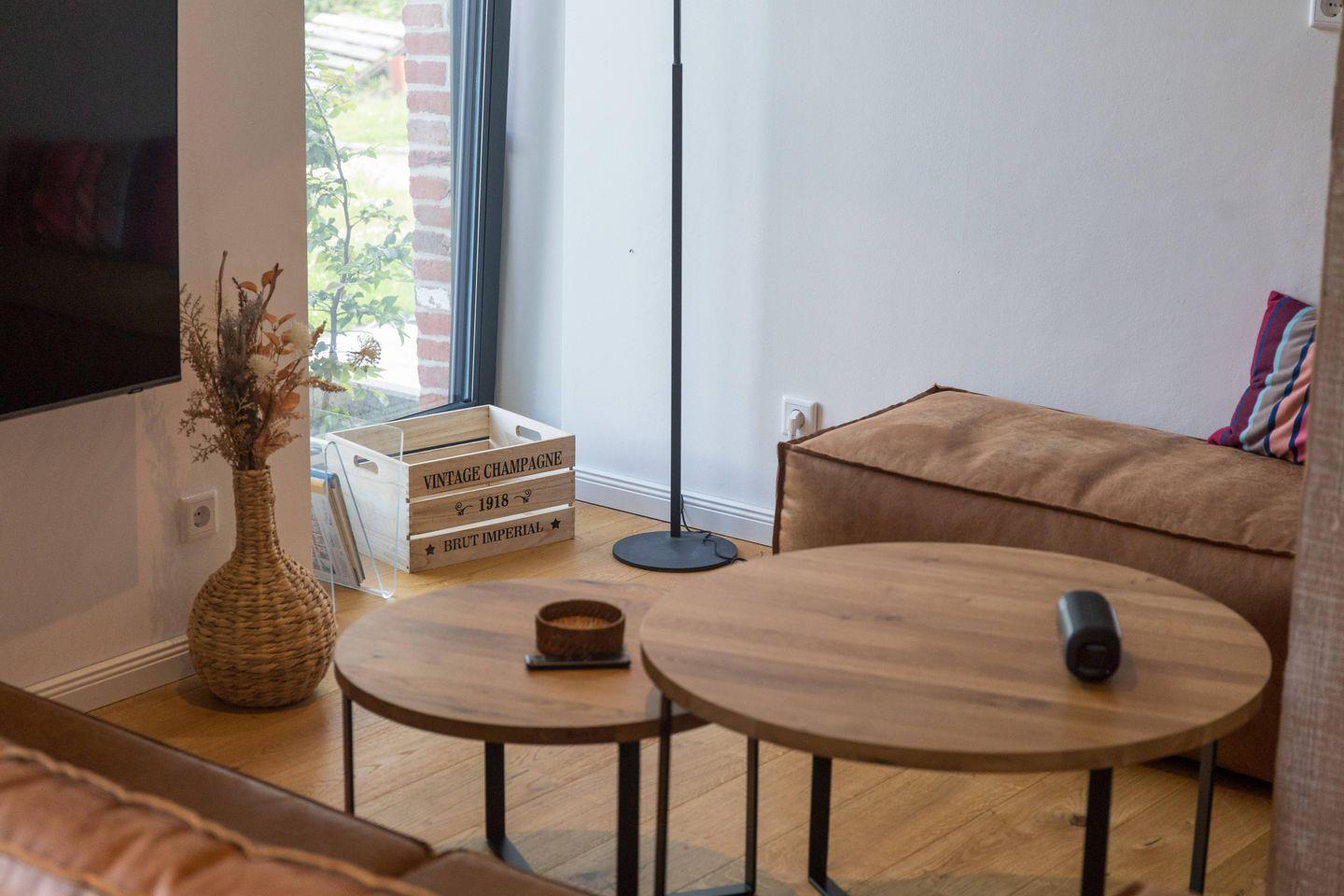 Von der Küche gelangt man in das großzügige Wohn- und Esszimmer. Genießen Sie gemeinsame Mahlzeiten im Essbereich oder entspannen Sie einfach auf dem bequemen Sofa im Wohnzimmer, während Sie den 50 Zoll großen QLED-Fernseher nutzen. Für die kleinen Gäste steht ein Kinderhochstuhl zur Verfügung. Für zusätzlichen Komfort sorgt die Fußbodenheizung, die für eine wohlige Atmosphäre selbst an kühlen Tagen sorgt. Zudem sind im Erdgeschoss ein Gäste-WC und ein Abstellraum vorhanden.