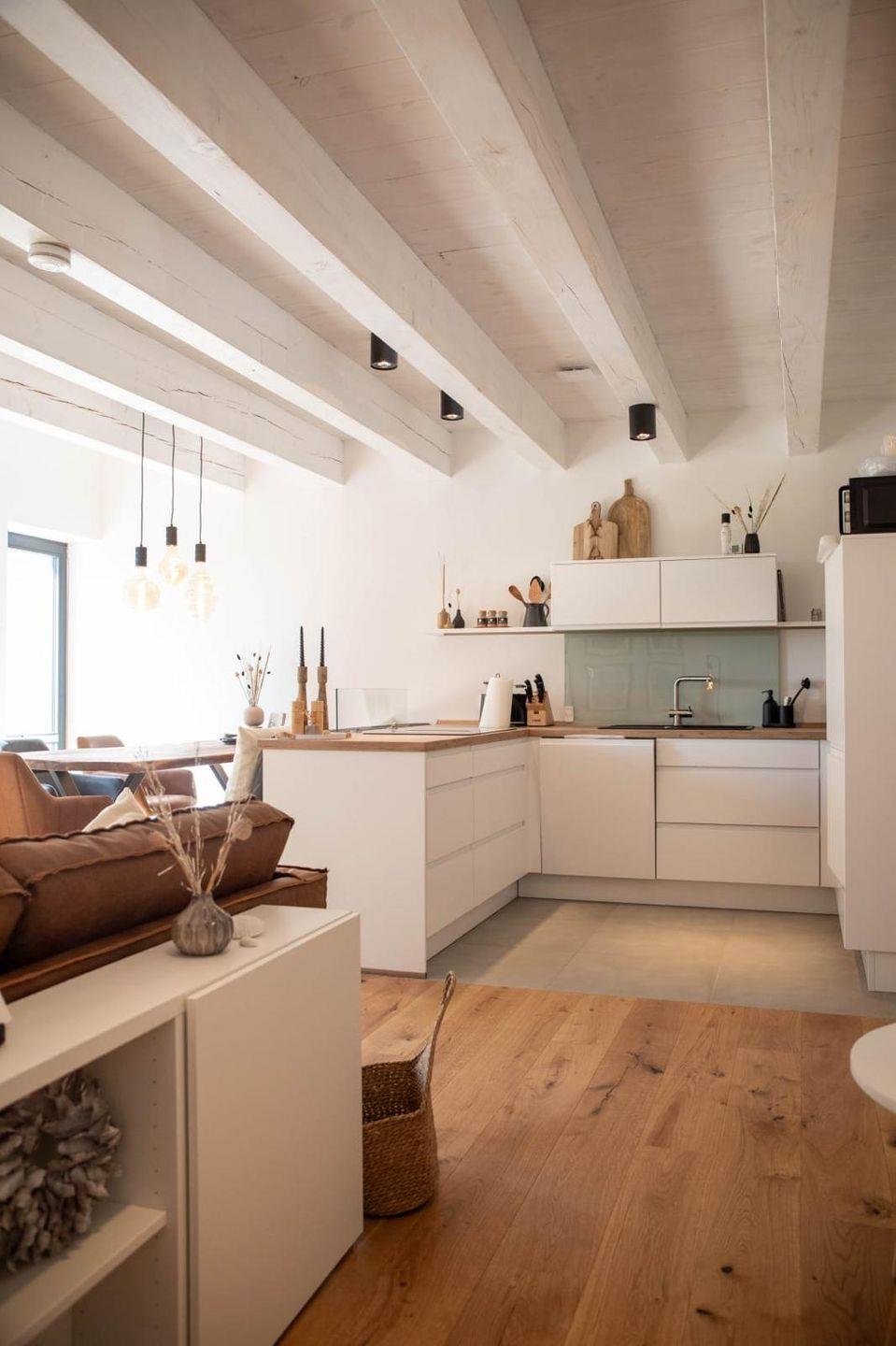 Im Erdgeschoss der Wohnung befindet sich ein großzügiger Wohn- Essbereich mit offener Küche sowie ein voll ausgestattetes Bad mit Dusche/WC, eine Abstellkammer und eine Garderoben-Nische, die sich harmonisch zwischen einen denkmalgeschützten Balken und der Wohnungstüre einfügt.