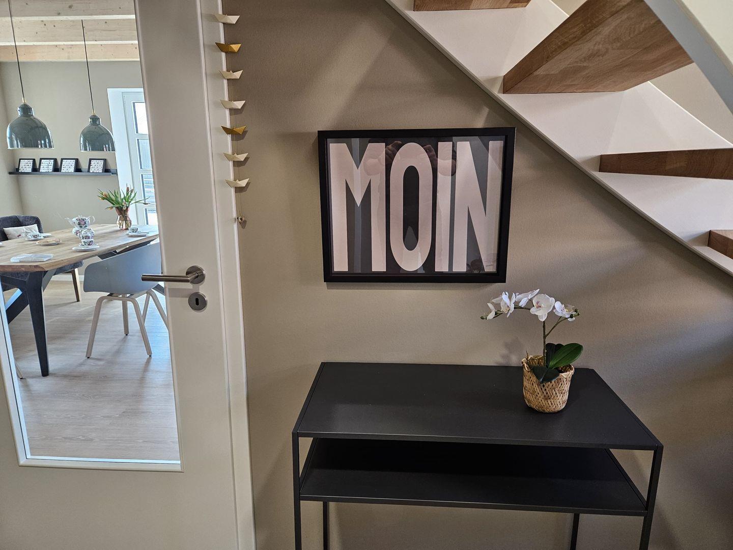 Das großzügige Zuhause erstreckt sich über zwei Etagen und ist mit allem ausgestattet, was Sie für einen komfortablen Aufenthalt benötigen. Die helle und offene Küche, die nahtlos in den Wohnbereich übergeht, ist modern gestaltet und verfügt über alle notwendigen Utensilien, um Ihre Lieblingsgerichte zuzubereiten. Hier finden Sie einen Backofen, ein 4-Platten-Induktionskochfeld, eine Spülmaschine sowie eine Espressomaschine. Der Esstisch bietet genug Platz für gemeinsame Mahlzeiten und gesellige Abende.