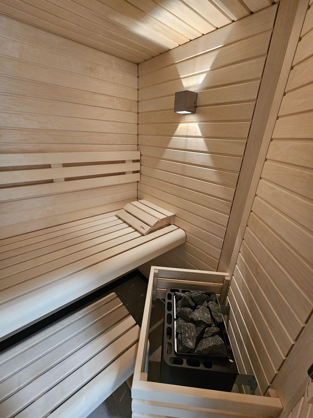 Im Wohnbereich laden eine bequeme Sitzecke, eine Sofaecke und ein Smart-TV zum Entspannen ein. Große Fenster sorgen für viel Tageslicht und eine einladende Atmosphäre. Die gesamte Einrichtung ist modern und geschmackvoll gewählt – ideal für einen Urlaub, der Luxus und Gemütlichkeit miteinander vereint. Genießen Sie entspannte Stunden in der hauseigenen Sauna - perfekt zum Abschalten nach einem ereignisreichen Urlaubstag.