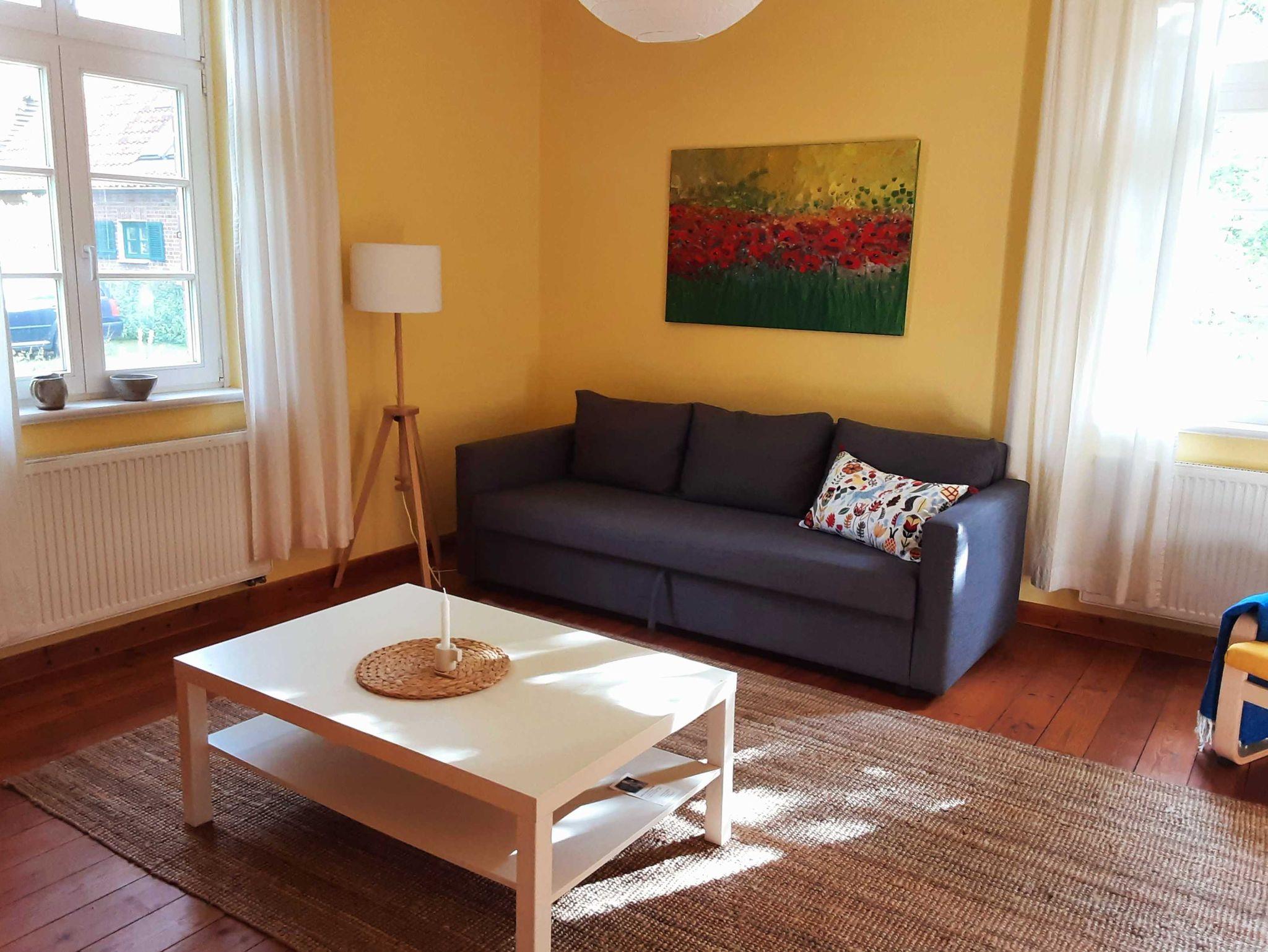 Sie bewohnen die untere Etage des Forsthauses. Bestehend aus 1 x Schlafzimmer mit Doppelbett, sehr großes teilbares Wohnzimmer mit 2 Schlafcouchen(Aufbettungsmöglichkeit je 2 Personen , belastbar bis max 120 kg),