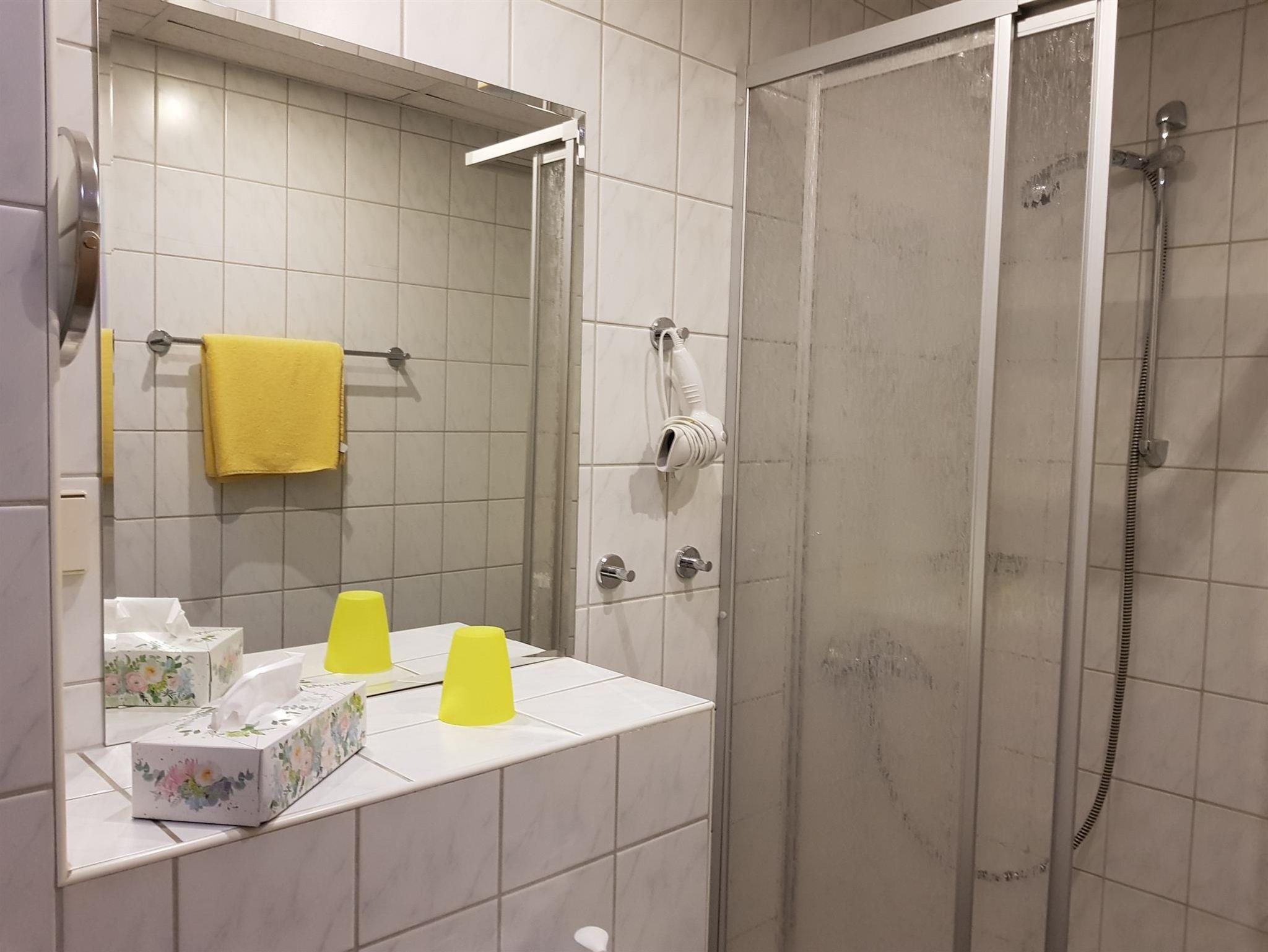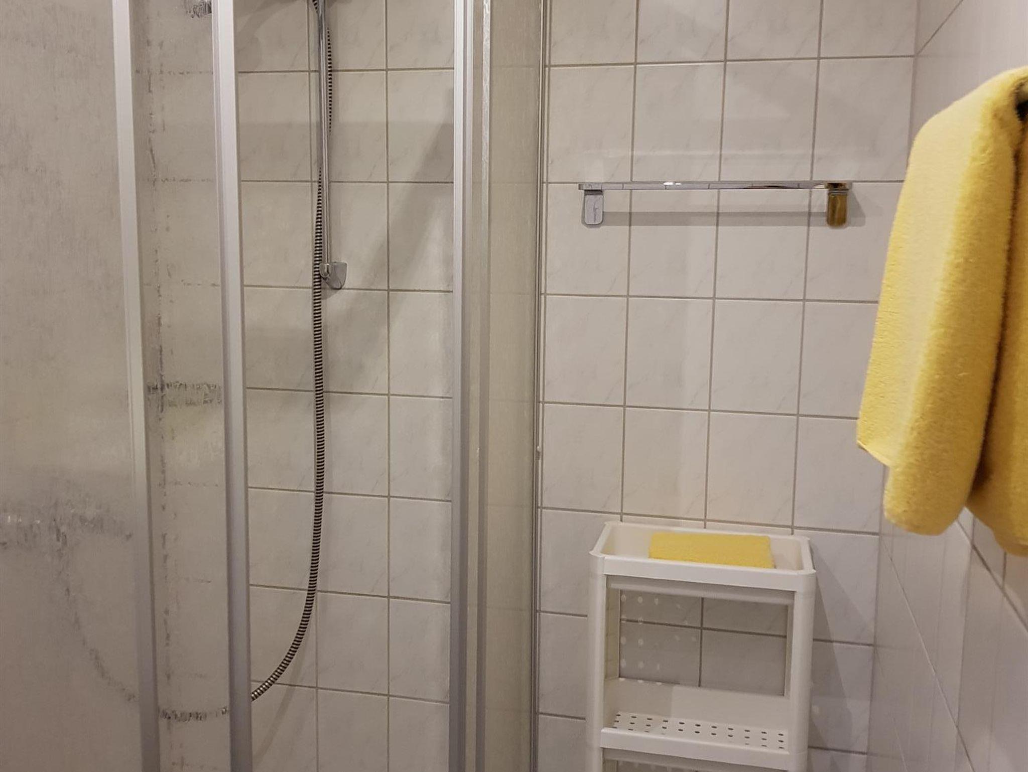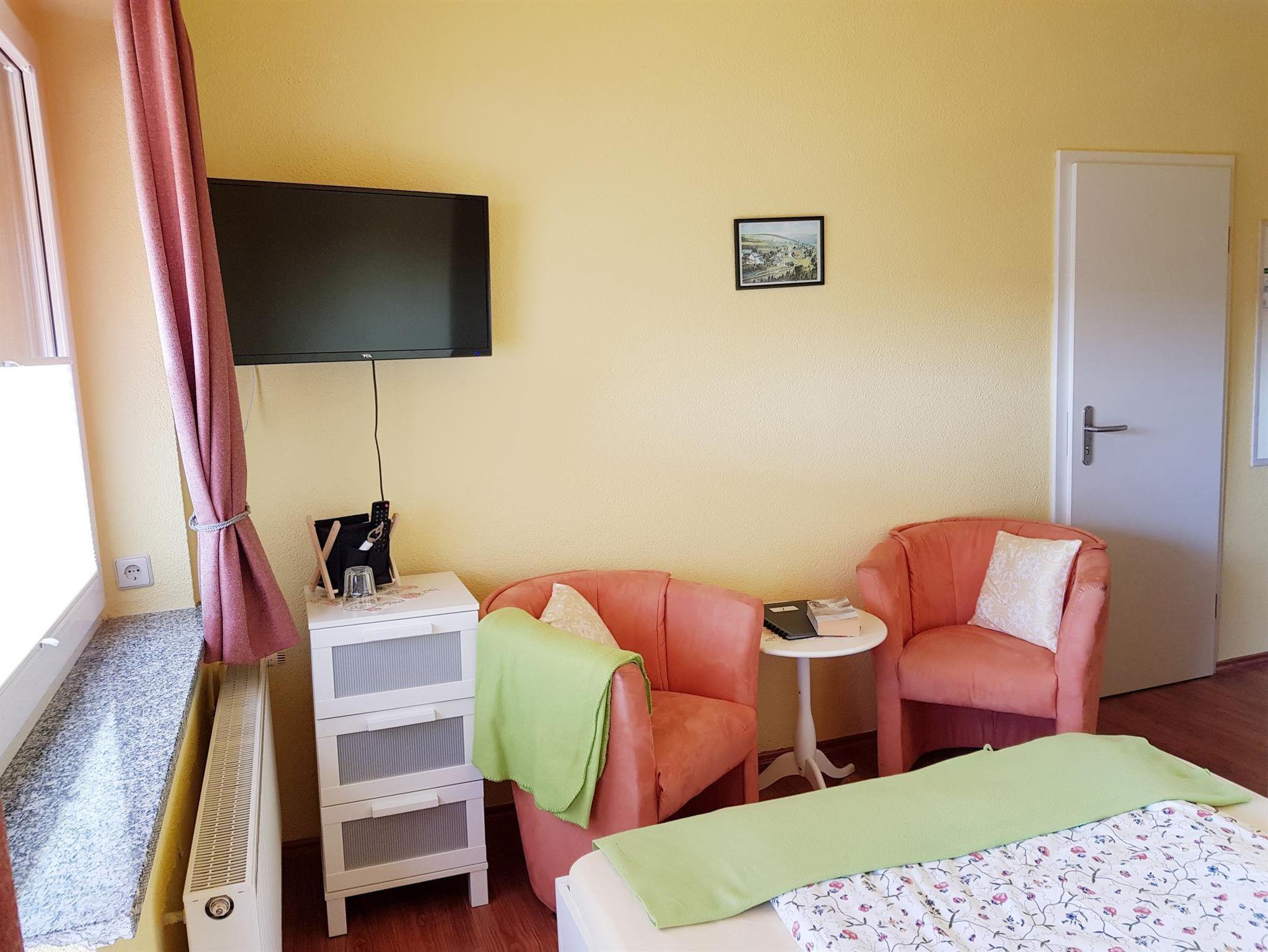 Das Familienzimmer (39 qm; erste Etage; hofseitig - ohne Bahnblick!) besteht aus zwei Räumen mit jeweils eigenen Bädern und zwei Zugängen zum Balkon. Durch eine abschließbare Verbindungstür wird das kleinere, 14 qm große Zimmer mit dem 1,40 m breiten, bezogenen Bett vom größeren Zimmer abgetrennt. Hier gibt es auch eine kleinen Kühlschrank. Im größeren der beiden Zimmer (Bettbreite: 1,80 m; Betten bezogen) befindet sich die Kochnische mit zwei Herdplatten, Kühlschrank mit Gefrierfach, Kaffeemaschine, Wasserkocher, Toaster, Geschirr, Kochgeschirr und Besteck. Es gibt einen ausziehbaren Esstisch mit zwei Stühlen und eine Sitzbank. In beiden Zimmern befinden sich ein Flachbild-TV, ein kleiner Tisch und zwei Sessel. In den Bädern gibt es Dusche/WC, Handtücher, Fön, Kosmetiktücher, Schminkspiegel und flüssige Handseife. Im Bad des größeren Zimmers gibt es zusätzlich noch einen Handtuchheizkörper.