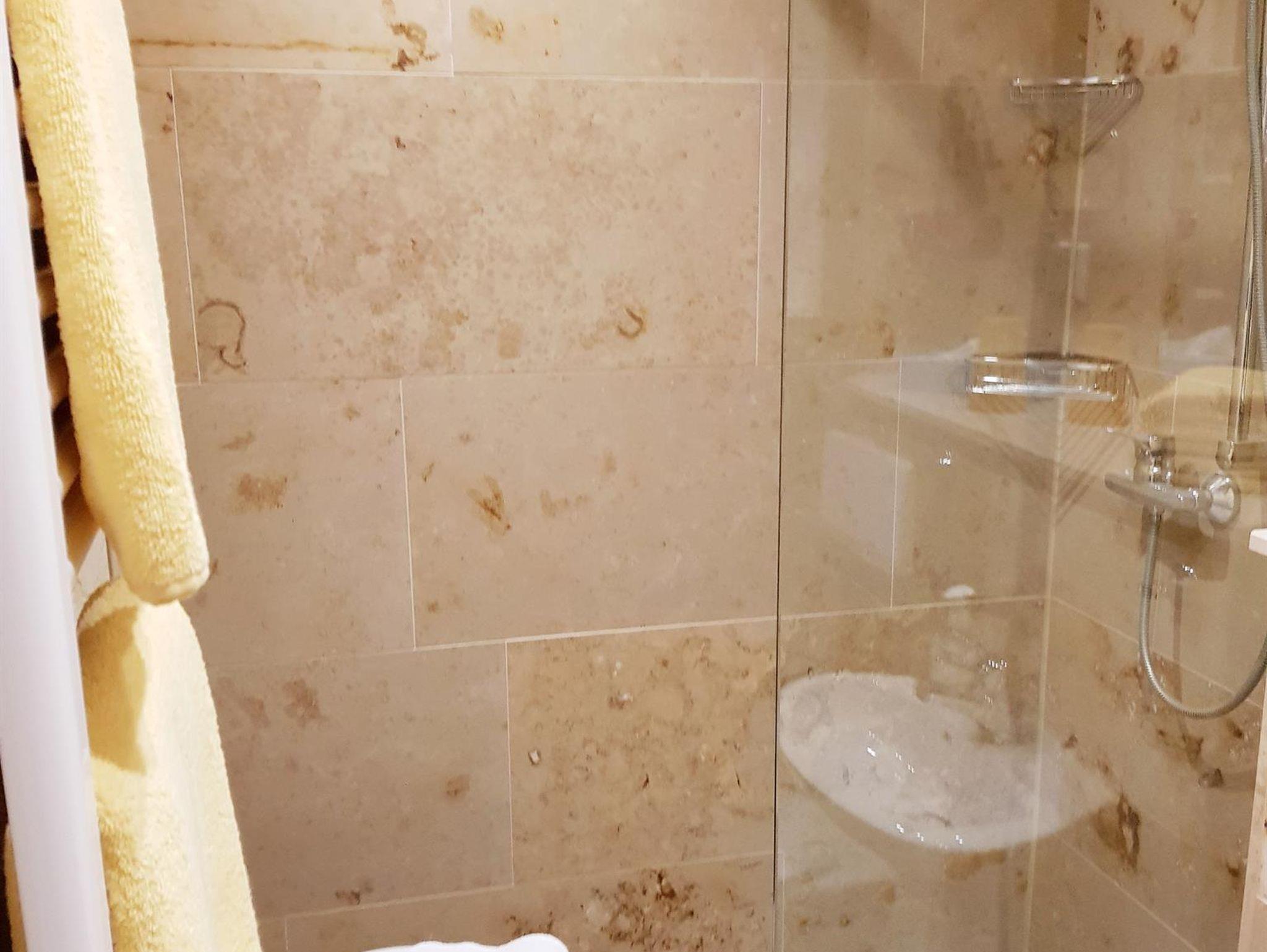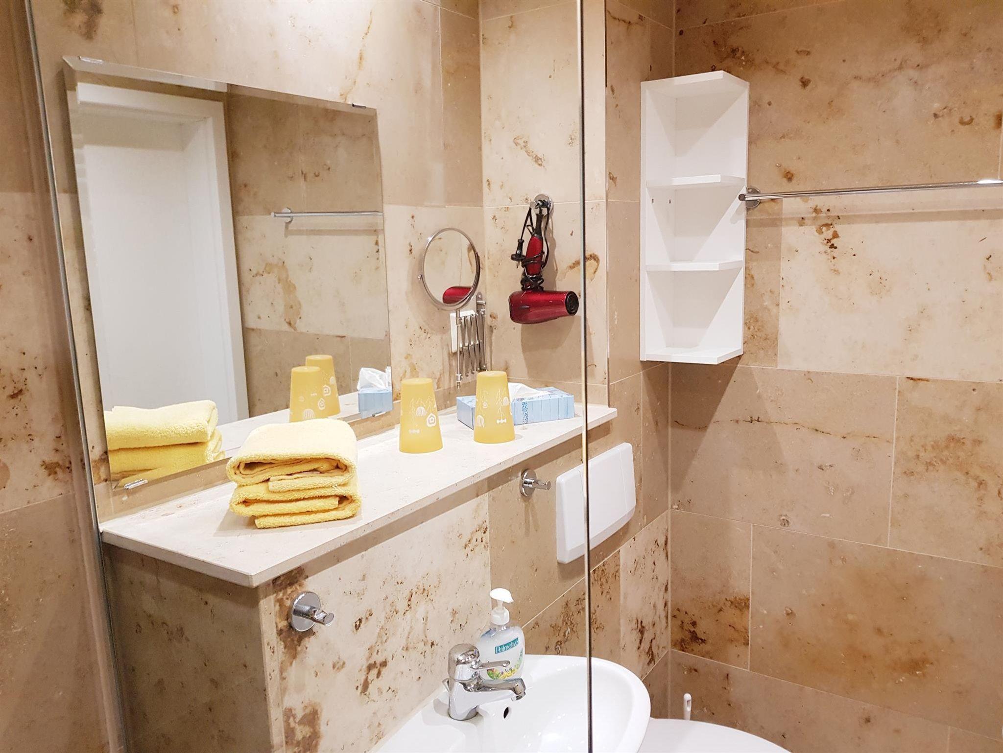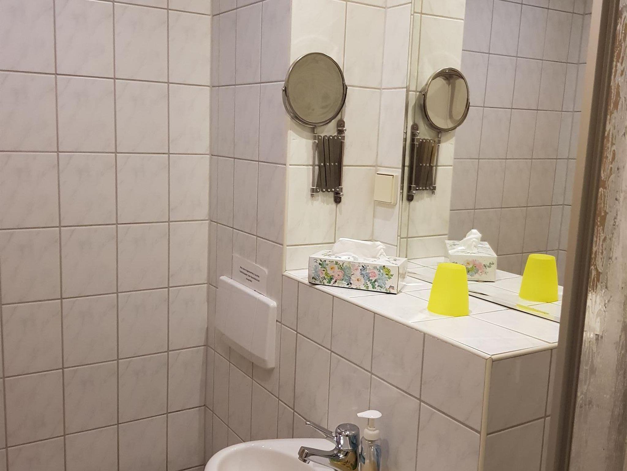 Das Familienzimmer (39 qm; erste Etage; hofseitig - ohne Bahnblick!) besteht aus zwei Räumen mit jeweils eigenen Bädern und zwei Zugängen zum Balkon. Durch eine abschließbare Verbindungstür wird das kleinere, 14 qm große Zimmer mit dem 1,40 m breiten, bezogenen Bett vom größeren Zimmer abgetrennt. Hier gibt es auch eine kleinen Kühlschrank. Im größeren der beiden Zimmer (Bettbreite: 1,80 m; Betten bezogen) befindet sich die Kochnische mit zwei Herdplatten, Kühlschrank mit Gefrierfach, Kaffeemaschine, Wasserkocher, Toaster, Geschirr, Kochgeschirr und Besteck. Es gibt einen ausziehbaren Esstisch mit zwei Stühlen und eine Sitzbank. In beiden Zimmern befinden sich ein Flachbild-TV, ein kleiner Tisch und zwei Sessel. In den Bädern gibt es Dusche/WC, Handtücher, Fön, Kosmetiktücher, Schminkspiegel und flüssige Handseife. Im Bad des größeren Zimmers gibt es zusätzlich noch einen Handtuchheizkörper.
