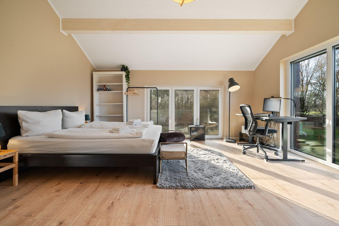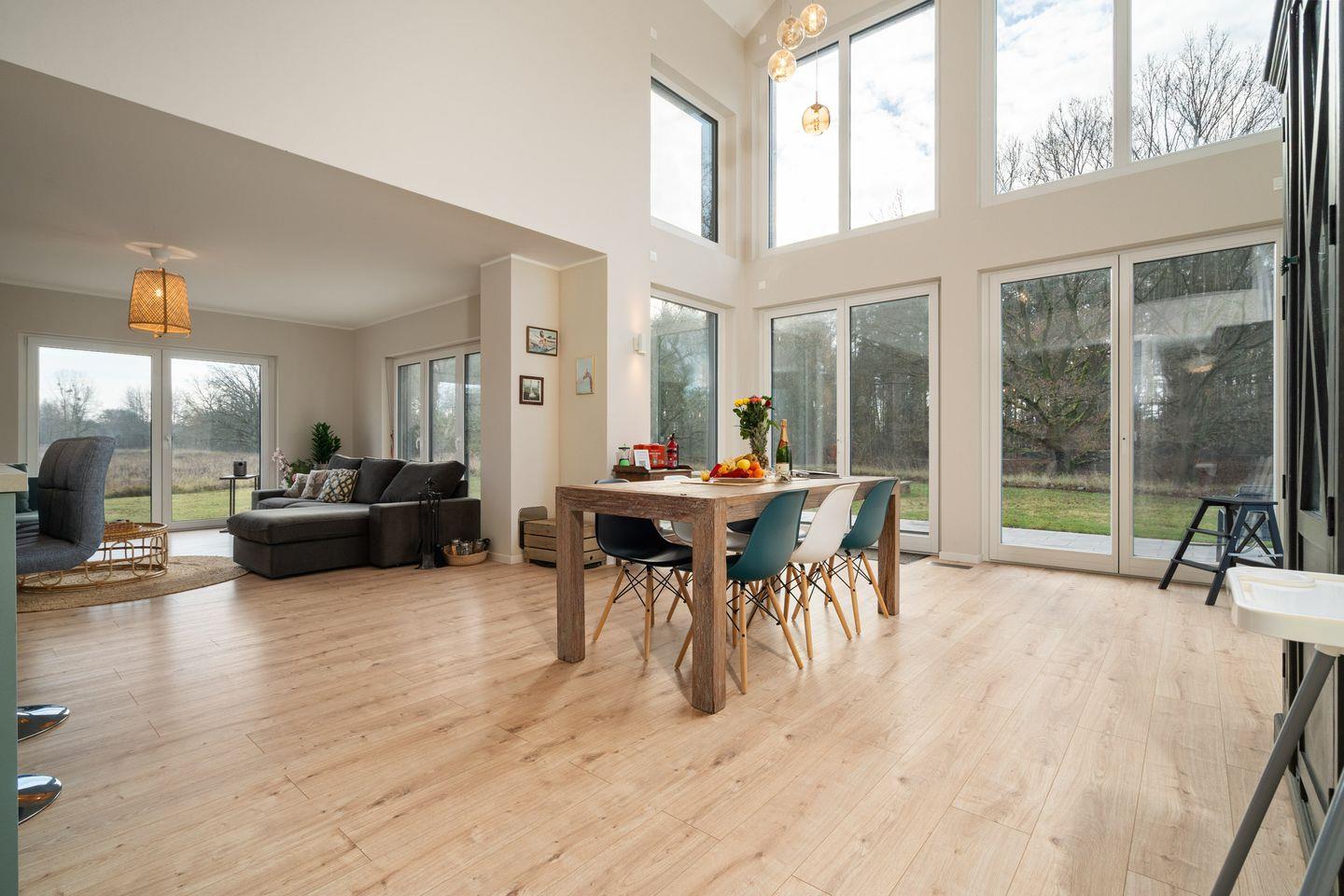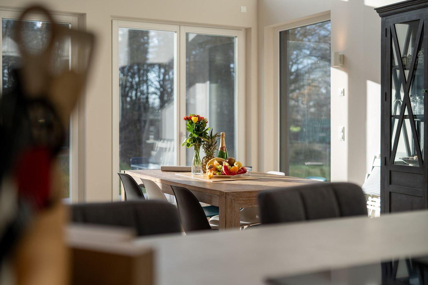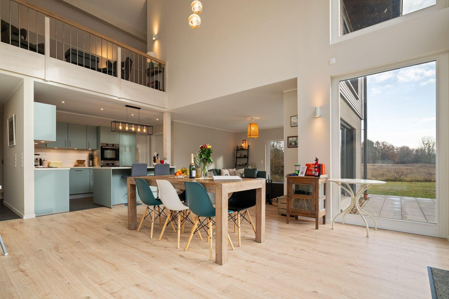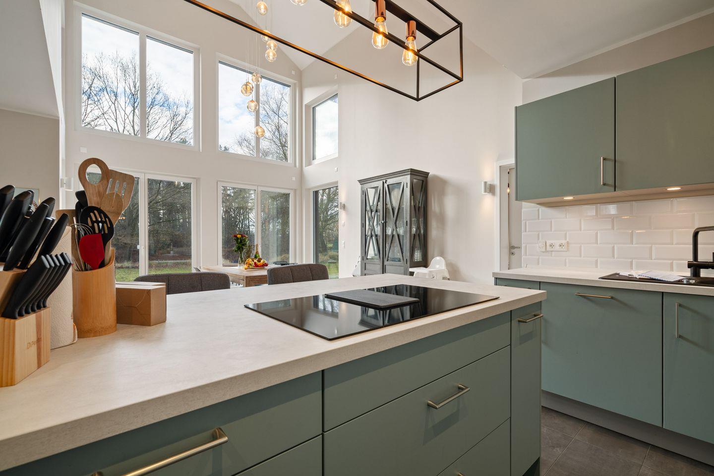 Das Herzstück des Hauses bildet der offene Wohnbereich mit einer modernen Sofaecke und gemütlichem Essbereich. Bodentiefe Fenster schaffen eine helle und freundliche Atmosphäre und eröffnen den Blick auf die umliegende Natur. Die offene, voll ausgestattete Küche, direkt angrenzend an das Wohnzimmer, ist hochwertig eingerichtet und umfasst unter anderem einen Induktionsherd, Backofen, Mikrowelle, extra Gefrierschrank, Kühlschrank, Geschirrspüler sowie umfangreiche Küchenutensilien, eine Küchenmaschine und einen Mixer. Für Kaffeeliebhaber stehen sowohl eine Kaffeemaschine als auch eine Nespresso-Espressomaschine bereit. Selbstverständlich sind Gewürze, Geschirr und Besteck sowie Reinigungsmittel vorhanden.