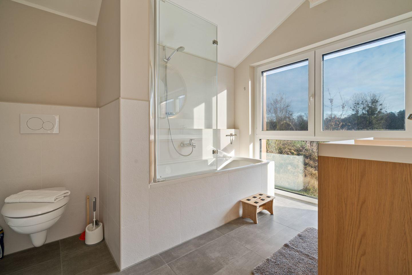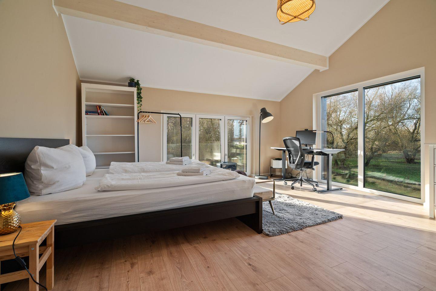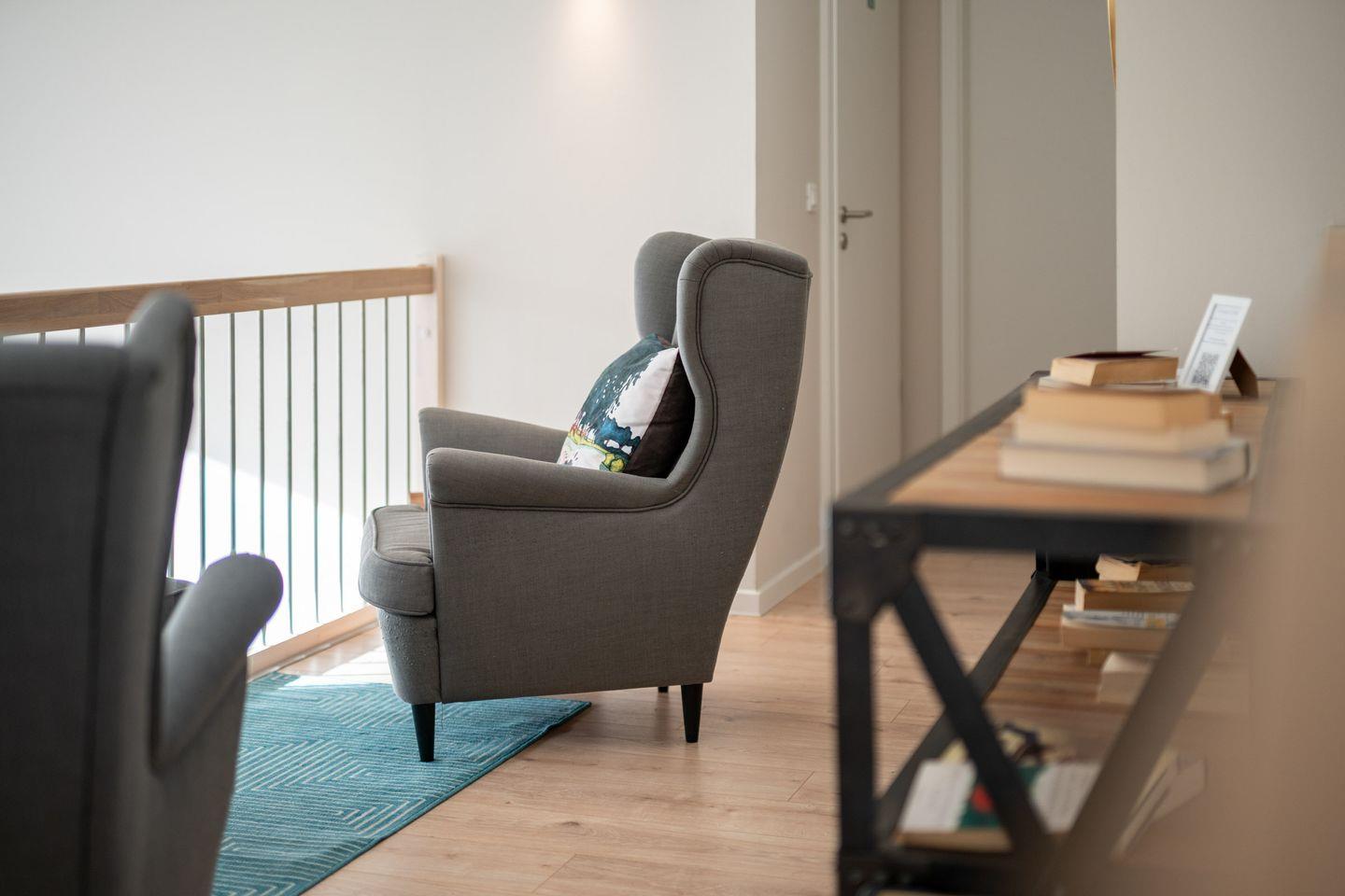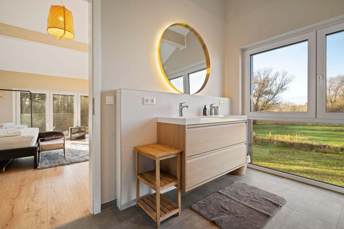 Das Herzstück des Hauses bildet der offene Wohnbereich mit einer modernen Sofaecke und gemütlichem Essbereich. Bodentiefe Fenster schaffen eine helle und freundliche Atmosphäre und eröffnen den Blick auf die umliegende Natur. Die offene, voll ausgestattete Küche, direkt angrenzend an das Wohnzimmer, ist hochwertig eingerichtet und umfasst unter anderem einen Induktionsherd, Backofen, Mikrowelle, extra Gefrierschrank, Kühlschrank, Geschirrspüler sowie umfangreiche Küchenutensilien, eine Küchenmaschine und einen Mixer. Für Kaffeeliebhaber stehen sowohl eine Kaffeemaschine als auch eine Nespresso-Espressomaschine bereit. Selbstverständlich sind Gewürze, Geschirr und Besteck sowie Reinigungsmittel vorhanden.
