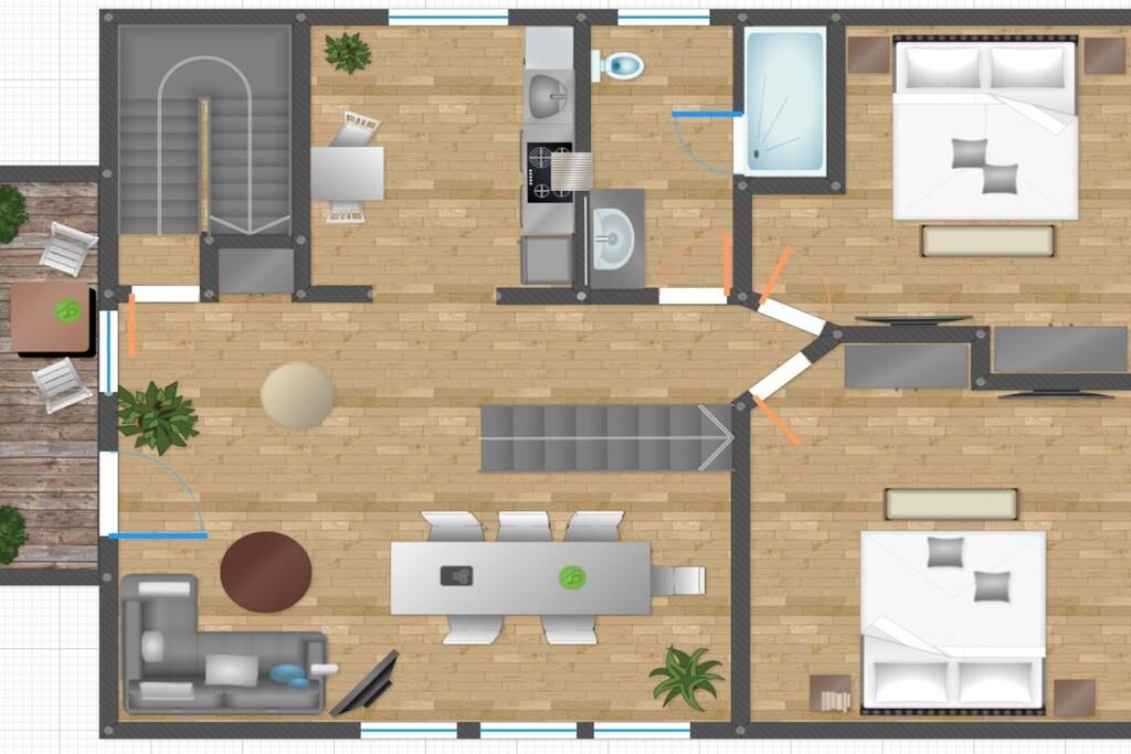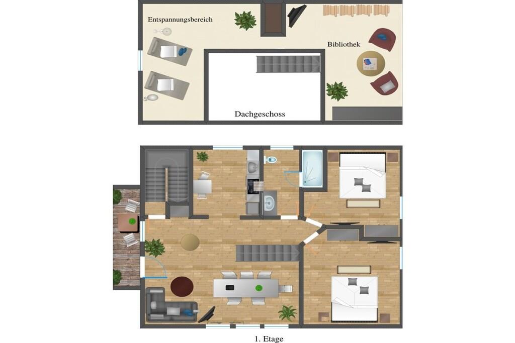 Loft: (bibliotek(bibliotek)) , , Stue(enkeltsovesofa, Fjernsyn), spisestue(Fjernsyn, spisebord), Køkken(kogeplade, komfur, ovn, opvaskemaskine , køleskab), soveværelse(, , dobbeltseng, dobbeltseng, Fjernsyn), soveværelse(, , dobbeltseng, dobbeltseng, Fjernsyn), badeværelse(, toilet, bruser, håndvask), Internetadgang, Internetadgang, balkon(havemøbler), varme, parkering