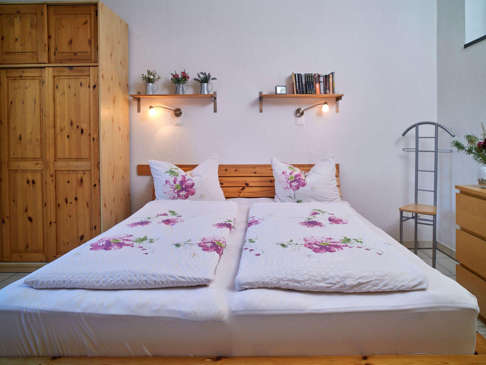Die barrierefreie Ferienwohnung bietet dir auf 50 qm alles, was du für einen entspannten Aufenthalt zu zweit oder als kleine Gruppe brauchst. Im Schlafzimmer wartet ein großes Doppelbett, im Wohnbereich zwei gemütliche Sofas, die sich bei Bedarf auch als Aufbettung eignen.