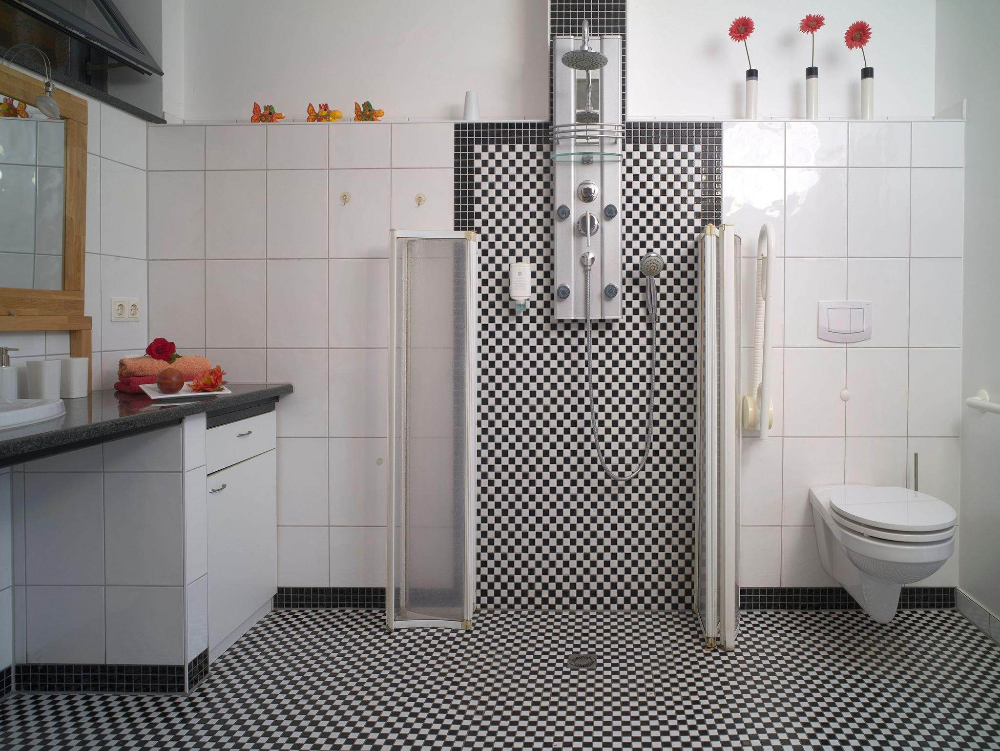 Das Bad ist komplett barrierefrei ? mit schwellenloser Dusche, Haltegriffen am WC und unterfahrbarem Waschtisch.